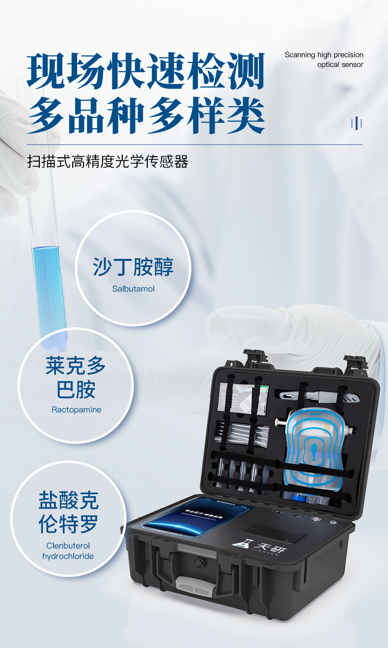 瘦肉精檢測儀可現(xiàn)場快速檢測鹽酸克倫特羅、萊克多巴胺、沙丁胺醇、己烯雌酚、喹乙醇等。儀器預(yù)留其他項目檢測程序和端口,根據(jù)日后需求可方便的自主增加檢測項目。日后可升級為檢測抗生素、獸藥殘留、動物疫病、病害肉、的綜合類型儀器