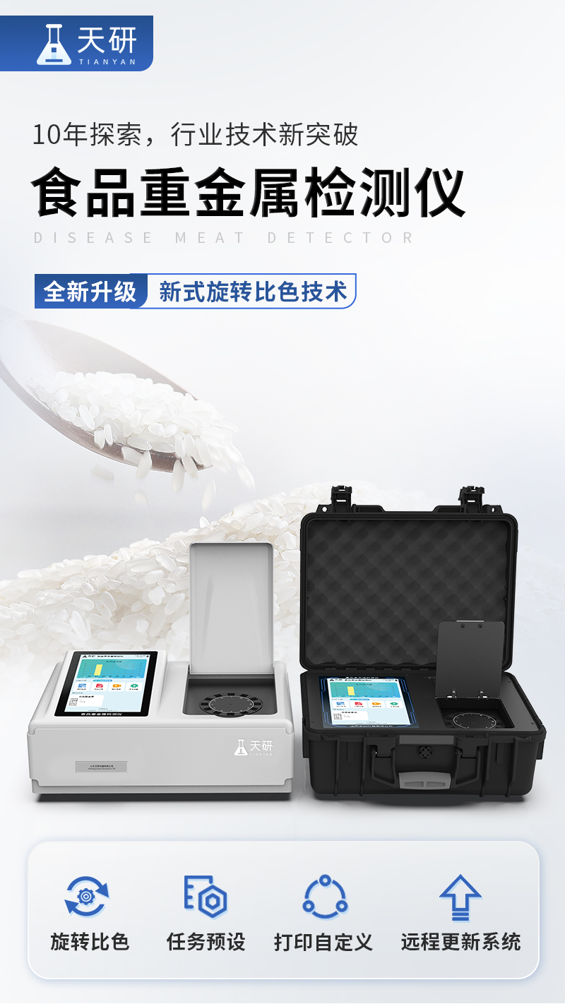 山東天研儀器有限公司生產(chǎn)的食品重金屬檢測(cè)儀為集成化食品安全快速檢測(cè)分析設(shè)備,采用手提箱一體化設(shè)計(jì),重金屬檢測(cè)儀可廣泛應(yīng)用于大米、糧谷、果品、蔬菜、藥材、水產(chǎn)品中重金屬鉛、鎘、六價(jià)鉻、汞、砷、鐵、鎳、鋁的快速檢測(cè),檢測(cè)項(xiàng)目可根據(jù)日后需求可進(jìn)行遠(yuǎn)程升級(jí)。