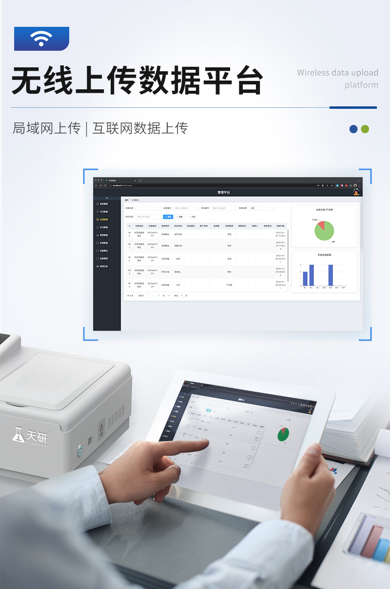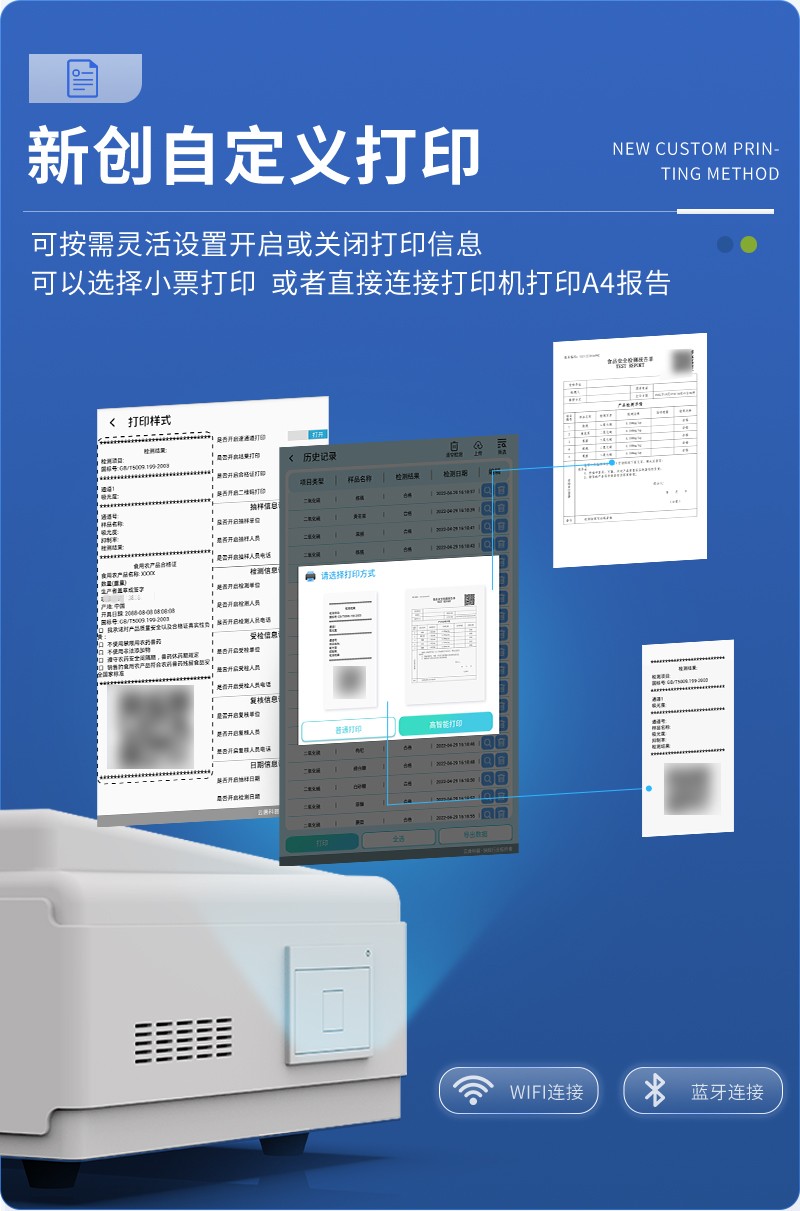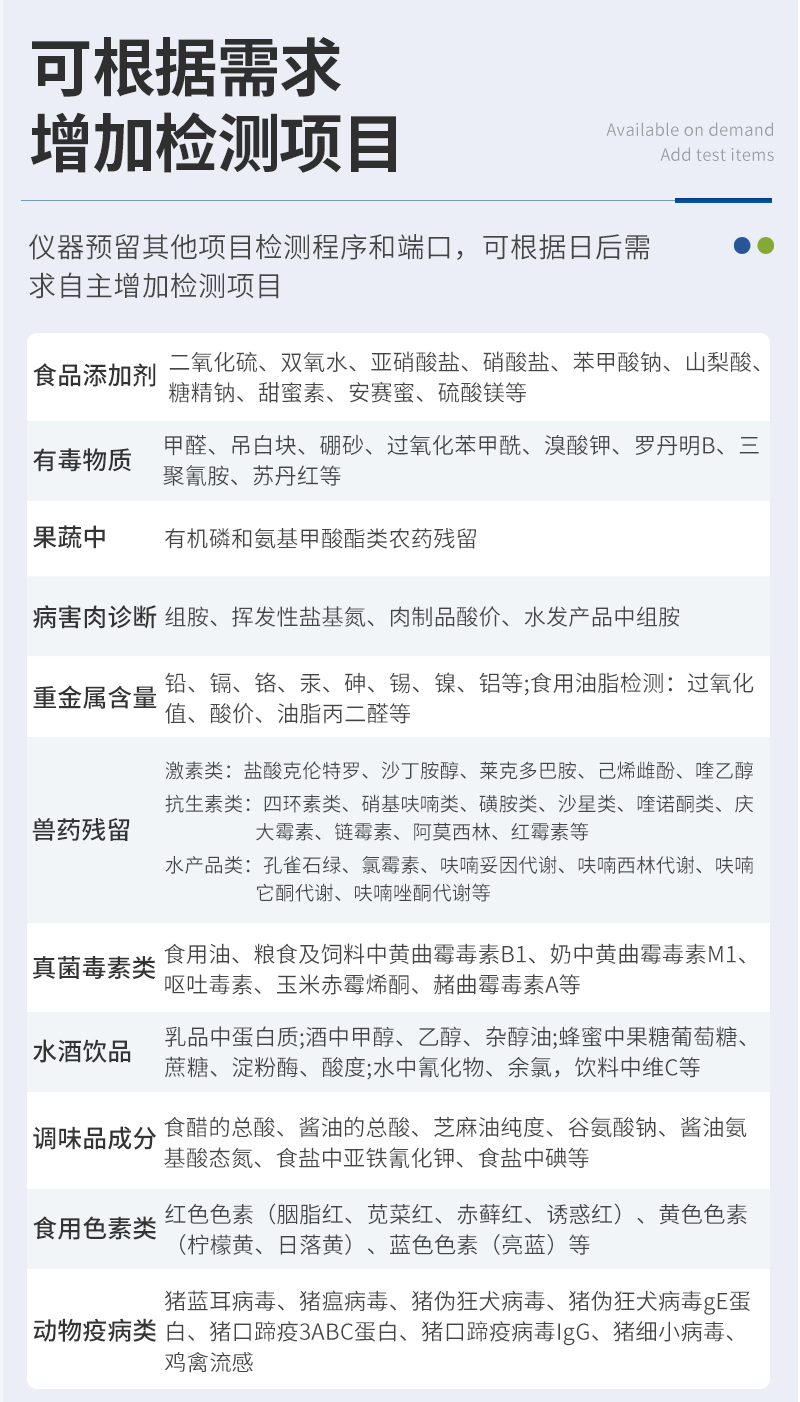 | 儀器采用手提一體化系統(tǒng)檢測(cè)技術(shù),將分光光度模塊、數(shù)字化管理模塊、無線通訊模塊高度集成于一體,可支持檢測(cè)60種食品安全檢測(cè)項(xiàng)目,同時(shí)預(yù)留升級(jí)檢測(cè)方法。 | 儀器檢測(cè)模塊標(biāo)準(zhǔn)化、智能化,檢測(cè)項(xiàng)目可隨意自由組合。檢測(cè)箱體內(nèi)置多個(gè)標(biāo)準(zhǔn)檢測(cè)單元,檢測(cè)模塊可以調(diào)整配置。 | 儀器采用全新安卓智能系統(tǒng),主控芯片采用 ARM Cortex-A7,RK3288/4核處理器,10.1寸高清液晶觸摸豎屏,更加**的UI交互界面,運(yùn)轉(zhuǎn)快捷;儀器配備無線通信模塊: 4G(APN)通訊模塊、Wifi模塊,藍(lán)牙傳輸,同時(shí)具有雙USB接口以及RJ45接口能以多種方式實(shí)現(xiàn)數(shù)據(jù)保存和數(shù)據(jù)傳輸功能。 | 顯示屏幕:儀器采用10.1英寸豎向液晶觸摸屏顯,搭配運(yùn)行安卓智能操作系統(tǒng),主控芯片采用ARM Cortex-A7,RK3288/4核處理器,主頻1.88Ghz,操作方便,性能更強(qiáng)。 | 檢測(cè)通道:≥12通道;采用精密旋轉(zhuǎn)比色池設(shè)計(jì),使用同芯片同光源校準(zhǔn)精度,解決不同光源之間的誤差值,更加準(zhǔn)確**。(1-12通道間誤差0.1%,**號(hào):ZL202022821055.2) | 儀器光源:高精度進(jìn)口四波長(zhǎng)冷光源,每個(gè)通道均配置 410、520、590、630nm 波長(zhǎng)光源,標(biāo)配**的光路切換裝置,**光路切換功能可實(shí)現(xiàn)64波長(zhǎng),并且所有檢測(cè)項(xiàng)目可實(shí)現(xiàn)所有通道同時(shí)檢測(cè)。 | 設(shè)備可一鍵校準(zhǔn),自動(dòng)保存校準(zhǔn)數(shù)據(jù),自動(dòng)對(duì)比校驗(yàn),得到精準(zhǔn)光源,采用Android SP存儲(chǔ)數(shù)據(jù),光源數(shù)據(jù)永不丟失,方便每一次使用。 | 通訊接口:配備無線通信模塊、4G(APN)通訊模塊、藍(lán)牙傳輸,同時(shí)具有雙USB接口以及RJ45網(wǎng)線接口,可以多方式實(shí)現(xiàn)數(shù)據(jù)保存及數(shù)據(jù)傳輸。 | 存儲(chǔ)方式:支持U盤存儲(chǔ),標(biāo)準(zhǔn)USB接口,免驅(qū)動(dòng)安裝。檢測(cè)結(jié)果存儲(chǔ)容量20萬條以上,可生成Excel表格進(jìn)行拷貝,并具有登錄保護(hù)功能。 | 智能化操作系統(tǒng): | 1、操作系統(tǒng):儀器可在同一檢測(cè)界面自動(dòng)對(duì)應(yīng)相關(guān)檢測(cè)通道,一次性選擇1-12個(gè)樣品名稱,無需退出界面,節(jié)省操作時(shí)間。并可以對(duì)每個(gè)通道屬性和樣品信息單獨(dú)進(jìn)行編輯,例如送檢單位、人員,檢測(cè)人員等,打印時(shí)勾選打印顯示。 | 2、數(shù)據(jù)集成系統(tǒng):設(shè)備首頁自動(dòng)匯總分析檢測(cè)數(shù)據(jù),包含:周檢測(cè)數(shù)據(jù)、月檢測(cè)數(shù)據(jù),全部檢測(cè)總數(shù)量,均包含檢測(cè)總數(shù),合格數(shù),不合格數(shù),以及相關(guān)柱形分析圖,各項(xiàng)檢測(cè)數(shù)據(jù)一目了然,無需電腦查詢,更加快捷直觀。 | 3、數(shù)據(jù)庫系統(tǒng):十幾項(xiàng)數(shù)據(jù)庫分類管理儀器:包含項(xiàng)目類型、項(xiàng)目數(shù)據(jù)、檢測(cè)數(shù)據(jù)、歷史記錄、國(guó)標(biāo)信息、曲線信息、采樣信息、檢測(cè)信息、受檢信息、復(fù)核信息、圖表信息、光源校準(zhǔn)信息、打印樣式信息、樣品庫信息等等,數(shù)據(jù)庫之間互相協(xié)調(diào)聯(lián)動(dòng)保證數(shù)據(jù)的真實(shí)完整性。同時(shí)產(chǎn)品數(shù)據(jù)庫以及歷史檢測(cè)記錄支持一鍵檢索功能。 | 4、限量規(guī)判系統(tǒng):具有限量查詢、添加物質(zhì)合規(guī)判定系統(tǒng)。檢測(cè)出結(jié)果后,系統(tǒng)自動(dòng)調(diào)用系統(tǒng)數(shù)據(jù)庫中相關(guān)國(guó)標(biāo)進(jìn)行比對(duì)判定,客觀顯示判定結(jié)果是否合格。 | 5、項(xiàng)目預(yù)設(shè)系統(tǒng):儀器具有任務(wù)預(yù)設(shè)模塊,一鍵提前預(yù)設(shè),給出方便快捷的新檢測(cè)方案,每一個(gè)任務(wù)分別可以設(shè)置不同的樣品、批次、編號(hào)、來源、備注、抽樣信息、檢測(cè)信息、受檢信息、復(fù)核信息等更多信息。樣品送檢時(shí)一鍵調(diào)取保存信息,并可多次調(diào)取,大大提高檢測(cè)效率。 | 6、數(shù)據(jù)監(jiān)管系統(tǒng):同步對(duì)接監(jiān)管平臺(tái),數(shù)據(jù)可局域網(wǎng)和互聯(lián)網(wǎng)數(shù)據(jù)上傳,檢測(cè)結(jié)果可選擇直接傳至食品安全監(jiān)管平臺(tái)。進(jìn)行區(qū)域食品安全監(jiān)管及大數(shù)據(jù)分析處理與數(shù)據(jù)統(tǒng)計(jì),檢測(cè)區(qū)域食品安全長(zhǎng)短期動(dòng)態(tài),達(dá)到食品安全問題預(yù)估、預(yù)警。 | 7、全新打印系統(tǒng):內(nèi)置全新打印機(jī),新創(chuàng)自定義打印方式,可按需靈活勾選控制:二維碼,抽樣信息、檢測(cè)信息,受檢信息、復(fù)核信息、抽樣日期、檢測(cè)日期等信息的打印。 | 8、A4紙版本報(bào)告打印功能(可選配):設(shè)備擁有兩種結(jié)果展示方式,可以自動(dòng)生成A4打印模板和小票打印模板兩種樣式,可通過WiFi及網(wǎng)線等方式鏈接外置打印機(jī)可進(jìn)行打印。 | 供電模式:儀器交直流兩用,直流12V供電,可連接車載電源,可配6ah大容量充電鋰電池,電量可實(shí)時(shí)顯示,方便戶外流動(dòng)測(cè)試。 | 儀器具備遠(yuǎn)程升級(jí)功能,可定向分客戶分儀器