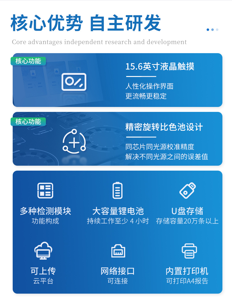 | 儀器采用臺式一體化系統(tǒng)檢測技術(shù),將分光光度模塊、膠體金檢測模塊、新型農(nóng)殘檢測模塊、數(shù)字化管理模塊、無線通訊模塊高度集成于一體,支持檢測200種食品安全檢測項目,同時預(yù)留升級檢測方法。 | 儀器檢測模塊標(biāo)準化、智能化,可隨意自由組合。檢測箱體內(nèi)置多個標(biāo)準檢測單元,檢測模塊可以調(diào)整配置。 | 顯示屏幕:儀器采用10.1英寸豎向液晶觸摸屏顯,搭配運行安卓智能操作系統(tǒng),主控芯片采用ARM Cortex-A7,RK3288/4核處理器,主頻1.88Ghz,操作方便,性能更強。 | 檢測通道:≥24通道;采用精密旋轉(zhuǎn)比色池設(shè)計,使用同芯片同光源校準精度,解決不同光源之間的誤差值,更加準確**。(1-12通道間誤差0.1%,**號:ZL202022821055.2) | 儀器光源:高精度進口四波長冷光源,每個通道均配置 410、520、590、630nm 波長光源,標(biāo)配**的光路切換裝置,**光路切換功能可實現(xiàn)64波長,并且所有檢測項目可實現(xiàn)所有通道同時檢測。 | 設(shè)備可一鍵校準,自動保存校準數(shù)據(jù),自動對比校驗,得到精準光源,采用Android SP存儲數(shù)據(jù),光源數(shù)據(jù)永不丟失,方便每一次使用。 | 通訊接口:配備無線通信模塊、可選配4G(APN)通訊模塊和藍牙傳輸,同時具有雙USB接口以及RJ45網(wǎng)線接口,可以多方式實現(xiàn)數(shù)據(jù)保存及數(shù)據(jù)傳輸。 | 存儲方式:支持U盤存儲,標(biāo)準USB接口,免驅(qū)動安裝。檢測結(jié)果存儲容量20萬條以上,可生成Excel表格進行拷貝,并具有登錄保護功能。 | 智能化操作系統(tǒng): | 1、操作系統(tǒng):儀器可在同一檢測界面自動對應(yīng)相關(guān)檢測通道,一次性選擇1-12個樣品名稱,無需退出界面,節(jié)省操作時間。并可以對每個通道屬性和樣品信息單獨進行編輯,例如送檢單位、人員,檢測人員等,打印時勾選打印顯示。 | 2、數(shù)據(jù)集成系統(tǒng):設(shè)備首頁自動匯總分析檢測數(shù)據(jù),包含:周檢測數(shù)據(jù)、月檢測數(shù)據(jù),總檢測數(shù)量,均包含檢測總數(shù),合格數(shù),不合格數(shù),以及相關(guān)柱形分析圖,各項檢測數(shù)據(jù)一目了然,無需電腦查詢,更加快捷直觀。 | 3、數(shù)據(jù)庫系統(tǒng):十幾項數(shù)據(jù)庫分類管理儀器:包含項目類型、項目數(shù)據(jù)、檢測數(shù)據(jù)、歷史記錄、國標(biāo)信息、曲線信息、采樣信息、檢測信息、受檢信息、復(fù)核信息、圖表信息、光源校準信息、打印樣式信息、樣品庫信息等等,數(shù)據(jù)庫之間互相協(xié)調(diào)聯(lián)動保證數(shù)據(jù)的真實完整性。同時產(chǎn)品數(shù)據(jù)庫以及歷史檢測記錄支持一鍵檢索功能。 | 4、限量規(guī)判系統(tǒng):具有限量查詢、添加物質(zhì)合規(guī)判定系統(tǒng)。檢測出結(jié)果后,系統(tǒng)自動調(diào)用系統(tǒng)數(shù)據(jù)庫中相關(guān)國標(biāo)進行比對判定,客觀顯示判定結(jié)果是否合格。 | 5、項目預(yù)設(shè)系統(tǒng):儀器具有任務(wù)預(yù)設(shè)模塊,一鍵提前預(yù)設(shè),給出方便快捷的新檢測方案,每一個任務(wù)分別可以設(shè)置不同的樣品、批次、編號、來源、備注、抽樣信息、檢測信息、受檢信息、復(fù)核信息等更多信息。樣品送檢時一鍵調(diào)取保存信息,并可多次調(diào)取,大大提高檢測效率。 | 6、數(shù)據(jù)監(jiān)管系統(tǒng):同步對接監(jiān)管平臺,數(shù)據(jù)可局域網(wǎng)和互聯(lián)網(wǎng)數(shù)據(jù)上傳,檢測結(jié)果可直接傳至食品安全監(jiān)管平臺。進行區(qū)域食品安全監(jiān)管及大數(shù)據(jù)分析處理與數(shù)據(jù)統(tǒng)計,監(jiān)測區(qū)域食品安全長短期動態(tài)及問題預(yù)估、預(yù)警。 | 7、全新打印系統(tǒng):內(nèi)置全新打印機,新創(chuàng)自定義打印方式,可按需靈活勾選控制:產(chǎn)品合格證(國家農(nóng)業(yè)部標(biāo)準要求),二維碼,抽樣信息、檢測信息,受檢信息、復(fù)核信息、抽樣日期、檢測日期等信息的打印。 | 8、A4紙版本報告打印功能(可選配):設(shè)備擁有兩種結(jié)果展示方式,可以自動生成A4打印模板和小票打印模板兩種樣式,可通過WiFi及網(wǎng)線等方式鏈接外置打印機可進行打印。 | 供電模式:儀器交直流兩用,直流12V供電,可連接車載電源,可配6ah大容量充電鋰電池,電量可實時顯示,方便戶外流動測試。 | 膠體金檢測模塊:采用雙通道CMOS成像處理技術(shù)及膠體金免疫層析技術(shù),可同時讀取雙膠體金卡數(shù)據(jù),自動采集、處理分析,將檢測結(jié)果顯示,并可根據(jù)參考限值自動判斷檢測結(jié)果,可檢測常見的獸藥殘留、生物毒素、抗生素、違禁添加物等。 | 1、探測技術(shù):CMOS成像探測; | 2、檢測通道:2通道,可同時讀取2個膠體金卡數(shù)據(jù); | 3、檢測方式:消線法和比色法; | 4、顯示模式:陰性或陽性; | 5、曲線形式:直插式掃描方式,顯示金標(biāo)卡圖像,實時生成、識別CT曲線圖,無需手動調(diào)整,完成檢測后自動退出檢測卡。兼容市場上其他金標(biāo)卡,使用耗材不受限制。 | 儀器具備遠程升級功能,可定向分客戶分儀器更新,開機后自動更新,并可持續(xù)性免費更新系統(tǒng)版本,無需像傳統(tǒng)產(chǎn)品返廠更新,節(jié)省時間及人力成本并避免了物流運輸返廠升級導(dǎo)致設(shè)備損壞的潛在