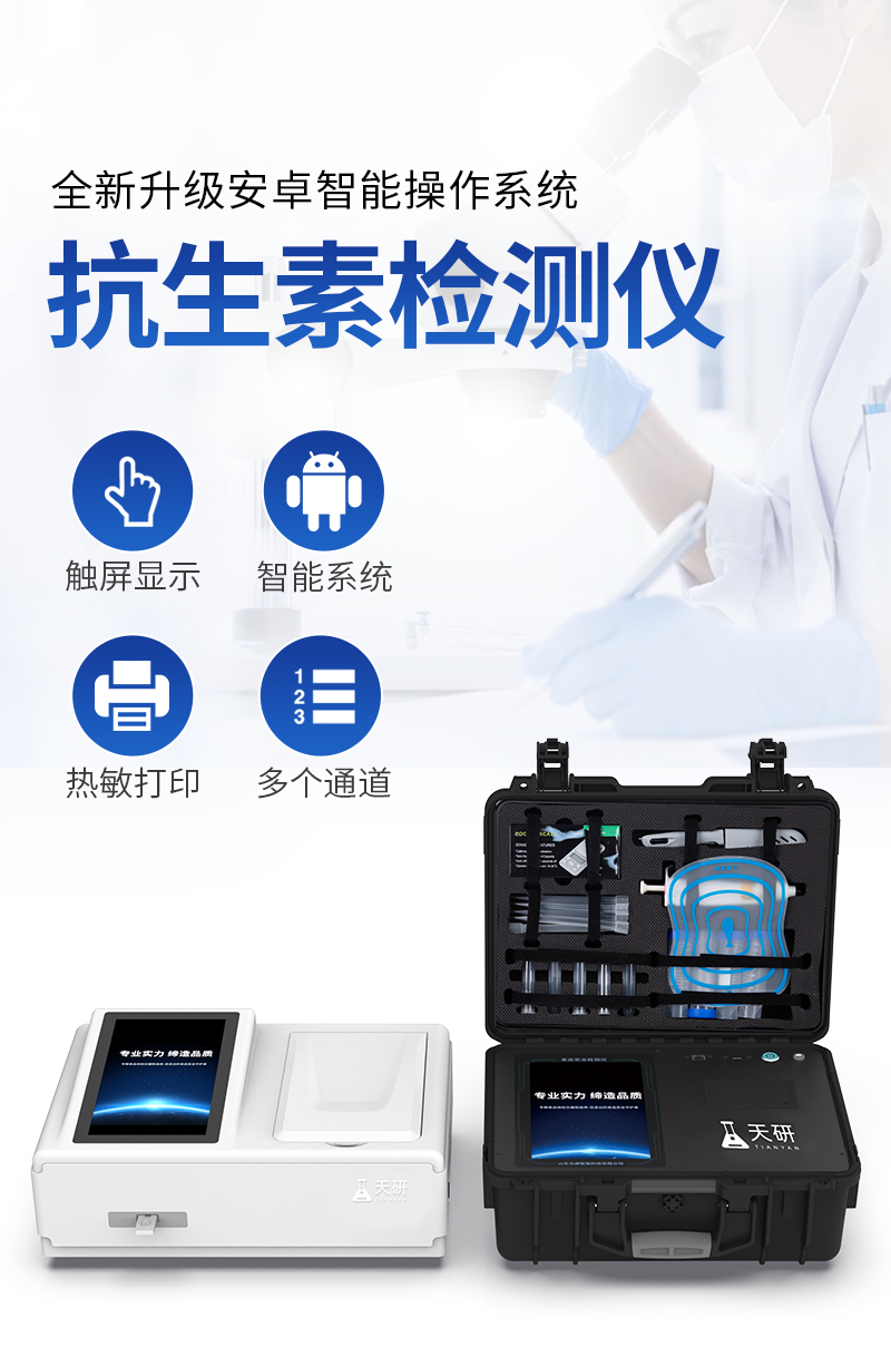 山東天研儀器有限公司生產(chǎn)的高智能食品安全檢測儀為集成化食品安全快速檢測分析設(shè)備,采用臺式一體化設(shè)計,可快速檢測200多種食品安全項目,包含非食用化學物質(zhì)、濫用食品添加劑、農(nóng)藥殘留、獸藥殘留、重金屬、病害肉、營養(yǎng)強化劑、抗生素類殘留、激素類殘留、真菌毒素類殘留、化學類殘留等項目的定性定量檢測。目前廣泛應用于市場監(jiān)管局、檢測中心、衛(wèi)生監(jiān)督部門、農(nóng)業(yè)部門、院校及各單位食堂、食品肉產(chǎn)品深加工企業(yè)、商超市場、司法部門、餐飲機構(gòu)、養(yǎng)殖場、屠宰場、檢驗檢疫部門等單位。