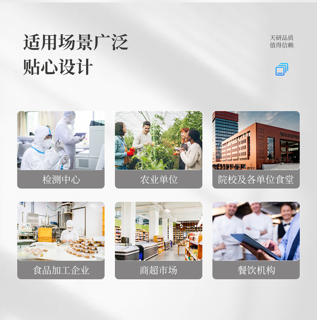 多功能食品安全檢測儀可快速檢測200多項目,包含非食用化學(xué)物質(zhì)、濫用食品添加劑、農(nóng)藥殘留、獸藥殘留、重金屬、病害肉、營養(yǎng)強化劑、抗生素類殘留、激素類殘留、真菌毒素類殘留、化學(xué)類殘留等現(xiàn)場的定性定量檢測。該多功能食品安全檢測儀為集成化食品安全快速檢測分析設(shè)備,廣泛應(yīng)用于市場監(jiān)管局、檢測中心、衛(wèi)生監(jiān)督部門、農(nóng)業(yè)部門、院校及各單位食堂、食品肉產(chǎn)品深加工企業(yè)、商超市場、司法部門、餐飲機構(gòu)、養(yǎng)殖場、屠宰場、檢驗檢疫部門等單位使用。