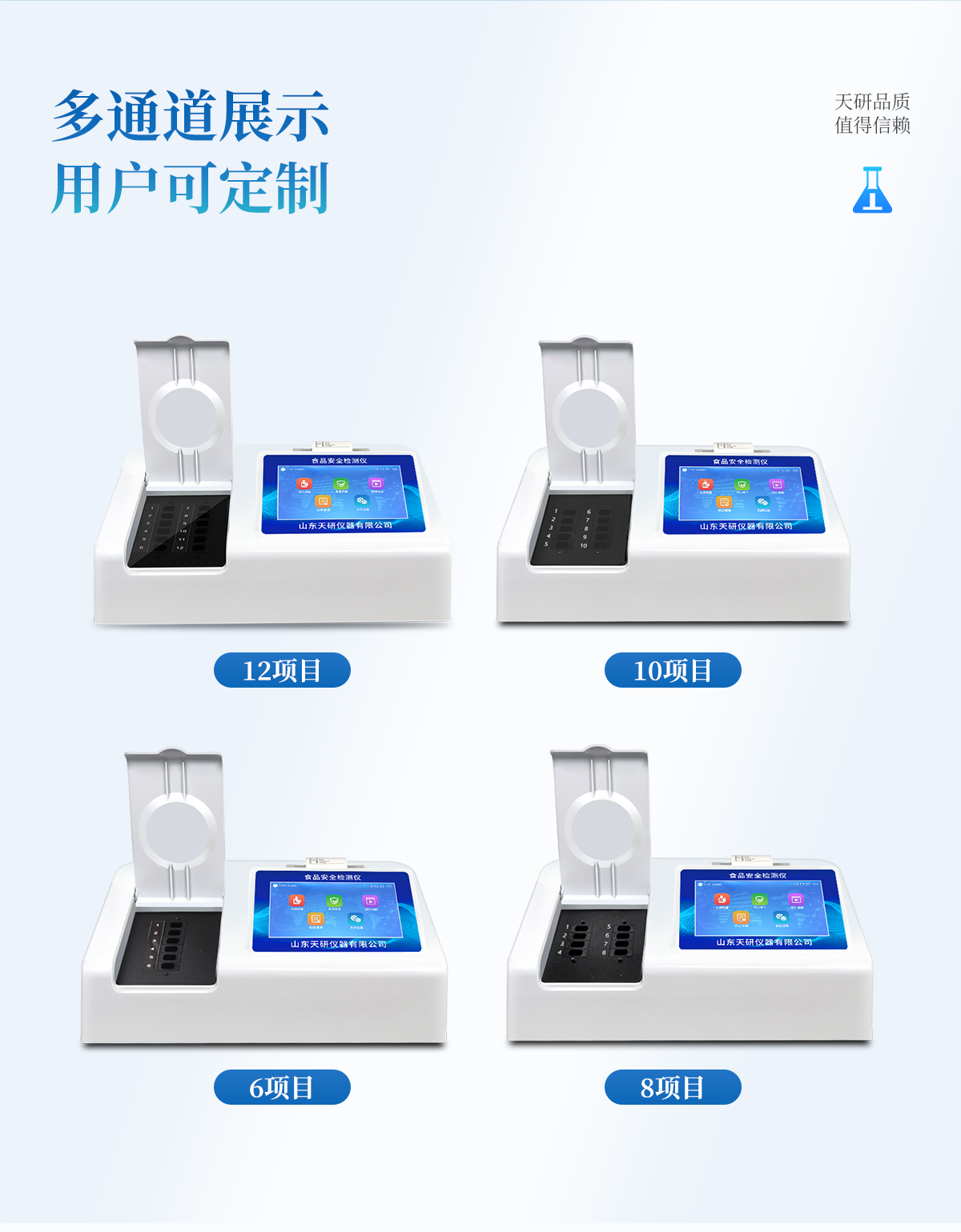 產(chǎn)品介紹: 多功能食品安全檢測(cè)儀可快速檢測(cè)200多項(xiàng)目,包含非食用化學(xué)物質(zhì)、濫用食品添加劑、農(nóng)藥殘留、獸藥殘留、重金屬、病害肉、營養(yǎng)強(qiáng)化劑、抗生素類殘留、激素類殘留、真菌毒素類殘留、化學(xué)類殘留等現(xiàn)場(chǎng)的定性定量檢測(cè)。該多功能食品安全檢測(cè)儀為集成化食品安全快速檢測(cè)分析設(shè)備,廣泛應(yīng)用于市場(chǎng)