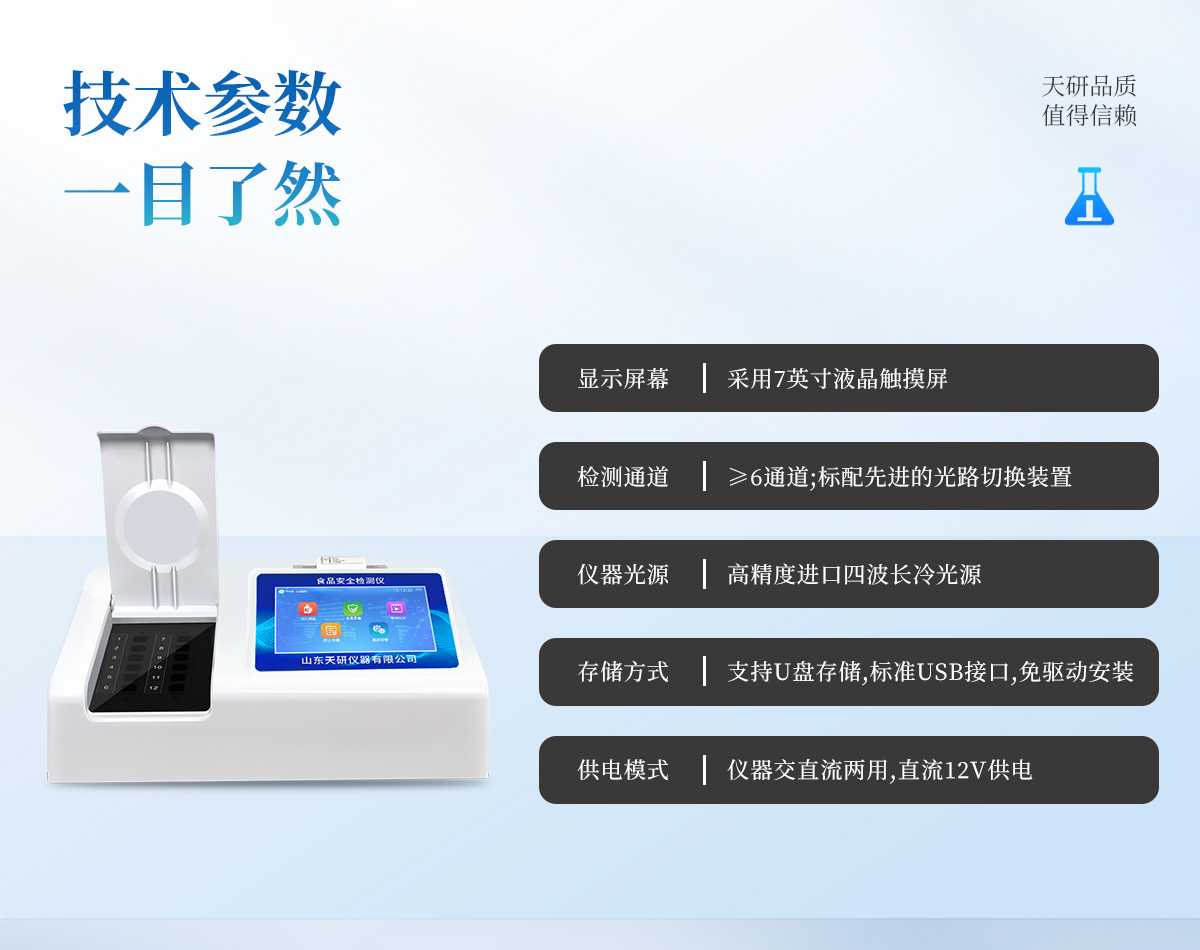 | 安卓智能操作系統(tǒng),采用更加**和人性化操作,儀器具有網(wǎng)線連接、wifi聯(lián)網(wǎng)上傳、GPRS無線遠(yuǎn)傳功能,快速上傳數(shù)據(jù)。 | 智能化程度高,儀器具有自檢功能:具有開機(jī)自檢和調(diào)零功能,具有自動(dòng)檢測(cè)重復(fù)性功能。 | 檢測(cè)通道:≥12個(gè)檢測(cè)通道,可以同時(shí)測(cè)試多個(gè)樣品,每個(gè)樣品由程序控制分別獨(dú)立工作,不會(huì)互相干擾。 | 顯示方式:≥8英寸液晶觸摸屏顯示,人性化中文操作界面,讀數(shù)直觀、簡單。 | 配備新一代嵌入式熱敏打印機(jī),可選擇手動(dòng)打印或者自動(dòng)打印,檢測(cè)完成可自動(dòng)打印檢測(cè)報(bào)告和二維碼。 | 光源采用進(jìn)口超高亮發(fā)光二極管,高精度、穩(wěn)定性強(qiáng)、光源可控、可以關(guān)掉不使用的光源,功耗更低。 | 采用USB2.0接口設(shè)計(jì),方便數(shù)據(jù)的存貯和移動(dòng),并可隨時(shí)與計(jì)算機(jī)直接相連,并且可用計(jì)算機(jī)控制儀器。實(shí)現(xiàn)數(shù)據(jù)查詢、瀏覽、分析、統(tǒng)計(jì)、打印等。 | 儀器帶有監(jiān)管平臺(tái)。數(shù)據(jù)可局域網(wǎng)和互聯(lián)網(wǎng)數(shù)據(jù)上傳,檢測(cè)結(jié)果直接傳至食品安全監(jiān)管平臺(tái)。進(jìn)行區(qū)域食品安全監(jiān)管及大數(shù)據(jù)分析處理,檢測(cè)區(qū)域食品安全長短期動(dòng)態(tài),達(dá)到食品安全問題預(yù)估、預(yù)警 | 一體化便攜式快檢設(shè)備,滿足現(xiàn)場(chǎng)及流動(dòng)檢測(cè)使用需求,能夠在同一軟件下實(shí)現(xiàn)所有檢測(cè)項(xiàng)目的檢測(cè),并可通過同一窗口直觀顯示檢測(cè)結(jié)果。 | 儀器具有多品類多種類樣品菜單庫,可靈活選擇檢測(cè)樣品,不同的檢測(cè)通道可同時(shí)檢測(cè)不同的樣品項(xiàng)目。也可在儀器上直接編輯錄入樣品名稱、檢測(cè)指標(biāo)、送檢單位等信息并保存進(jìn)樣品數(shù)據(jù)庫。 | 樣品處理簡單省力,整體操作快速、安全、便捷。 | 儀器具有自身保護(hù)功能,可設(shè)置用戶名及密碼,防止非工作人員操作等。 | 高靈敏度,高檢測(cè)精度,高重復(fù)性精度,掃描式高精度光學(xué)傳感器。 | 儀器具有重新校準(zhǔn)、鎖定、恢復(fù)出廠設(shè)置功能。 | 支持U盤存儲(chǔ)。 結(jié)果判定線可修改,對(duì)照值標(biāo)定值可保存,斷電不丟失數(shù)據(jù)。 |