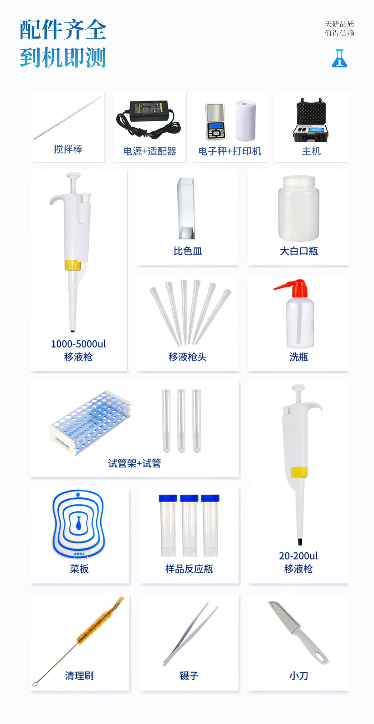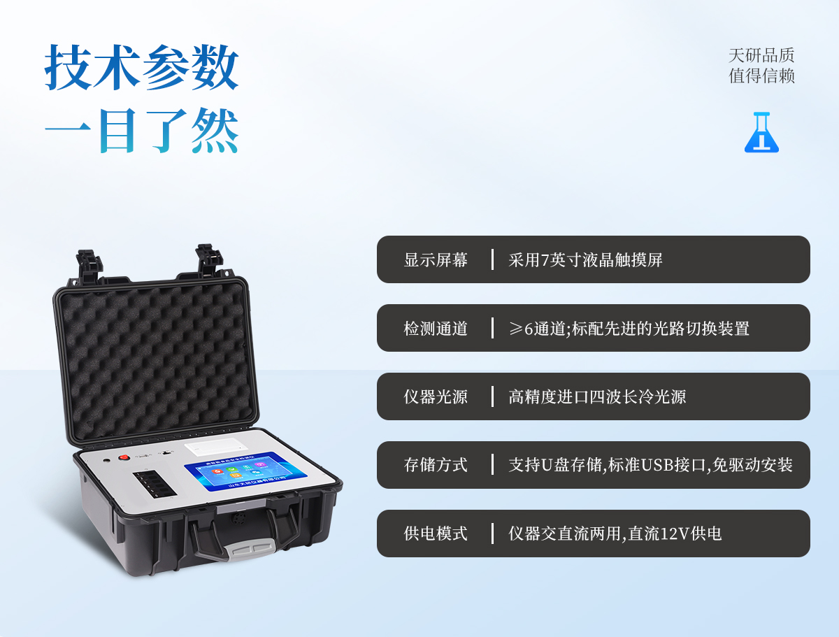 | 主控芯片采用ARM Cortex-A7,RK3288/4核處理器,主頻1.88Ghz,運(yùn)轉(zhuǎn)速度更快速,穩(wěn)定性更強(qiáng)。 | 顯示方式:7英寸液晶觸摸屏顯示,人性化中文操作界面,讀數(shù)直觀、簡(jiǎn)單。 | 交直流兩用,直流12V供電,可連接車(chē)載電源,可配6ah大容量充電鋰電池,方便戶(hù)外流動(dòng)測(cè)試。 | 四波長(zhǎng)冷光源,6個(gè)檢測(cè)通道,每個(gè)通道均配置410、520、590、630nm波長(zhǎng)光源,標(biāo)配**的光路切換裝置,專(zhuān)業(yè)光路切換功能可實(shí)現(xiàn)*多64波長(zhǎng),并且所有檢測(cè)項(xiàng)目可實(shí)現(xiàn)所有通道同時(shí)檢測(cè)。 | 智能恒流穩(wěn)壓,光強(qiáng)自動(dòng)調(diào)節(jié)與校準(zhǔn),長(zhǎng)時(shí)間連續(xù)工作光源無(wú)溫漂現(xiàn)象。 | 內(nèi)置新國(guó)家限量標(biāo)準(zhǔn),與所測(cè)結(jié)果進(jìn)行現(xiàn)場(chǎng)比對(duì),并持續(xù)更新標(biāo)準(zhǔn)。 | 不間斷進(jìn)樣,連續(xù)檢測(cè) | 樣本編號(hào)自動(dòng)累加。 | 數(shù)據(jù)無(wú)線上傳平臺(tái),并可從平臺(tái)導(dǎo)出為Excel表格。 | 檢測(cè)結(jié)果存儲(chǔ)容量20萬(wàn)條 | 同時(shí)支持U盤(pán)拷貝,標(biāo)準(zhǔn)USB接口,免驅(qū)動(dòng)插拔。 | 檢測(cè)項(xiàng)目可擴(kuò)充,固件可升級(jí) | 儀器尺寸:43×35×19cm, 主機(jī)凈重:5.1kg |
