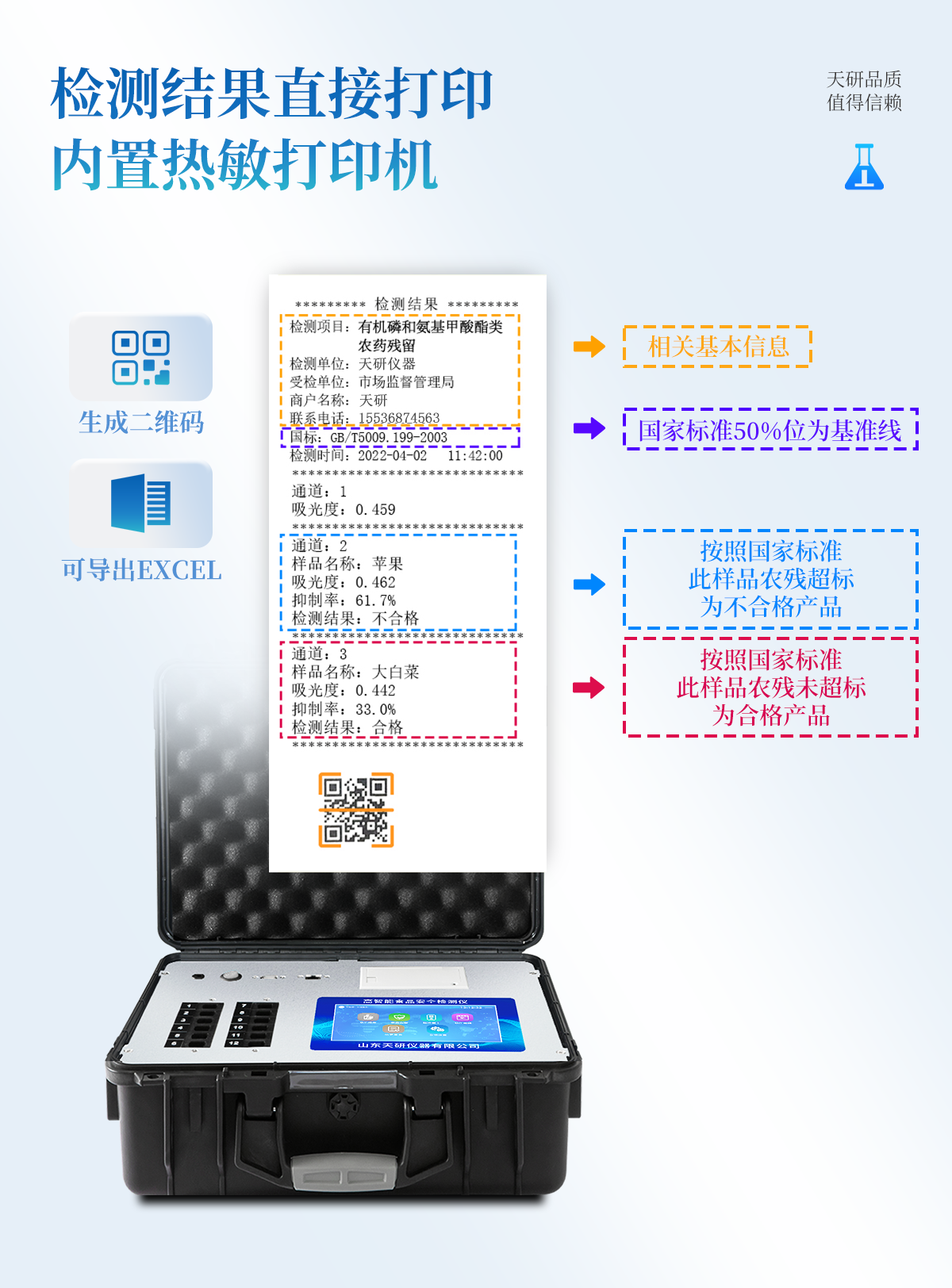 | 安卓智能操作系統(tǒng),采用更加**的UI交互界面,儀器具有wifi聯(lián)網(wǎng)上傳、4G聯(lián)網(wǎng)傳輸、GPRS無(wú)線遠(yuǎn)傳、網(wǎng)線連接功能,快速批量上傳數(shù)據(jù)。 | 智能化程度高,儀器具有自檢功能:具有開(kāi)機(jī)自檢和調(diào)零功能,具有自動(dòng)檢測(cè)重復(fù)性功能。 | 新一代高速熱敏打印機(jī),檢測(cè)完成可自動(dòng)打印或批量打印檢測(cè)報(bào)告和二維碼。 | 儀器帶有監(jiān)管平臺(tái),數(shù)據(jù)可局域網(wǎng)和互聯(lián)網(wǎng)數(shù)據(jù)上傳,檢測(cè)結(jié)果直接傳至食品安全監(jiān)管平臺(tái)。進(jìn)行區(qū)域食品安全監(jiān)管及大數(shù)據(jù)分析處理與數(shù)據(jù)統(tǒng)計(jì),檢測(cè)區(qū)域食品安全長(zhǎng)短期動(dòng)態(tài),達(dá)到食品安全問(wèn)題預(yù)估、預(yù)警 | 一體化主機(jī),包含食品安全檢測(cè)模塊、多通道農(nóng)藥殘留檢測(cè)模塊、膠體金免疫層析檢測(cè)模塊。 | 一體化便攜式快檢設(shè)備,滿(mǎn)足現(xiàn)場(chǎng)及流動(dòng)檢測(cè)使用需求,能夠在同一軟件下實(shí)現(xiàn)所有檢測(cè)項(xiàng)目的檢測(cè),并可通過(guò)同一窗口直觀顯示檢測(cè)結(jié)果。 | 膠體金模塊檢測(cè)方式:軌道式自動(dòng)傳輸掃描,檢測(cè)完成后自動(dòng)退出檢測(cè)卡。 | CT線自動(dòng)識(shí)別,無(wú)需手動(dòng)調(diào)整。 | 內(nèi)置強(qiáng)大的數(shù)據(jù)庫(kù),具有多品類(lèi)多種類(lèi)樣品菜單功能,可靈活選擇檢測(cè)樣品,不同的檢測(cè)通道可同時(shí)檢測(cè)不同的樣品項(xiàng)目。也可在儀器上直接編輯錄入樣品名稱(chēng)、檢測(cè)指標(biāo)、送檢單位等信息并保存進(jìn)樣品數(shù)據(jù)庫(kù)。 | 產(chǎn)品內(nèi)置操作演示視頻,是您身邊的化驗(yàn)指導(dǎo)專(zhuān)家。 | 樣品處理簡(jiǎn)單省力,整體操作快速、安全、便捷。 | 儀器具有自身保護(hù)功能,可設(shè)置用戶(hù)名及密碼,防止非工作人員操作等。 | 高靈敏度,高檢測(cè)精度,高重復(fù)性精度,掃描式高精度光學(xué)傳感器。 | 結(jié)果判定線可修改,對(duì)照值標(biāo)定值可保存,斷電不丟失數(shù)據(jù)。 | 兼容市場(chǎng)上所有的膠體金卡,使用耗材不受限制,極大增強(qiáng)用戶(hù)使用體驗(yàn)。 | 儀器具有重新校準(zhǔn)、鎖定、恢復(fù)出廠設(shè)置功能。 |
