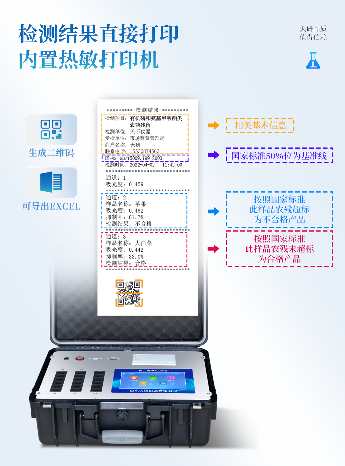 | 安卓智能操作系統(tǒng),采用更加**的UI交互界面,儀器具有wifi聯(lián)網(wǎng)上傳、4G聯(lián)網(wǎng)傳輸、GPRS無線遠傳、網(wǎng)線連接功能,快速批量上傳數(shù)據(jù)。 | 智能化程度高,儀器具有自檢功能:具有開機自檢和調(diào)零功能,具有自動檢測重復(fù)性功能。 | 新一代高速熱敏打印機,檢測完成可自動打印或批量打印檢測報告和二維碼。 | 儀器帶有監(jiān)管平臺,數(shù)據(jù)可局域網(wǎng)和互聯(lián)網(wǎng)數(shù)據(jù)上傳,檢測結(jié)果直接傳至食品安全監(jiān)管平臺。進行區(qū)域食品安全監(jiān)管及大數(shù)據(jù)分析處理與數(shù)據(jù)統(tǒng)計,檢測區(qū)域食品安全長短期動態(tài),達到食品安全問題預(yù)估、預(yù)警 | 一體化主機,包含食品安全檢測模塊、多通道農(nóng)藥殘留檢測模塊、膠體金免疫層析檢測模塊。 | 一體化便攜式快檢設(shè)備,滿足現(xiàn)場及流動檢測使用需求,能夠在同一軟件下實現(xiàn)所有檢測項目的檢測,并可通過同一窗口直觀顯示檢測結(jié)果。 | 膠體金模塊檢測方式:軌道式自動傳輸掃描,檢測完成后自動退出檢測卡。 | CT線自動識別,無需手動調(diào)整。 | 內(nèi)置強大的數(shù)據(jù)庫,具有多品類多種類樣品菜單功能,可靈活選擇檢測樣品,不同的檢測通道可同時檢測不同的樣品項目。也可在儀器上直接編輯錄入樣品名稱、檢測指標、送檢單位等信息并保存進樣品數(shù)據(jù)庫。 | 產(chǎn)品內(nèi)置操作演示視頻,是您身邊的化驗指導(dǎo)專家。 | 樣品處理簡單省力,整體操作快速、安全、便捷。 | 儀器具有自身保護功能,可設(shè)置用戶名及密碼,防止非工作人員操作等。 | 高靈敏度,高檢測精度,高重復(fù)性精度,掃描式高精度光學(xué)傳感器。 | 結(jié)果判定線可修改,對照值標定值可保存,斷電不丟失數(shù)據(jù)。 | 兼容市場上所有的膠體金卡,使用耗材不受限制,極大增強用戶使用體驗。 | 儀器具有重新校準、鎖定、恢復(fù)出廠設(shè)置功能。 |
