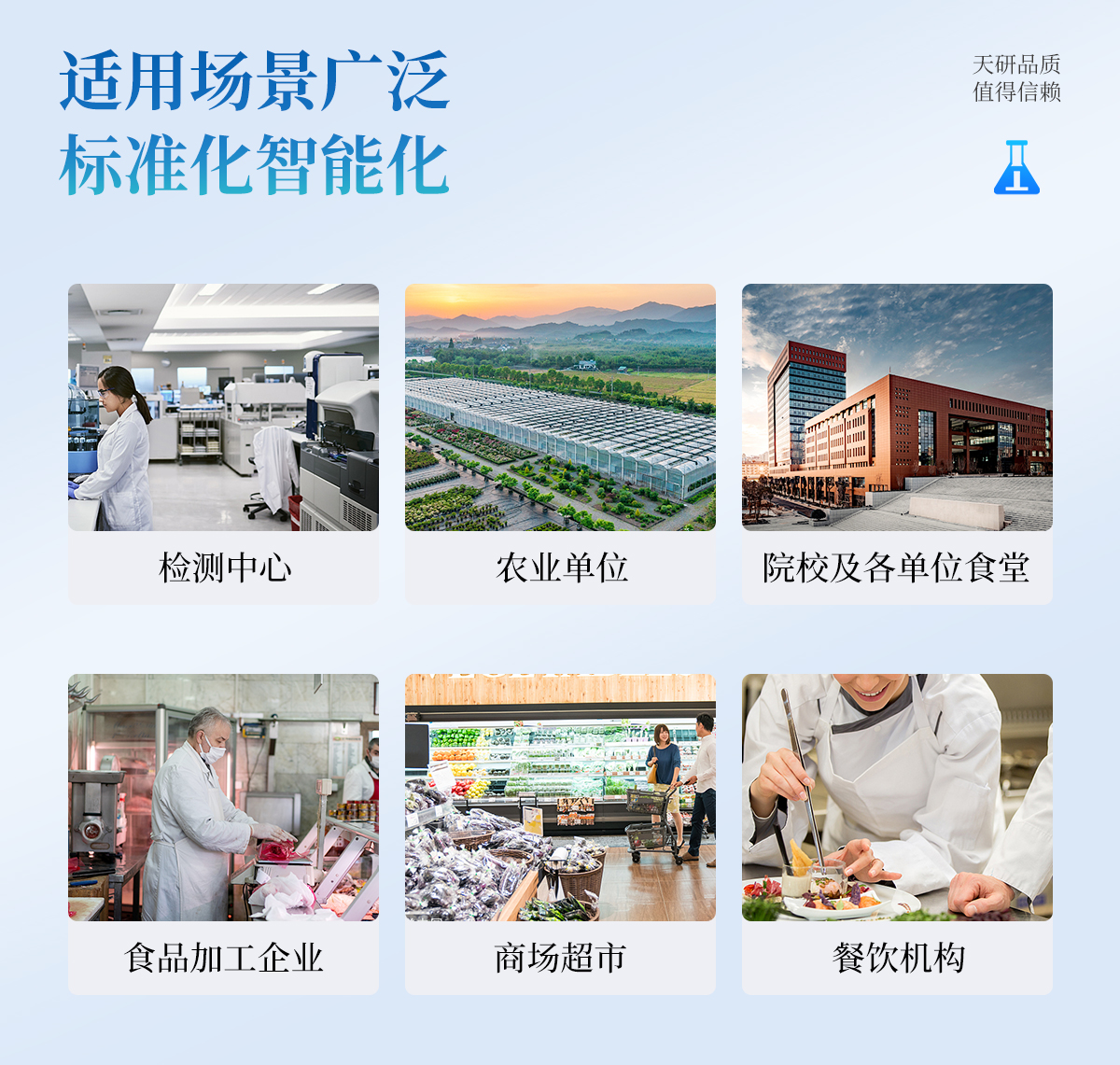 多功能食品安全檢測儀可快速檢測200多項目,包含非食用化學(xué)物質(zhì)、濫用食品添加劑、農(nóng)藥殘留、獸藥殘留、重金屬、病害肉、營養(yǎng)強化劑、抗生素類殘留、激素類殘留、真菌毒素類殘留、化學(xué)類殘留等現(xiàn)場的定性定量檢測。該多功能食品安全檢測儀為集成化食品安全快速檢測分析設(shè)備,廣泛應(yīng)用于市場監(jiān)管局、檢測中心、衛(wèi)生監(jiān)督部門、農(nóng)業(yè)部門、院校及各單位食堂、食品肉產(chǎn)品深加工企業(yè)、商超市場、司法部門、餐飲機構(gòu)、養(yǎng)殖場、屠宰場、檢驗檢疫部門等單位使用。