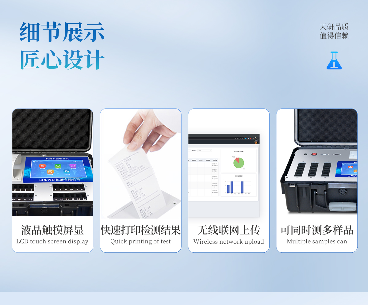 產(chǎn)品介紹: 多功能食品安全檢測儀可快速檢測200多項目,包含非食用化學(xué)物質(zhì)、濫用食品添加劑、農(nóng)藥殘留、獸藥殘留、重金屬、病害肉、營養(yǎng)強化劑、抗生素類殘留、激素類殘留、真菌毒素類殘留、化學(xué)類殘留等現(xiàn)場的定性定量檢測。該多功能食品安全檢測儀為集成化食品安全快速檢測分析設(shè)備,廣泛應(yīng)用于市場監(jiān)