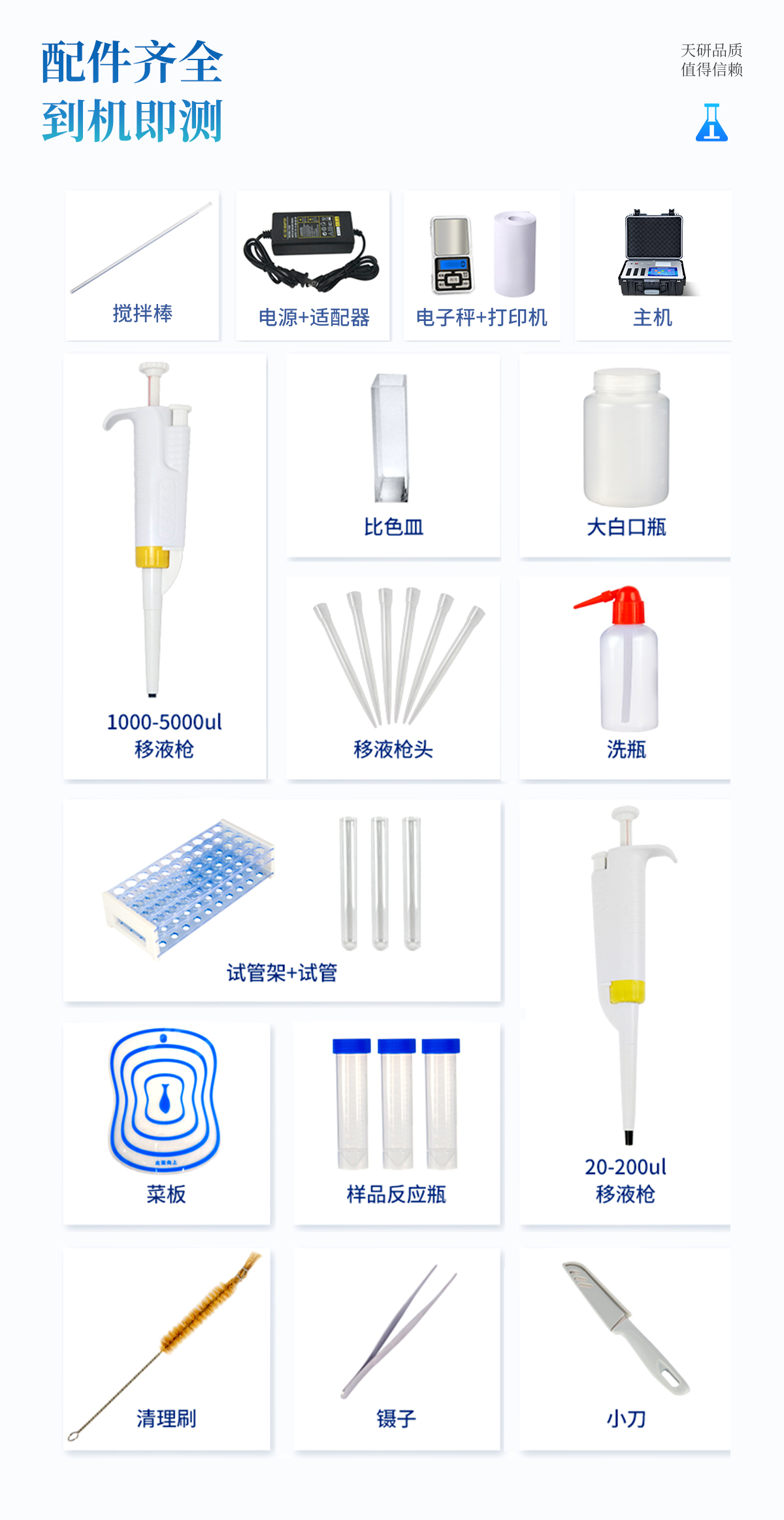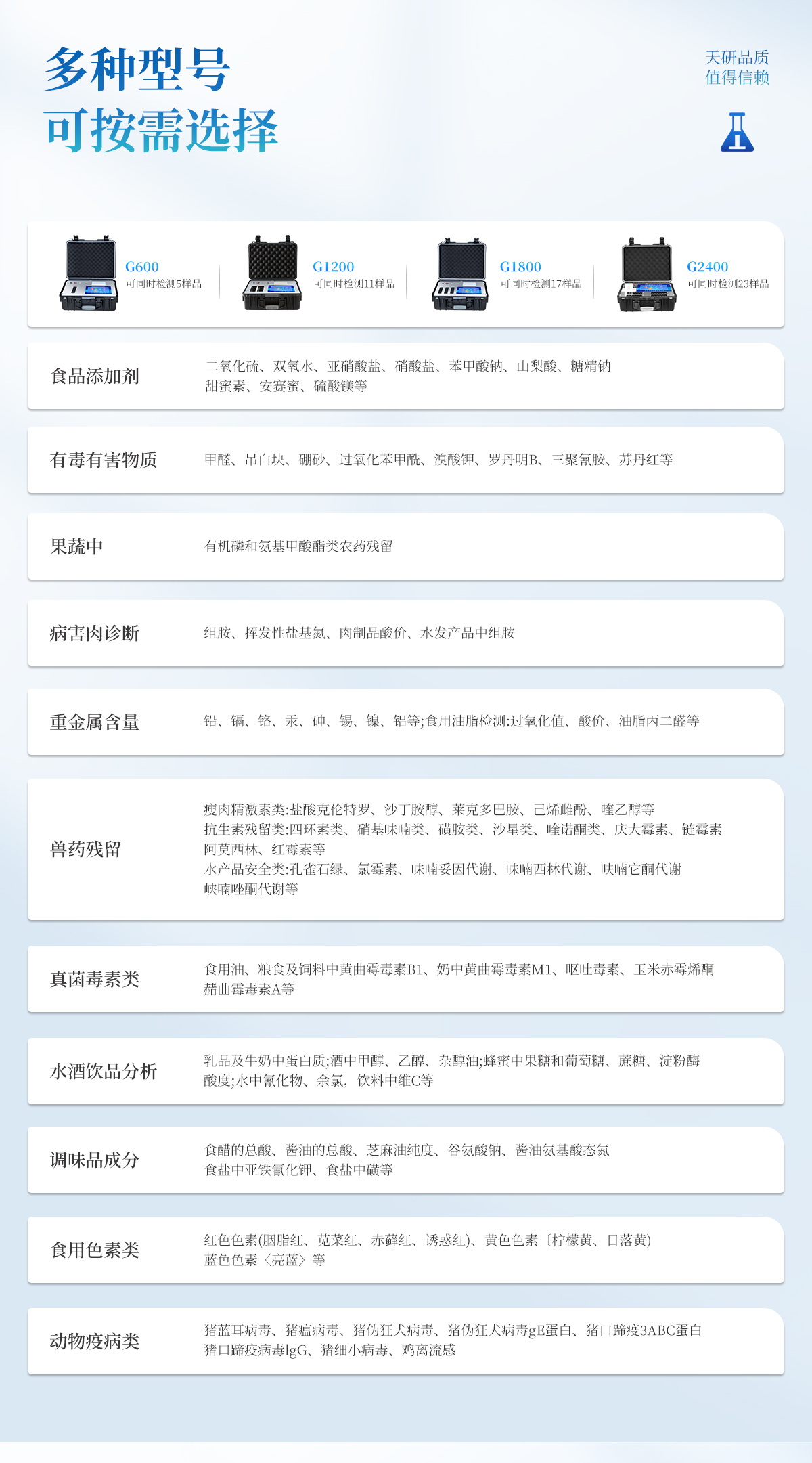 | 食品添加劑:二氧化硫、雙氧水、亞硝酸鹽、硝酸鹽、苯甲酸鈉、山梨酸、糖精鈉、甜蜜素、安賽蜜、硫酸鎂等 | 有毒有害物質(zhì):甲醛、吊白塊、硼砂、過氧化苯甲酰、溴酸鉀、羅丹明B、三聚氰胺、蘇丹紅等 | 果蔬中:有機磷和氨基甲酸酯類農(nóng)藥殘留; | 病害肉診斷:組胺、揮發(fā)性鹽基氮、肉制品酸價、水發(fā)產(chǎn)品中組胺 | 重金屬含量:鉛、鎘、鉻、汞、砷、錫、鎳、鋁等;食用油脂檢測:過氧化值、酸價、油脂丙二醛等。 | 瘦肉精激素類(獸藥):鹽酸克倫特羅、沙丁胺醇、萊克多巴胺、己烯雌酚、喹乙醇等 | 抗生素殘留類(獸藥):四環(huán)素類、硝基呋喃類、磺胺類、沙星類、喹諾酮類、慶大霉素、鏈霉素、阿莫西林、紅霉素等 | 水產(chǎn)品安全類:孔雀石綠、氯霉素、呋喃妥因代謝、呋喃西林代謝、呋喃它酮代謝、呋喃唑酮代謝等 | 真菌毒素類:食用油、糧食及飼料中黃曲霉毒素B1、奶中黃曲霉毒素M1、嘔吐毒素、玉米赤霉烯酮、赭曲霉毒素A等 | 水酒飲品分析:乳品及牛奶中蛋白質(zhì);酒中甲醇、乙醇、雜醇油;蜂蜜中果糖和葡萄糖、蔗糖、淀粉酶、酸度;水中氰化物、余氯,飲料中維C等 | 調(diào)味品成分:食醋的總酸、醬油的總酸、芝麻油純度、谷氨酸鈉、醬油氨基酸態(tài)氮、食鹽中亞鐵氰化鉀、食鹽中碘等 | 食用色素類:紅色色素(胭脂紅、莧菜紅、赤蘚紅、誘惑紅)、黃色色素(檸檬黃、日落黃)、藍色色素(亮藍)等 | 動物疫病類:豬藍耳病毒、豬瘟病毒、豬偽狂犬病毒、豬偽狂犬病毒gE蛋白、豬口蹄疫3ABC蛋白、豬口蹄疫病毒IgG、豬細小病毒、雞禽流感等 |