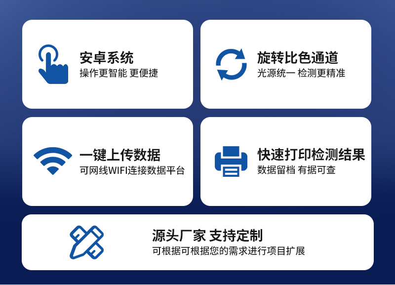 | 機器采用全新安卓智能系統(tǒng),主控芯片采用 ARM Cortex-A7,RK3288/4核處理器,主頻1.88Ghz,運轉(zhuǎn)速度更快速,穩(wěn)定性更強。 | 創(chuàng)新檢測模式: *儀器采用精密旋轉(zhuǎn)比色池設計,使用光源一致,可以解決各通道間由于光源誤差帶來的檢測結(jié)果誤差問題,檢測結(jié)果更加精準。 *儀器具有自動識別比色皿檢測功能,即:將樣品比色皿放入儀器后,點擊樣品檢測,儀器自動識別比色皿進行通道檢測。 | 供電方式:交直流兩用,直流 12V 供電,可連接車載電源,可配 6ah 大容量充電鋰電池,方便戶外流動測試。 | 顯示方式:7英寸液晶觸摸屏顯示,人性化中文操作界面,讀數(shù)直觀、簡單。 | 檢測通道:8個檢測通道,可以同時測試多個樣品,循環(huán)檢測,即放即檢,每個樣品由程序控制分別獨立工作,不會互相干擾。 | 高精光源系統(tǒng): ①儀器光源采用進口超高亮發(fā)光二極管,光源亮度可以自動調(diào)節(jié)與校準 ②智能恒流穩(wěn)壓,光強自動校準,長時間連續(xù)工作光源無溫漂現(xiàn)象。 | 智能操作分析系統(tǒng): ①儀器具有100多種蔬菜名稱菜單庫,分類管理,并可按需添加或刪除、編輯蔬菜名稱;可在同一檢測界面自動對應相關(guān)檢測通道一次性選擇1-24個樣品名稱,無需退出界面,節(jié)省操作時間。 ②內(nèi)置新國家限量標準,與所測結(jié)果進行現(xiàn)場比對,并持續(xù)更新標準。 | 完善的配套硬件: ①采用串口5v打印機,可選擇手動打印或者自動打印,三分鐘出打印結(jié)果,打印格式為檢測人姓名、吸光度差值、檢測時間、檢測機構(gòu)、樣品名稱及結(jié)果判定。 ②儀器具有無線上傳模塊,檢測結(jié)果可批量打印,批量上傳。 | 數(shù)據(jù)調(diào)用: ①儀器可存儲20萬條檢測結(jié)果, ②檢測結(jié)果為Excel表格,方便后期進行數(shù)據(jù)分析與匯總報告 ③儀器采用USB2.0接口設計,支持 U 盤存儲,方便數(shù)據(jù)的存貯和移動,并可隨時與計算機直接相連,實現(xiàn)數(shù)據(jù)查詢、瀏覽、分析、統(tǒng)計、打印等。 | 后期產(chǎn)品固件可升級。 | 安全證書,放心保障:儀器具有中國計量科學研究院校準證書,**認證,使用放心。 | 機箱采用工業(yè)級ABS工程塑料箱,方便攜帶,穩(wěn)固耐用,便于流動測試。 |