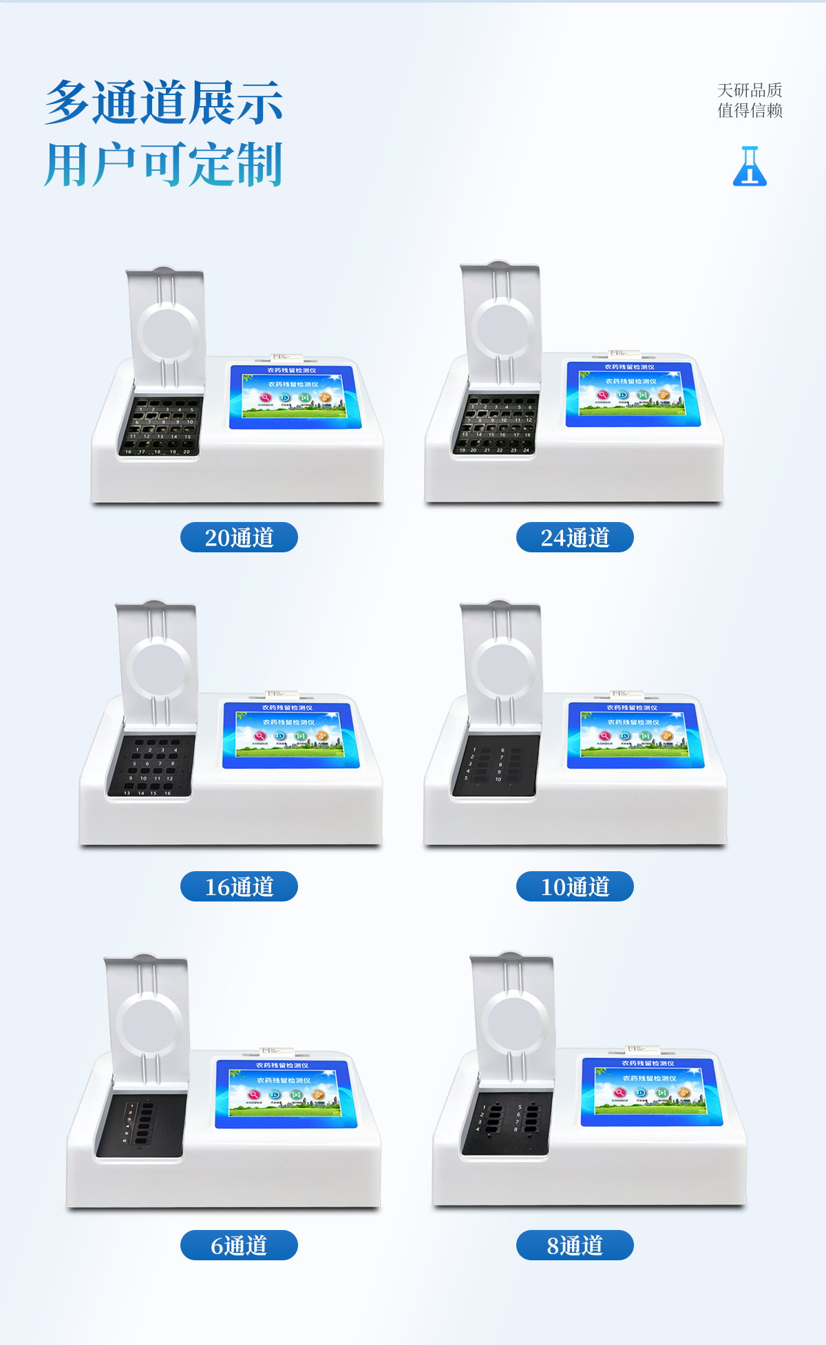| 乙酰膽堿酯酶和丁酰膽堿酯酶試劑均可以使用,符合國家標(biāo)準(zhǔn)和農(nóng)業(yè)部標(biāo)準(zhǔn)的要求。 | 自動(dòng)判斷樣品是否合格,檢測結(jié)果更加直觀。 | 儀器具有100多種蔬菜名稱菜單庫,分類管理,并可按需添加或刪除蔬菜名,編輯蔬菜名稱,可直接打印出蔬菜名稱。 | 檢測通道:16個(gè)檢測通道,可以同時(shí)測試多個(gè)樣品,循環(huán)檢測,即放即檢,每個(gè)樣品由程序控制分別獨(dú)立工作,不會(huì)互相干擾。 | 智能操作系統(tǒng),采用更加人性化操作,主控采用多核處理器,主頻1.88Ghz,運(yùn)轉(zhuǎn)速度更快速,穩(wěn)定性更強(qiáng)。 | 顯示方式:7英寸高靈敏真彩觸摸屏顯示,人性化中文操作界面,讀數(shù)直觀、簡單。 | 打印機(jī)采用串口5v打印,可選擇手動(dòng)打印或者自動(dòng)打印,三分鐘出打印結(jié)果,打印格式為檢測人姓名、吸光度差值、檢測時(shí)間、檢測機(jī)構(gòu)、樣品名稱及結(jié)果判定。 | 光源采用進(jìn)口超高亮發(fā)光二極管,具有低功耗、高精度、穩(wěn)定性強(qiáng)、光源可控可以關(guān)掉不使用的光源,響應(yīng)速度快等優(yōu)點(diǎn)。 | 智能恒流穩(wěn)壓,光強(qiáng)自動(dòng)校準(zhǔn),長時(shí)間連續(xù)工作光源無溫漂現(xiàn)象。 | 儀器具有GPRS遠(yuǎn)傳功能,可插手機(jī)卡實(shí)現(xiàn)數(shù)據(jù)遠(yuǎn)傳平臺(tái),wifi聯(lián)網(wǎng)功能,可將數(shù)據(jù)快速上傳電腦,進(jìn)行數(shù)據(jù)管理與統(tǒng)計(jì)。 | 采用USB2.0接口設(shè)計(jì),方便數(shù)據(jù)的存貯和移動(dòng),并可隨時(shí)與計(jì)算機(jī)直接相連,并且可用計(jì)算機(jī)控制儀器。實(shí)現(xiàn)數(shù)據(jù)查詢、瀏覽、分析、統(tǒng)計(jì)、打印等。 | 智能化程度高,儀器具有自檢功能:具有開機(jī)自檢和調(diào)零功能,具有自動(dòng)檢測重復(fù)性功能 | 儀器具有自身保護(hù)功能,可設(shè)置用戶名及密碼,防止非工作人員操作等。 | 采用DC12v直流供電,安全系統(tǒng)更高,并且配備6A鋰電池充電器。 | 儀器具有重新校準(zhǔn)、鎖定、恢復(fù)出廠設(shè)置功能。 |