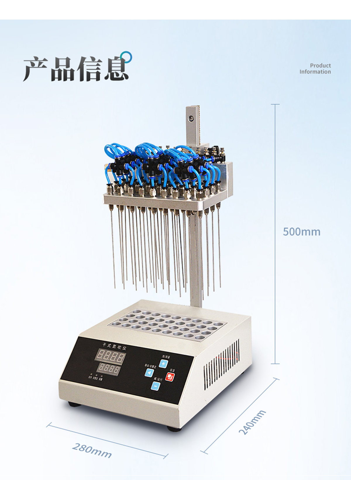 | 每個吹針都可以獨立控制,避免引起交叉污染。 | 儀器氣腔高度可以自行調(diào)節(jié),配備標(biāo)準(zhǔn)氣針長度為15厘米。 | 氮吹儀有36個氣道控制開關(guān),節(jié)約氣體,每根吹氣針的位置可獨立改變吹掃位置,使之適用不同的樣品容器及不同的樣品位置 | 在濃縮有毒溶劑時,整個系統(tǒng)可置于通風(fēng)柜中,降低危險。 | 內(nèi)置超溫保護裝置,自動故障檢測及報警功能,方便實用。 | 儀器有LED顯示屏,溫度同步顯示、時間遞減顯示,可時時觀察溫度變化。 | 具有整體溫度更均勻,加熱速度快 | 本產(chǎn)品還可以作為普通的干式恒溫器使用 | 使用起來更簡便,而且溫度也可以達到150℃,可以更好濃縮樣品 |