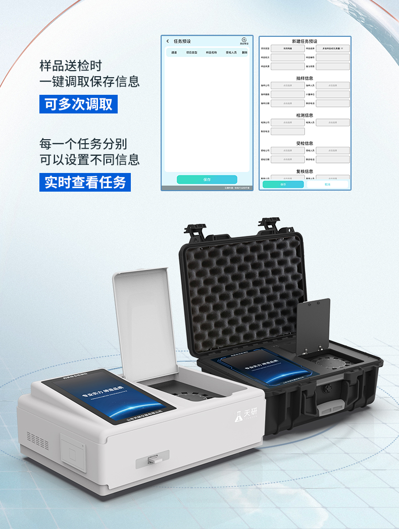 | 儀器采用臺式一體化系統(tǒng)檢測技術(shù),將分光光度模塊、膠體金檢測模塊、新型農(nóng)殘檢測模塊、數(shù)字化管理模塊、無線通訊模塊高度集成于一體,支持檢測200種食品安全檢測項目,同時預(yù)留升級檢測方法。 | 儀器檢測模塊標準化、智能化,可隨意自由組合。檢測箱體內(nèi)置多個標準檢測單元,檢測模塊可以調(diào)整配置。 | 儀器采用全新安卓智能系統(tǒng),主控芯片采用 ARM Cortex-A7,RK3288/4核處理器,10.1寸高清液晶觸摸豎屏,更加**的UI交互界面,運轉(zhuǎn)快捷;儀器配備無線通信模塊: 4G(APN)通訊模塊、Wifi模塊,藍牙傳輸,同時具有雙USB接口以及RJ45接口能以多種方式實現(xiàn)數(shù)據(jù)保存和數(shù)據(jù)傳輸功能。 | 創(chuàng)新檢測模式: | ★檢測通道:≥12通道;采用精密旋轉(zhuǎn)比色池設(shè)計,使用同芯片同光源校準精度,解決不同光源之間的誤差值。1-12通道間誤差0.1%。(**號:ZL202022821055.2) | ★儀器具有自動識別比色皿檢測功能,即:將樣品比色皿放入儀器后,點擊樣品檢測,儀器自動識別比色皿進行通道檢測。 | 進口高精光源: | 高精度進口四波長冷光源,通道配置 410、520、590、630nm 波長光源,一個光源芯片驅(qū)動一個光源,誤差極小,每臺設(shè)備單獨**校準光源,**比對,同時參照四種不同波段光源全方位覆蓋市面上99%的農(nóng)殘食品項目檢測。 | 膠體金模塊檢測方式: | 采用COMS實時成像技術(shù),可采集多個畫面,支持3個金標同時讀卡,通過不同顏色的灰度變化,一秒精準得出結(jié)果。 | 智能化操作系統(tǒng): | 便捷操作系統(tǒng):設(shè)備檢測時可在同一檢測界面自動對應(yīng)相關(guān)檢測通道一次性選擇1-12個樣品名稱,無須退出界面,節(jié)省操作時間。 | 數(shù)據(jù)集成系統(tǒng):設(shè)備首頁自動統(tǒng)計檢測數(shù)據(jù)包含:周檢測數(shù)據(jù)、月檢測數(shù)據(jù),全部檢測總數(shù)量,均包含檢測總數(shù),合格數(shù),不合格數(shù),以及相關(guān)柱形分析圖,對各項檢測數(shù)據(jù)清晰掌握,無需電腦查詢,更加快捷直觀。 | 項目預(yù)設(shè)系統(tǒng):支持添加單個及多個相同或不相同的任務(wù)預(yù)設(shè),一鍵快速調(diào)取,每一個任務(wù)分別可以設(shè)置不同的樣品、批次、編號、來源、備注、抽樣信息、檢測信息、受檢信息、復(fù)核信息等更多信息。無縫鏈接平臺和APP實時查看下發(fā)任務(wù)。 | 數(shù)據(jù)監(jiān)管系統(tǒng):同步對接監(jiān)管平臺,數(shù)據(jù)可局域網(wǎng)和互聯(lián)網(wǎng)數(shù)據(jù)上傳,檢測結(jié)果可選擇直接傳至食品安全監(jiān)管平臺。集成OSS輸出存儲服務(wù)、區(qū)分設(shè)備定向管理應(yīng)用,進行區(qū)域食品安全監(jiān)管及大數(shù)據(jù)分析處理與數(shù)據(jù)統(tǒng)計,檢測區(qū)域食品安全長短期動態(tài),達到食品安全問題預(yù)估、預(yù)警。 | 自定義打印系統(tǒng):內(nèi)置全新打印系統(tǒng),新創(chuàng)自定義打印方式,可按需靈活設(shè)置開啟或關(guān)閉:產(chǎn)品合格證(國家農(nóng)業(yè)部標準要求),二維碼,抽樣信息、檢測信息,受檢信息、復(fù)核信息、抽樣日期、檢測日期等信息的打印。 | 系統(tǒng)遠程更新功能:可定向分客戶分儀器更新系統(tǒng),按照不同客戶后期實際需求添加項目,無需機器返廠,即可遠程實時升級全新系統(tǒng),節(jié)省時間成本及避免運輸造成設(shè)備損壞。 | 儀器主機采用一體化防水、抗壓、防撞擊、防腐蝕箱體設(shè)計,同時配備交直流供電,可連接車載電源,可選配大容量充電鋰電池,滿足現(xiàn)場野外檢測需求。 | 安全證書,放心保障:儀器具有中國計量科學(xué)研究院校準證書,**認證。 |