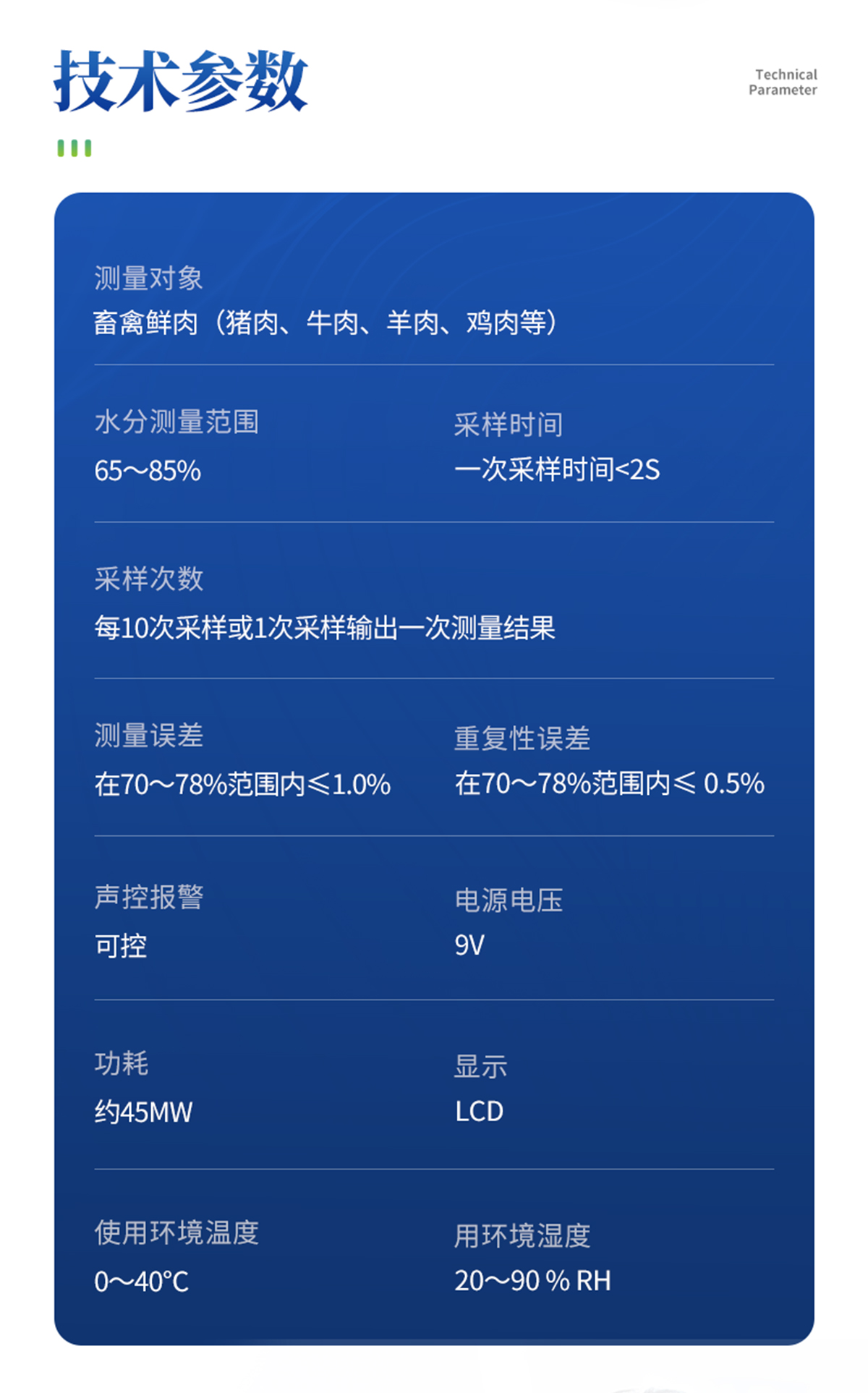肉類水分檢測儀主要用于快速豬肉、牛肉、雞肉等動(dòng)物肉類水分含量,從而判斷所測樣品是否為注水肉,該儀器設(shè)計(jì)精巧,單手可持,儀器可根據(jù)測定對象的品種,設(shè)定相應(yīng)的判斷標(biāo)準(zhǔn)值。