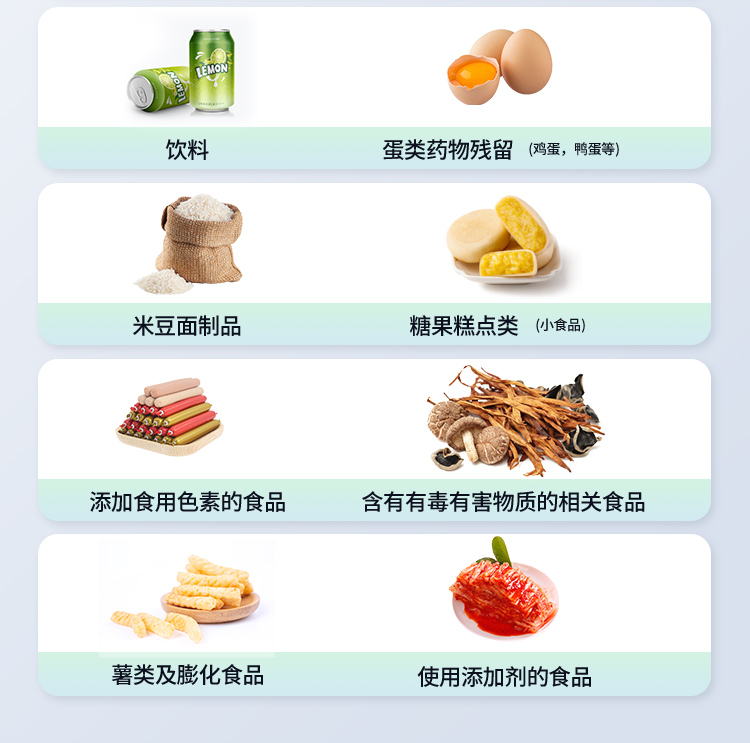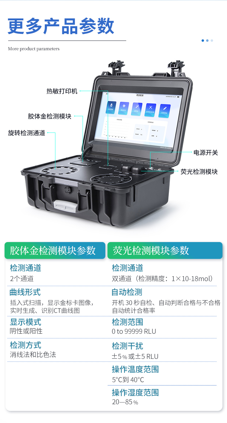 | 功能構(gòu)成:主要包括分光光度模塊、新型農(nóng)殘檢測模塊、膠體金檢測模塊、熒光檢測模塊、數(shù)字化管理模塊等,所有模塊集成一體,可快速檢測200多種食品安全項目,如獸藥殘留、農(nóng)藥殘留、非法添加劑、細菌數(shù)值等指標(biāo)。 | 檢測樣品種類:餐具及廚房用品、瓜果蔬菜及其制品、水產(chǎn)品及其制品、畜禽產(chǎn)品及其制品、嬰幼兒乳品及奶粉制品、蜂蜜、糧油及其制品、調(diào)味品(食醋、醬油、味精、鹽等)、酒類茶葉及其制品、食用菌、飲料、蛋類藥物殘留(雞蛋,鴨蛋等)、米豆面制品、糖果糕點類(小食品)、薯類及膨化食品、瓶(桶)裝飲用水、添加食用色素的食品、使用添加劑的食品、含有有毒有害物質(zhì)的相關(guān)食品。 | 顯示屏幕:儀器采用15.6英寸液晶觸摸屏顯,搭配運行安卓智能操作系統(tǒng),主控芯片采用ARM Cortex-A7,RK3288/4核處理器,主頻1.88Ghz,操作方便,性能更強。 | 供電模式:儀器交直流兩用,直流12V供電,可連接車載電源,配18ah大容量充電鋰電池,電量可實時顯示,無外部電源條件下可持續(xù)工作至少 4 小時。 | 檢測通道:≥24通道;采用精密旋轉(zhuǎn)比色池設(shè)計,使用同芯片同光源校準(zhǔn)精度,解決不同光源之間的誤差值,更加準(zhǔn)確**,采用高精度進口四波長冷光源,每個通道均配置 410、520、590、630nm 波長光源,標(biāo)配**的光路切換裝置,**光路切換功能可實現(xiàn)64波長,并且所有檢測項目可實現(xiàn)所有通道同時檢測. | 通訊接口:配備無線通信模塊、4G(APN)通訊模塊、藍牙傳輸,同時具有雙USB接口以及RJ45網(wǎng)線接口,可以多方式實現(xiàn)數(shù)據(jù)保存及數(shù)據(jù)傳輸。 | 存儲方式:支持U盤存儲,兩個標(biāo)準(zhǔn)USB接口,免驅(qū)動安裝。檢測結(jié)果存儲容量20萬條以上,可生成Excel表格進行拷貝,并具有登錄保護功能。 | 操作系統(tǒng):儀器可在同一檢測界面自動對應(yīng)相關(guān)檢測通道,一次性選擇不少于11個樣品名稱,無需退出界面,節(jié)省操作時間。并可以對每個通道屬性和樣品信息單獨進行編輯,例如送檢單位、人員,檢測人員等,打印時勾選打印顯示。 | 數(shù)據(jù)集成系統(tǒng):設(shè)備首頁自動匯總分析檢測數(shù)據(jù),包含:周檢測數(shù)據(jù)、月檢測數(shù)據(jù),全部檢測總數(shù)量,包含檢測總數(shù),合格數(shù),不合格數(shù),以及相關(guān)柱形分析圖,各項檢測數(shù)據(jù)一目了然,無需電腦查詢,更加快捷直觀。 | 數(shù)據(jù)庫系統(tǒng):十幾項數(shù)據(jù)庫分類管理儀器:包含項目類型、項目數(shù)據(jù)、檢測數(shù)據(jù)、歷史記錄、國標(biāo)信息、曲線信息、采樣信息、檢測信息、受檢信息、復(fù)核信息、圖表信息、光源校準(zhǔn)信息、打印樣式信息、樣品庫信息等等,數(shù)據(jù)庫之間互相協(xié)調(diào)聯(lián)動保證數(shù)據(jù)的真實完整性。同時產(chǎn)品數(shù)據(jù)庫以及歷史檢測記錄支持一鍵檢索功能。 | 限量規(guī)判系統(tǒng):具有限量查詢、添加物質(zhì)合規(guī)判定系統(tǒng)。檢測出結(jié)果后,系統(tǒng)自動調(diào)用系統(tǒng)數(shù)據(jù)庫中相關(guān)國標(biāo)進行比對判定,客觀顯示判定結(jié)果是否合格。 | 項目預(yù)設(shè)系統(tǒng):儀器具有任務(wù)預(yù)設(shè)模塊,一鍵提前預(yù)設(shè),給出方便快捷的新檢測方案,每一個任務(wù)分別可以設(shè)置不同的樣品、批次、編號、來源、備注、抽樣信息、檢測信息、受檢信息、復(fù)核信息等更多信息。樣品送檢時一鍵調(diào)取保存信息,并可多次調(diào)取,適用于大批量檢測業(yè)務(wù),可以大大提高檢測效率。 | 數(shù)據(jù)監(jiān)管系統(tǒng):同步對接監(jiān)管平臺,數(shù)據(jù)可局域網(wǎng)和互聯(lián)網(wǎng)數(shù)據(jù)上傳,檢測結(jié)果可直接傳至食品安全監(jiān)管平臺。進行區(qū)域食品安全監(jiān)管及大數(shù)據(jù)分析處理與數(shù)據(jù)統(tǒng)計,監(jiān)測區(qū)域食品安全長短期動態(tài)及問題預(yù)估、預(yù)警 | 全新打印系統(tǒng):內(nèi)置全新打印機,新創(chuàng)自定義打印方式,可按需靈活勾選控制:產(chǎn)品合格證(國家農(nóng)業(yè)部標(biāo)準(zhǔn)要求),二維碼,抽樣信息、檢測信息,受檢信息、復(fù)核信息、抽樣日期、檢測日期等信息的打印。 | A4紙版本報告打印功能:設(shè)備擁有兩種結(jié)果展示方式,可以自動生成A4打印模板和小票打印模板兩種樣式,可通過WiFi及網(wǎng)線等方式連接外置打印機可進行打印。 | 膠體金檢測模塊:采用單通道CMOS成像處理技術(shù)及膠體金免疫層析技術(shù),可讀取膠體金卡數(shù)據(jù),自動采集、處理分析,將檢測結(jié)果顯示,并可根據(jù)參考限值自動判斷檢測結(jié)果,可檢測常見的獸藥殘留、生物毒素、抗生素、違禁添加物等。 | 可即時檢測單聯(lián)卡及三聯(lián)卡; | 檢測通道:2個通道; | 檢測方式:消線法和比色法; | 顯示模式:陰性或陽性; | 曲線形式:插入式掃描方式,顯示金標(biāo)卡圖像,實時生成、識別CT曲線圖,無需手動調(diào)整。兼容市場上其他金標(biāo)卡,使用耗材不受限制。 | 熒光檢測模塊:快速檢測水質(zhì)中微生物、固體物細菌含量。利用“熒光素酶—熒光素體系”快速檢測三磷酸腺苷(ATP)。以ATP含量表明樣品中微生物與其他生物