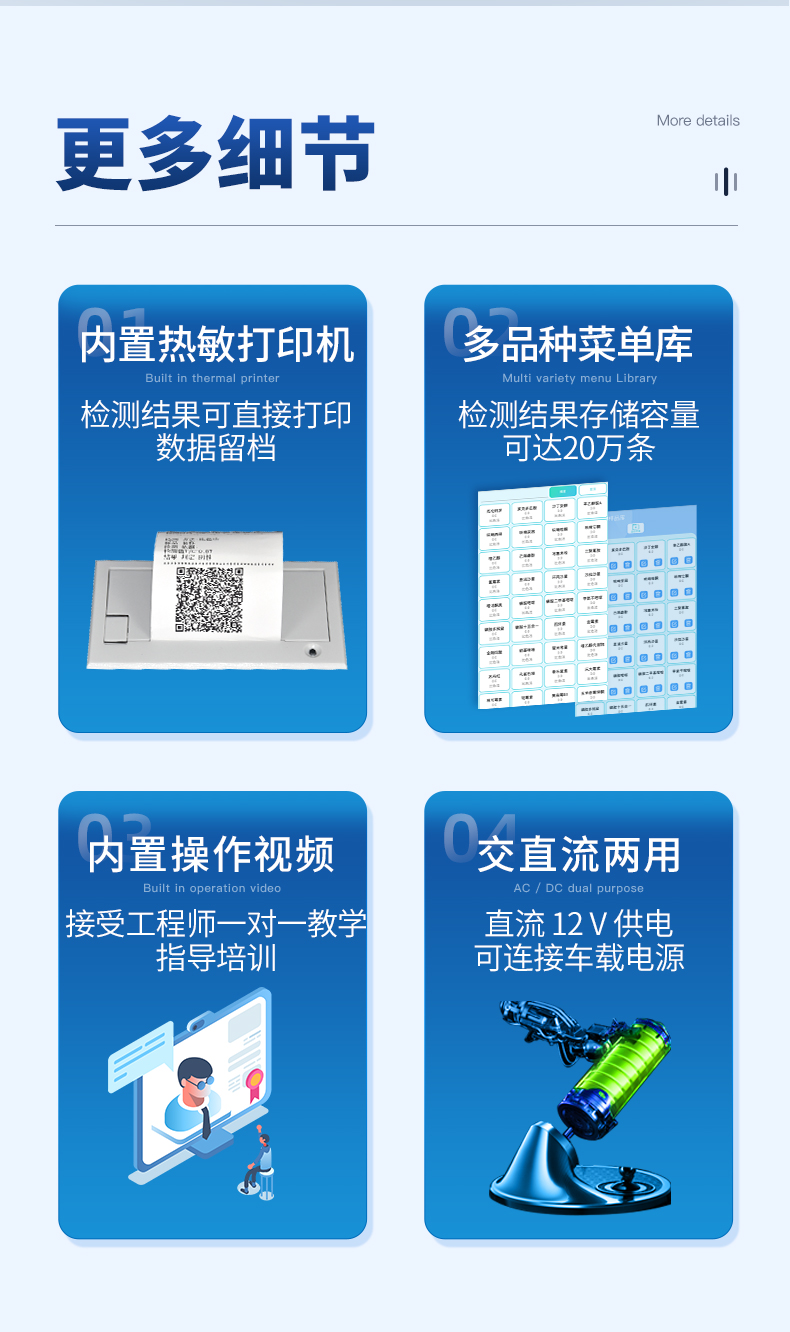 | 儀器采用10.1英寸液晶觸摸屏顯,搭配運(yùn)行安卓智能操作系統(tǒng),主控芯片采用ARM Cortex-A7,RK3288/4核處理器,主頻1.88Ghz,運(yùn)轉(zhuǎn)速度更快速,性能更強(qiáng)。 | 儀器功能包括:膠體金檢測(cè)模塊、數(shù)字化管理模塊、無(wú)線通訊模塊等,可以滿足同一軟件下實(shí)現(xiàn)所有檢測(cè)項(xiàng)目的檢測(cè),并在同一窗口展示檢測(cè)結(jié)果。 | 一體化便攜式快檢設(shè)備,采用交直流兩用供電方式,可連接車載電源,配備6ah大容量充電鋰電池,可以滿足現(xiàn)場(chǎng)及流動(dòng)檢測(cè)使用的需求。儀器尺寸:43×35×20cm, 主機(jī)凈重:5.1kg | 系統(tǒng)自帶數(shù)據(jù)集成模塊,設(shè)備首頁(yè)自動(dòng)統(tǒng)計(jì)檢測(cè)數(shù)據(jù)包含:周檢測(cè)數(shù)據(jù)、月檢測(cè)數(shù)據(jù),全部檢測(cè)總數(shù)量,均包含檢測(cè)總數(shù),合格數(shù),不合格數(shù),以及相關(guān)柱形分析圖,對(duì)各項(xiàng)檢測(cè)數(shù)據(jù)清晰掌握,無(wú)需電腦查詢,更加快捷直觀。 | 儀器具有任務(wù)預(yù)設(shè)模塊,可在樣品送檢前提前預(yù)設(shè)樣品名稱、檢測(cè)指標(biāo)、送檢單位等信息,樣品送檢時(shí)一鍵調(diào)取保存信息,檢測(cè)更加方便快捷。 | 膠體金檢測(cè)模塊:軌道式自動(dòng)傳輸掃描方式,可實(shí)時(shí)顯示金標(biāo)卡實(shí)時(shí)圖像,系統(tǒng)自動(dòng)分析并呈現(xiàn)出CT曲線圖,CT線自動(dòng)識(shí)別,無(wú)需手動(dòng)調(diào)整,完成檢測(cè)后自動(dòng)退出檢測(cè)卡。 結(jié)果判定線可修改,對(duì)照值標(biāo)定值可保存,斷電不丟失數(shù)據(jù)。 兼容市場(chǎng)上其他膠體金卡,使用耗材不受限制,極大增強(qiáng)用戶使用體驗(yàn)。 | 儀器檢測(cè)系統(tǒng)擁有龐大數(shù)據(jù)庫(kù),并且構(gòu)建了完善的檢索、修訂功能。食品庫(kù)涵蓋多種樣品名稱,可按需添加或刪除、編輯樣品名稱;產(chǎn)品數(shù)據(jù)庫(kù)以及歷史檢測(cè)記錄支持一鍵檢索功能。 | 系統(tǒng)打印自定義化,打印格式多樣化,產(chǎn)品合格證(國(guó)家標(biāo)準(zhǔn)要求),二維碼,抽樣信息、檢測(cè)信息,受檢信息、復(fù)核信息、抽樣日期、檢測(cè)日期等信息結(jié)果,可按需求自行設(shè)置打印內(nèi)容。 | A4紙版本報(bào)告打印功能(可選配):設(shè)備擁有兩種結(jié)果展示方式,可以自動(dòng)生成A4打印模板和小票打印模板兩種樣式,可通過(guò)WiFi及網(wǎng)線等方式鏈接外置打印機(jī)可進(jìn)行打印 | 儀器具有 wifi 聯(lián)網(wǎng)上傳、RJ45網(wǎng)線連接功能,可以快速上傳數(shù)據(jù)。同步對(duì)接監(jiān)管平臺(tái),數(shù)據(jù)可局域網(wǎng)和互聯(lián)網(wǎng)數(shù)據(jù)上傳,檢測(cè)結(jié)果直接傳至食品安全監(jiān)管平臺(tái)。進(jìn)行區(qū)域食品安全監(jiān)管及大數(shù)據(jù)分析處理與數(shù)據(jù)統(tǒng)計(jì),檢測(cè)區(qū)域食品安全長(zhǎng)短期動(dòng)態(tài),達(dá)到食品安全問(wèn)題預(yù)估、預(yù)警。 | 設(shè)備支持U盤存儲(chǔ),標(biāo)準(zhǔn)USB接口,免驅(qū)動(dòng)安裝。檢測(cè)結(jié)果存儲(chǔ)容量20萬(wàn)條以上,可生成Excel表格,進(jìn)行一鍵拷貝,并具有登錄保護(hù)功能,可設(shè)置用戶名及密碼,規(guī)范不同人員操作權(quán)限,防止非工作人員操作,并且可以進(jìn)行重新校準(zhǔn)、鎖定、恢復(fù)出廠設(shè)置功能。儀器固件可升級(jí),后期檢測(cè)項(xiàng)目可擴(kuò)充。 | 儀器具備遠(yuǎn)程升級(jí)功能,可定向分客戶分儀器更新,開(kāi)機(jī)后自動(dòng)更新,并可持續(xù)性免費(fèi)更新系統(tǒng)版本,無(wú)需像傳統(tǒng)產(chǎn)品返廠更新,節(jié)省時(shí)間及人力成本并避免了物流運(yùn)輸返廠升級(jí)導(dǎo)致設(shè)備損壞的潛在風(fēng)險(xiǎn)。 |