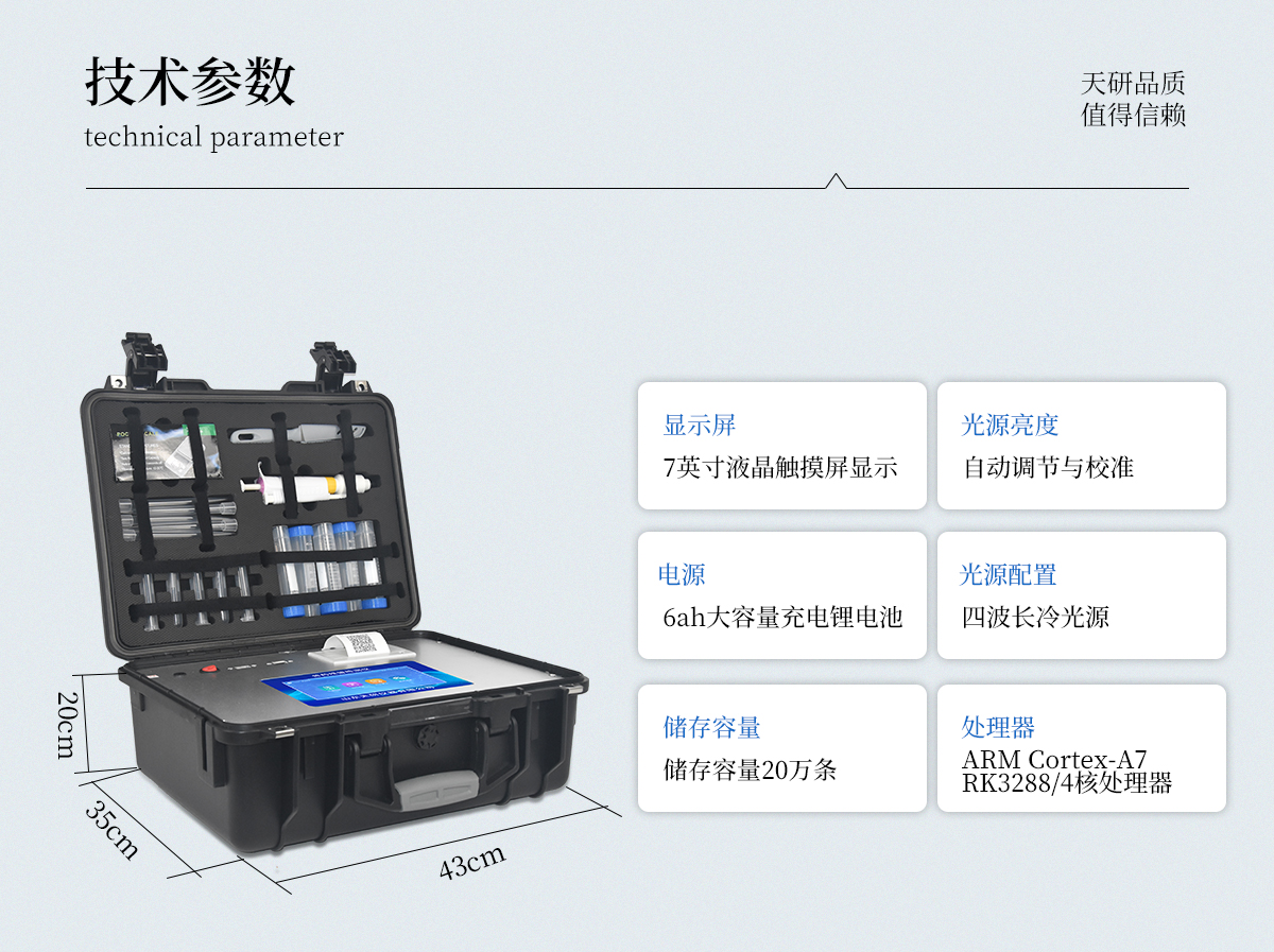 | 主控芯片采用ARM Cortex-A7,RK3288/4核處理器,主頻1.88Ghz,運(yùn)轉(zhuǎn)速度更快速,穩(wěn)定性更強(qiáng)。 | 顯示方式:7英寸液晶觸摸屏顯示,人性化中文操作界面,讀數(shù)直觀、簡單。 | 交直流兩用,直流12V供電,可連接車載電源,可配6ah大容量充電鋰電池,方便戶外流動(dòng)測試。 | 光源亮度自動(dòng)調(diào)節(jié)與校準(zhǔn) | 智能恒流穩(wěn)壓,光強(qiáng)自動(dòng)校準(zhǔn),長時(shí)間連續(xù)工作光源無溫漂現(xiàn)象。 | 內(nèi)置新國家限量標(biāo)準(zhǔn),與所測結(jié)果進(jìn)行現(xiàn)場比對(duì),并持續(xù)更新標(biāo)準(zhǔn)。 | 不間斷進(jìn)樣,連續(xù)檢測 | 樣本編號(hào)自動(dòng)累加。 | 檢測項(xiàng)目可擴(kuò)充。 | 檢測結(jié)果可批量打印,批量上傳。 | 檢測結(jié)果為Excel表格,連接電腦即可拷貝。 | 檢測結(jié)果存儲(chǔ)容量20萬條 | 標(biāo)準(zhǔn)USB接口,免驅(qū)動(dòng)安裝。 | 固件可升級(jí) |