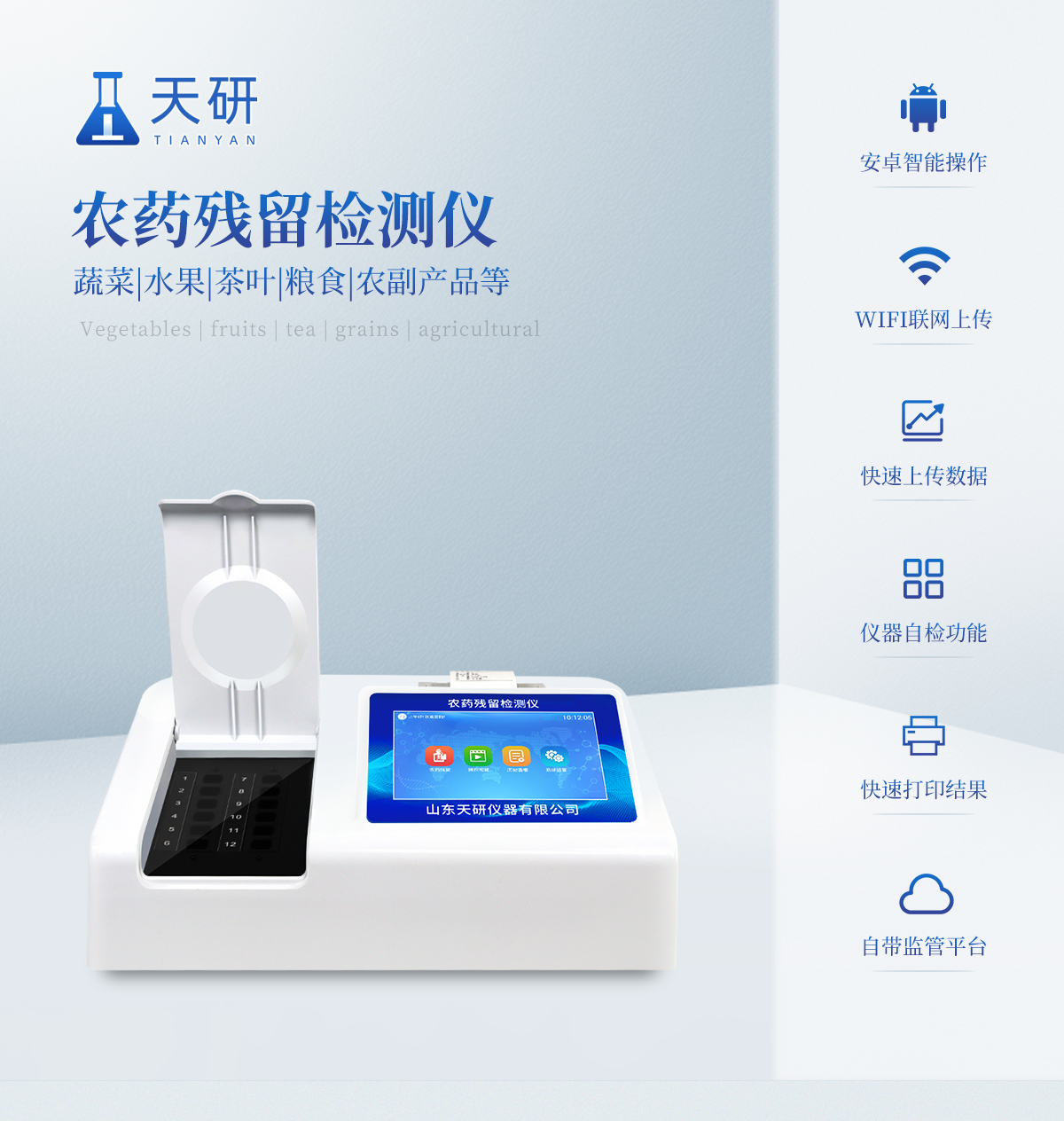 | 乙酰膽堿酯酶和丁酰膽堿酯酶試劑均可以使用,符合國家標準和農(nóng)業(yè)部標準的要求。 | 自動判斷樣品是否合格,檢測結(jié)果更加直觀。 | 儀器具有100多種蔬菜名稱菜單庫,分類管理,并可按需添加或刪除蔬菜名,編輯蔬菜名稱,可直接打印出蔬菜名稱。 | 檢測通道:12個檢測通道,可以同時測試多個樣品,循環(huán)檢測,即放即檢,每個樣品由程序控制分別獨立工作,不會互相干擾。 | 智能操作系統(tǒng),采用更加人性化操作,主控采用多核處理器,主頻1.88Ghz,運轉(zhuǎn)速度更快速,穩(wěn)定性更強。 | 顯示方式:7英寸高靈敏真彩觸摸屏顯示,人性化中文操作界面,讀數(shù)直觀、簡單。 | 打印機采用串口5v打印,可選擇手動打印或者自動打印,三分鐘出打印結(jié)果,打印格式為檢測人姓名、吸光度差值、檢測時間、檢測機構(gòu)、樣品名稱及結(jié)果判定。 | 光源采用進口超高亮發(fā)光二極管,具有低功耗、高精度、穩(wěn)定性強、光源可控可以關(guān)掉不使用的光源,響應(yīng)速度快等優(yōu)點。 | 智能恒流穩(wěn)壓,光強自動校準,長時間連續(xù)工作光源無溫漂現(xiàn)象。 | 儀器具有GPRS遠傳功能,可插手機卡實現(xiàn)數(shù)據(jù)遠傳平臺,wifi聯(lián)網(wǎng)功能,可將數(shù)據(jù)快速上傳電腦,進行數(shù)據(jù)管理與統(tǒng)計。 | 采用USB2.0接口設(shè)計,方便數(shù)據(jù)的存貯和移動,并可隨時與計算機直接相連,并且可用計算機控制儀器。實現(xiàn)數(shù)據(jù)查詢、瀏覽、分析、統(tǒng)計、打印等。 | 智能化程度高,儀器具有自檢功能:具有開機自檢和調(diào)零功能,具有自動檢測重復(fù)性功能 | 儀器具有自身保護功能,可設(shè)置用戶名及密碼,防止非工作人員操作等。 | 采用DC12v直流供電,安全系統(tǒng)更高,并且配備6A鋰電池充電器。 | 儀器具有重新校準、鎖定、恢復(fù)出廠設(shè)置功能。 |