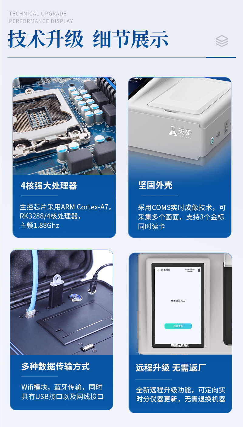 | 儀器采用臺式一體化系統(tǒng)檢測技術(shù),將分光光度模塊、數(shù)字化管理模塊、無線通訊模塊高度集成于一體,可支持檢測60種食品安全檢測項目,同時預(yù)留升級檢測方法。 | 儀器檢測模塊標準化、智能化,檢測項目可隨意自由組合。檢測箱體內(nèi)置多個標準檢測單元,檢測模塊可以調(diào)整配置。 | 顯示屏幕:儀器采用10.1英寸豎向液晶觸摸屏顯,搭配運行安卓智能操作系統(tǒng),主控芯片采用ARM Cortex-A7,RK3288/4核處理器,主頻1.88Ghz,操作方便,性能更強。 | 檢測通道:≥12通道;采用精密旋轉(zhuǎn)比色池設(shè)計,使用同芯片同光源校準精度,解決不同光源之間的誤差值,更加準確**。(1-12通道間誤差0.1%,**號:ZL202022821055.2) | 儀器光源:高精度進口四波長冷光源,每個通道均配置 410、520、590、630nm 波長光源,標配**的光路切換裝置,**光路切換功能可實現(xiàn)64波長,并且所有檢測項目可實現(xiàn)所有通道同時檢測。 | 設(shè)備可一鍵校準,自動保存校準數(shù)據(jù),自動對比校驗,得到精準光源,采用Android SP存儲數(shù)據(jù),光源數(shù)據(jù)永不丟失,方便每一次使用。 | 通訊接口:配備無線通信模塊、4G(APN)通訊模塊、藍牙傳輸,同時具有雙USB接口以及RJ45網(wǎng)線接口,可以多方式實現(xiàn)數(shù)據(jù)保存及數(shù)據(jù)傳輸。 | 存儲方式:支持U盤存儲,標準USB接口,免驅(qū)動安裝。檢測結(jié)果存儲容量20萬條以上,可生成Excel表格進行拷貝,并具有登錄保護功能。 | 智能化操作系統(tǒng): | 1、操作系統(tǒng):儀器可在同一檢測界面自動對應(yīng)相關(guān)檢測通道,一次性選擇1-12個樣品名稱,無需退出界面,節(jié)省操作時間。并可以對每個通道屬性和樣品信息單獨進行編輯,例如送檢單位、人員,檢測人員等,打印時勾選打印顯示。 | 2、數(shù)據(jù)集成系統(tǒng):設(shè)備首頁自動匯總分析檢測數(shù)據(jù),包含:周檢測數(shù)據(jù)、月檢測數(shù)據(jù),全部檢測總數(shù)量,均包含檢測總數(shù),合格數(shù),不合格數(shù),以及相關(guān)柱形分析圖,各項檢測數(shù)據(jù)一目了然,無需電腦查詢,更加快捷直觀。 | 3、數(shù)據(jù)庫系統(tǒng):十幾項數(shù)據(jù)庫分類管理儀器:包含項目類型、項目數(shù)據(jù)、檢測數(shù)據(jù)、歷史記錄、國標信息、曲線信息、采樣信息、檢測信息、受檢信息、復(fù)核信息、圖表信息、光源校準信息、打印樣式信息、樣品庫信息等等,數(shù)據(jù)庫之間互相協(xié)調(diào)聯(lián)動保證數(shù)據(jù)的真實完整性。同時產(chǎn)品數(shù)據(jù)庫以及歷史檢測記錄支持一鍵檢索功能。 | 4、限量規(guī)判系統(tǒng):具有限量查詢、添加物質(zhì)合規(guī)判定系統(tǒng)。檢測出結(jié)果后,系統(tǒng)自動調(diào)用系統(tǒng)數(shù)據(jù)庫中相關(guān)國標進行比對判定,客觀顯示判定結(jié)果是否合格。 | 5、項目預(yù)設(shè)系統(tǒng):儀器具有任務(wù)預(yù)設(shè)模塊,一鍵提前預(yù)設(shè),給出方便快捷的新檢測方案,每一個任務(wù)分別可以設(shè)置不同的樣品、批次、編號、來源、備注、抽樣信息、檢測信息、受檢信息、復(fù)核信息等更多信息。樣品送檢時一鍵調(diào)取保存信息,并可多次調(diào)取,大大提高檢測效率。 | 6、數(shù)據(jù)監(jiān)管系統(tǒng):同步對接監(jiān)管平臺,數(shù)據(jù)可局域網(wǎng)和互聯(lián)網(wǎng)數(shù)據(jù)上傳,檢測結(jié)果可選擇直接傳至食品安全監(jiān)管平臺。進行區(qū)域食品安全監(jiān)管及大數(shù)據(jù)分析處理與數(shù)據(jù)統(tǒng)計,檢測區(qū)域食品安全長短期動態(tài),達到食品安全問題預(yù)估、預(yù)警。 | 7.1、全新打印系統(tǒng):內(nèi)置全新打印機,新創(chuàng)自定義打印方式,可按需靈活勾選控制:二維碼,抽樣信息、檢測信息,受檢信息、復(fù)核信息、抽樣日期、檢測日期等信息的打印。 | 7.2、A4紙版本報告打印功能(可選配):設(shè)備擁有兩種結(jié)果展示方式,可以自動生成A4打印模板和小票打印模板兩種樣式,可通過WiFi及網(wǎng)線等方式鏈接外置打印機可進行打印。 | 8.供電模式:儀器交直流兩用,直流12V供電,可連接車載電源,可配6ah大容量充電鋰電池,電量可實時顯示,方便戶外流動測試。 | 9.儀器具備遠程升級功能,可定向分客戶分儀器更新,開機后自動更新,并可持續(xù)性免費更新系統(tǒng)版本,無需像傳統(tǒng)產(chǎn)品返廠更新,節(jié)省時間及人力成本并避免了物流運輸返廠升級導(dǎo)致設(shè)備損壞的潛在風(fēng)險。 |