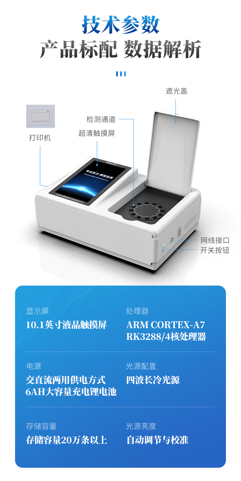 | 儀器采用臺式一體化系統(tǒng)檢測技術(shù),將分光光度模塊、新型農(nóng)殘檢測模塊、數(shù)字化管理模塊、無線通訊模塊高度集成于一體,支持檢測200種食品安全檢測項目,同時預(yù)留升級檢測方法。 | 儀器檢測模塊標(biāo)準(zhǔn)化、智能化,可隨意自由組合。檢測箱體內(nèi)置多個標(biāo)準(zhǔn)檢測單元,檢測模塊可以調(diào)整配置。 | 儀器采用全新安卓智能系統(tǒng),主控芯片采用 ARM Cortex-A7,RK3288/4核處理器,10.1寸高清液晶觸摸豎屏,更加**的UI交互界面,運轉(zhuǎn)快捷;儀器配備無線通信模塊: 4G(APN)通訊模塊、Wifi模塊,藍(lán)牙傳輸,同時具有雙USB接口以及RJ45接口能以多種方式實現(xiàn)數(shù)據(jù)保存和數(shù)據(jù)傳輸功能。 | 創(chuàng)新檢測模式: | ★檢測通道:≥12通道;采用精密旋轉(zhuǎn)比色池設(shè)計,使用同芯片同光源校準(zhǔn)精度,解決不同光源之間的誤差值。1-12通道間誤差0.1%。(**號:ZL202022821055.2) | ★儀器具有自動識別比色皿檢測功能,即:將樣品比色皿放入儀器后,點擊樣品檢測,儀器自動識別比色皿進行通道檢測。 | 進口高精光源: | 高精度進口四波長冷光源,通道配置 410、520、590、630nm 波長光源,一個光源芯片驅(qū)動一個光源,誤差極小,每臺設(shè)備單獨**校準(zhǔn)光源,**比對,同時參照四種不同波段光源全方位覆蓋市面上99%的農(nóng)殘食品項目檢測。 | 智能化操作系統(tǒng): | 便捷操作系統(tǒng):設(shè)備檢測時可在同一檢測界面自動對應(yīng)相關(guān)檢測通道一次性選擇1-12個樣品名稱,無須退出界面,節(jié)省操作時間。 | 數(shù)據(jù)集成系統(tǒng):設(shè)備首頁自動統(tǒng)計檢測數(shù)據(jù)包含:周檢測數(shù)據(jù)、月檢測數(shù)據(jù),全部檢測總數(shù)量,均包含檢測總數(shù),合格數(shù),不合格數(shù),以及相關(guān)柱形分析圖,對各項檢測數(shù)據(jù)清晰掌握,無需電腦查詢,更加快捷直觀。 | 項目預(yù)設(shè)系統(tǒng):支持添加單個及多個相同或不相同的任務(wù)預(yù)設(shè),一鍵快速調(diào)取,每一個任務(wù)分別可以設(shè)置不同的樣品、批次、編號、來源、備注、抽樣信息、檢測信息、受檢信息、復(fù)核信息等更多信息。無縫鏈接平臺和APP實時查看下發(fā)任務(wù)。 | 數(shù)據(jù)監(jiān)管系統(tǒng):同步對接監(jiān)管平臺,數(shù)據(jù)可局域網(wǎng)和互聯(lián)網(wǎng)數(shù)據(jù)上傳,檢測結(jié)果可選擇直接傳至食品安全監(jiān)管平臺。集成OSS輸出存儲服務(wù)、區(qū)分設(shè)備定向管理應(yīng)用,進行區(qū)域食品安全監(jiān)管及大數(shù)據(jù)分析處理與數(shù)據(jù)統(tǒng)計,檢測區(qū)域食品安全長短期動態(tài),達到食品安全問題預(yù)估、預(yù)警。 | 自定義打印系統(tǒng):內(nèi)置全新打印系統(tǒng),新創(chuàng)自定義打印方式,可按需靈活設(shè)置開啟或關(guān)閉:產(chǎn)品合格證(國家農(nóng)業(yè)部標(biāo)準(zhǔn)要求),二維碼,抽樣信息、檢測信息,受檢信息、復(fù)核信息、抽樣日期、檢測日期等信息的打印。 | 系統(tǒng)遠(yuǎn)程更新功能:可定向分客戶分儀器更新系統(tǒng),按照不同客戶后期實際需求添加項目,無需機器返廠,即可遠(yuǎn)程實時升級全新系統(tǒng),節(jié)省時間成本及避免運輸造成設(shè)備損壞。 | 儀器主機采用一體化防水、抗壓、防撞擊、防腐蝕箱體設(shè)計,同時配備交直流供電,可連接車載電源,可選配大容量充電鋰電池,滿足現(xiàn)場野外檢測需求。 | 安全證書,放心保障:儀器具有中國計量科學(xué)研究院校準(zhǔn)證書,**認(rèn)證。 |