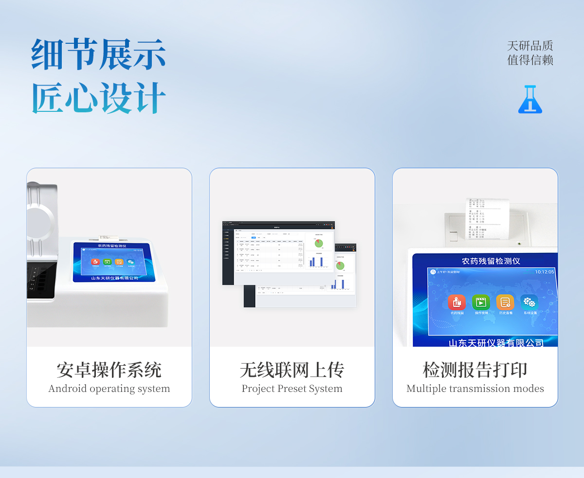 | 乙酰膽堿酯酶和丁酰膽堿酯酶試劑均可以使用,符合國家標(biāo)準(zhǔn)和農(nóng)業(yè)部標(biāo)準(zhǔn)的要求。 | 自動判斷樣品是否合格,檢測結(jié)果更加直觀。 | 儀器具有100多種蔬菜名稱菜單庫,分類管理,并可按需添加或刪除蔬菜名,編輯蔬菜名稱,可直接打印出蔬菜名稱。 | 檢測通道:12個檢測通道,可以同時測試多個樣品,循環(huán)檢測,即放即檢,每個樣品由程序控制分別獨立工作,不會互相干擾。 | 智能操作系統(tǒng),采用更加人性化操作,主控采用多核處理器,主頻1.88Ghz,運(yùn)轉(zhuǎn)速度更快速,穩(wěn)定性更強(qiáng)。 | 顯示方式:7英寸高靈敏真彩觸摸屏顯示,人性化中文操作界面,讀數(shù)直觀、簡單。 | 打印機(jī)采用串口5v打印,可選擇手動打印或者自動打印,三分鐘出打印結(jié)果,打印格式為檢測人姓名、吸光度差值、檢測時間、檢測機(jī)構(gòu)、樣品名稱及結(jié)果判定。 | 光源采用進(jìn)口超高亮發(fā)光二極管,具有低功耗、高精度、穩(wěn)定性強(qiáng)、光源可控可以關(guān)掉不使用的光源,響應(yīng)速度快等優(yōu)點。 | 智能恒流穩(wěn)壓,光強(qiáng)自動校準(zhǔn),長時間連續(xù)工作光源無溫漂現(xiàn)象。 | 儀器具有GPRS遠(yuǎn)傳功能,可插手機(jī)卡實現(xiàn)數(shù)據(jù)遠(yuǎn)傳平臺,wifi聯(lián)網(wǎng)功能,可將數(shù)據(jù)快速上傳電腦,進(jìn)行數(shù)據(jù)管理與統(tǒng)計。 | 采用USB2.0接口設(shè)計,方便數(shù)據(jù)的存貯和移動,并可隨時與計算機(jī)直接相連,并且可用計算機(jī)控制儀器。實現(xiàn)數(shù)據(jù)查詢、瀏覽、分析、統(tǒng)計、打印等。 | 智能化程度高,儀器具有自檢功能:具有開機(jī)自檢和調(diào)零功能,具有自動檢測重復(fù)性功能 | 儀器具有自身保護(hù)功能,可設(shè)置用戶名及密碼,防止非工作人員操作等。 | 采用DC12v直流供電,安全系統(tǒng)更高,并且配備6A鋰電池充電器。 | 儀器具有重新校準(zhǔn)、鎖定、恢復(fù)出廠設(shè)置功能。 |