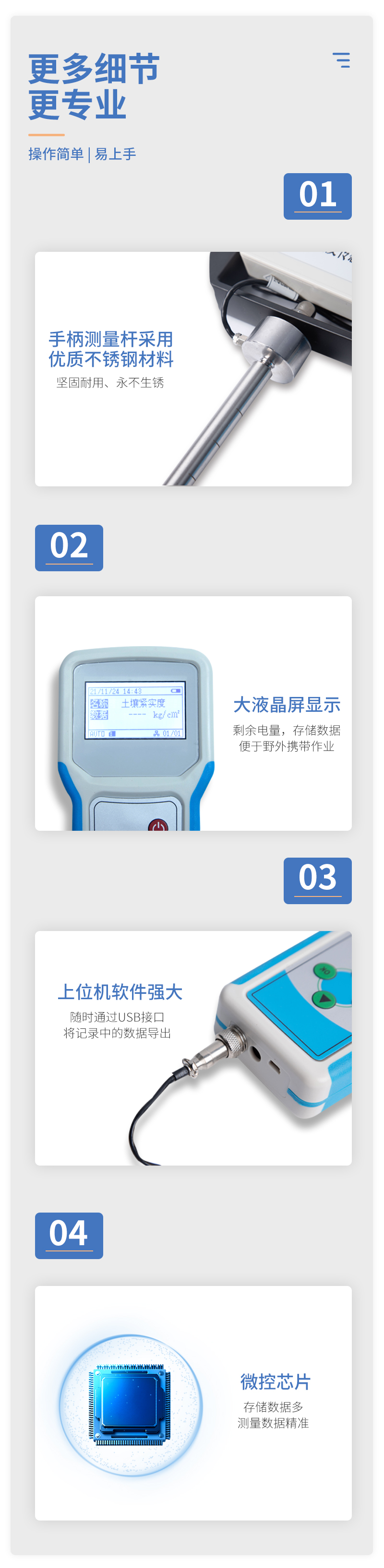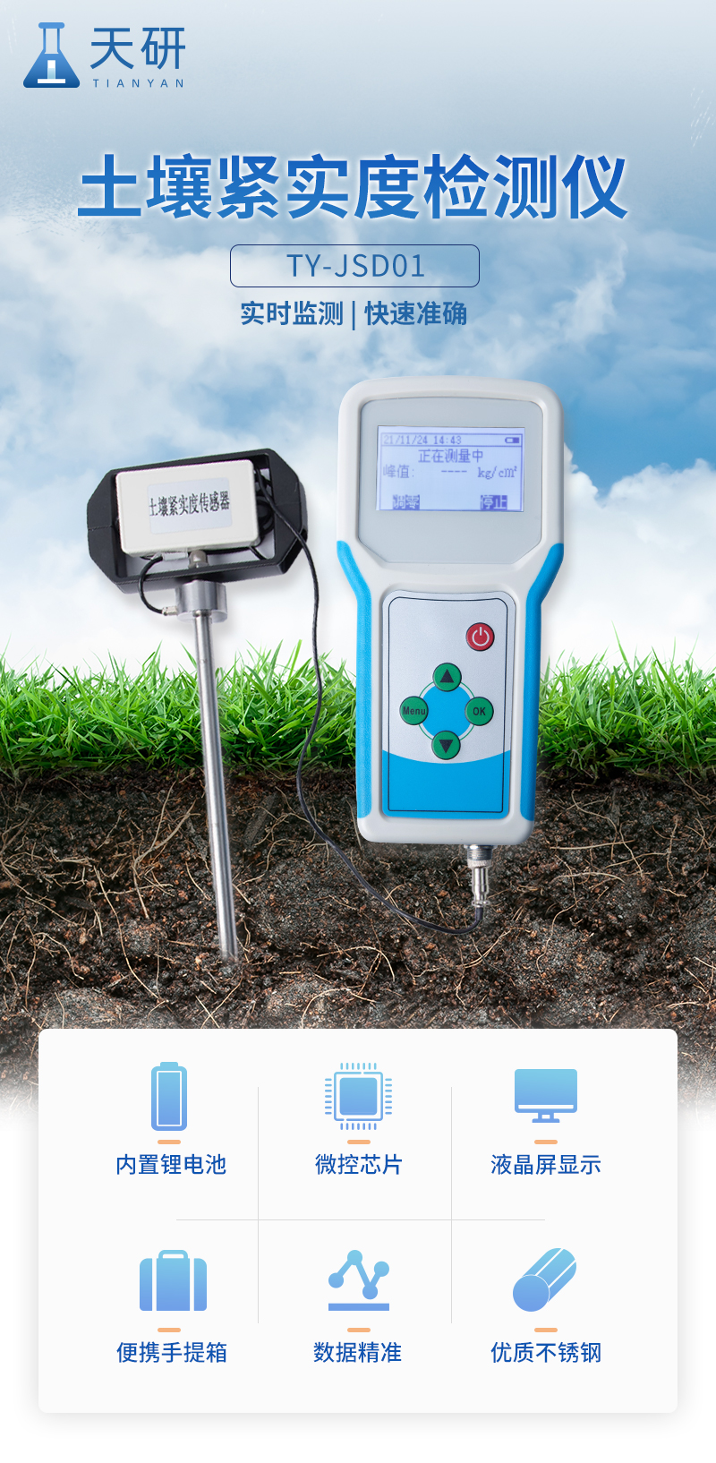 土壤緊實度又叫土壤硬度或土壤堅實度或土壤穿透阻力。一般用金屬柱塞或探針壓入土壤時的阻力表示(單位為Pa)。土壤緊實度是指土壤抵抗外力的壓實和破碎的能力,是土壤性質(zhì)的其中一個方面。另外,土壤物理性包括土壤質(zhì)地、結(jié)構(gòu)、孔隙性等,涉及到土壤的堅實度、塑性、通透性、排水、蓄水能力、根系穿透的難易等。