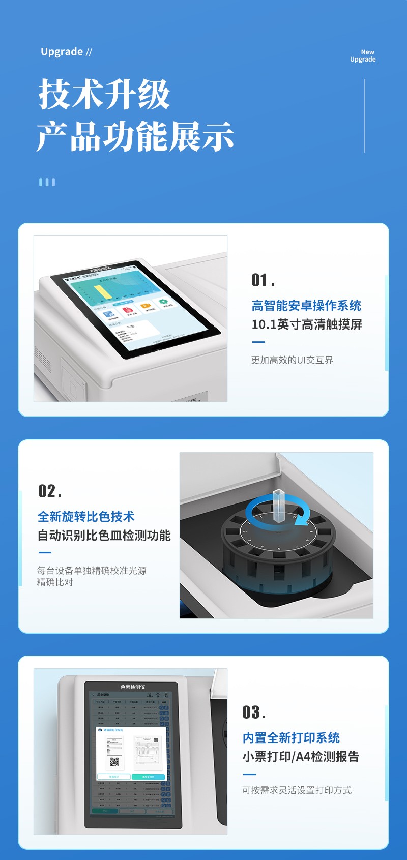 | 儀器采用臺式一體化系統(tǒng)檢測技術(shù),將分光光度模塊、新型農(nóng)殘檢測模塊、數(shù)字化管理模塊、無線通訊模塊高度集成于一體,支持檢測200種食品安全檢測項目,同時預(yù)留升級檢測方法。 | 儀器檢測模塊標準化、智能化,可隨意自由組合。檢測箱體內(nèi)置多個標準檢測單元,檢測模塊可以調(diào)整配置。 | 儀器采用全新安卓智能系統(tǒng),主控芯片采用 ARM Cortex-A7,RK3288/4核處理器,10.1寸高清液晶觸摸豎屏,更加**的UI交互界面,運轉(zhuǎn)快捷;儀器配備無線通信模塊: 4G(APN)通訊模塊、Wifi模塊,藍牙傳輸,同時具有雙USB接口以及RJ45接口能以多種方式實現(xiàn)數(shù)據(jù)保存和數(shù)據(jù)傳輸功能。 | 創(chuàng)新檢測模式: | ★檢測通道:≥12通道;采用精密旋轉(zhuǎn)比色池設(shè)計,使用同芯片同光源校準精度,解決不同光源之間的誤差值。1-12通道間誤差0.1%。(**號:ZL202022821055.2) | ★儀器具有自動識別比色皿檢測功能,即:將樣品比色皿放入儀器后,點擊樣品檢測,儀器自動識別比色皿進行通道檢測。 | 進口高精光源: | 高精度進口四波長冷光源,通道配置 410、520、590、630nm 波長光源,一個光源芯片驅(qū)動一個光源,誤差極小,每臺設(shè)備單獨**校準光源,**比對,同時參照四種不同波段光源全方位覆蓋市面上99%的農(nóng)殘食品項目檢測。 | 智能化操作系統(tǒng): | 便捷操作系統(tǒng):設(shè)備檢測時可在同一檢測界面自動對應(yīng)相關(guān)檢測通道一次性選擇1-12個樣品名稱,無須退出界面,節(jié)省操作時間。 | 數(shù)據(jù)集成系統(tǒng):設(shè)備首頁自動統(tǒng)計檢測數(shù)據(jù)包含:周檢測數(shù)據(jù)、月檢測數(shù)據(jù),全部檢測總數(shù)量,均包含檢測總數(shù),合格數(shù),不合格數(shù),以及相關(guān)柱形分析圖,對各項檢測數(shù)據(jù)清晰掌握,無需電腦查詢,更加快捷直觀。 | 項目預(yù)設(shè)系統(tǒng):支持添加單個及多個相同或不相同的任務(wù)預(yù)設(shè),一鍵快速調(diào)取,每一個任務(wù)分別可以設(shè)置不同的樣品、批次、編號、來源、備注、抽樣信息、檢測信息、受檢信息、復(fù)核信息等更多信息。無縫鏈接平臺和APP實時查看下發(fā)任務(wù)。 | 數(shù)據(jù)監(jiān)管系統(tǒng):同步對接監(jiān)管平臺,數(shù)據(jù)可局域網(wǎng)和互聯(lián)網(wǎng)數(shù)據(jù)上傳,檢測結(jié)果可選擇直接傳至食品安全監(jiān)管平臺。集成OSS輸出存儲服務(wù)、區(qū)分設(shè)備定向管理應(yīng)用,進行區(qū)域食品安全監(jiān)管及大數(shù)據(jù)分析處理與數(shù)據(jù)統(tǒng)計,檢測區(qū)域食品安全長短期動態(tài),達到食品安全問題預(yù)估、預(yù)警。 | 自定義打印系統(tǒng):內(nèi)置全新打印系統(tǒng),新創(chuàng)自定義打印方式,可按需靈活設(shè)置開啟或關(guān)閉:產(chǎn)品合格證(國家農(nóng)業(yè)部標準要求),二維碼,抽樣信息、檢測信息,受檢信息、復(fù)核信息、抽樣日期、檢測日期等信息的打印。 | 系統(tǒng)遠程更新功能:可定向分客戶分儀器更新系統(tǒng),按照不同客戶后期實際需求添加項目,無需機器返廠,即可遠程實時升級全新系統(tǒng),節(jié)省時間成本及避免運輸造成設(shè)備損壞。 | 儀器主機采用一體化防水、抗壓、防撞擊、防腐蝕箱體設(shè)計,同時配備交直流供電,可連接車載電源,可選配大容量充電鋰電池,滿足現(xiàn)場野外檢測需求。 | 安全證書,放心保障:儀器具有中國計量科學研究院校準證書,**認證。 |