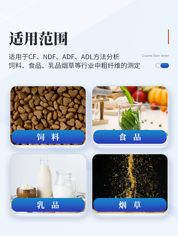 適用于CF、NDF、ADF、ADL方法分析飼料、食品、乳品煙草等行業(yè)中粗纖維的測定。