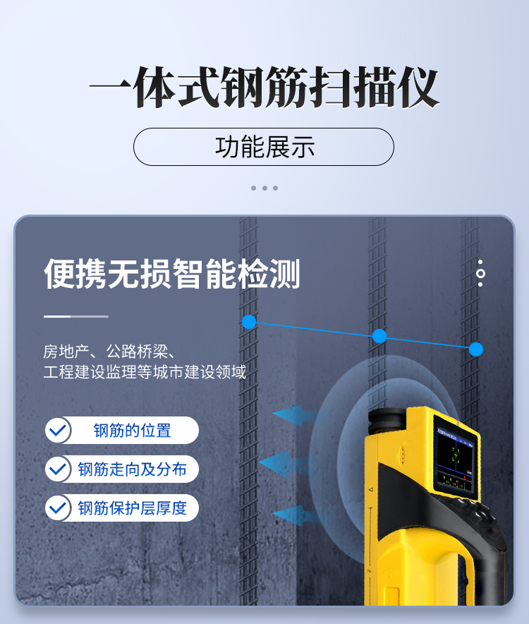 產(chǎn)品簡(jiǎn)介:該機(jī)為內(nèi)置一體式探頭,無(wú)須連接引線,可手持直接操作是一種便攜式無(wú)損鋼筋保護(hù)層厚度檢測(cè)儀器。可用于鋼筋混凝土結(jié)構(gòu)施工質(zhì)量的檢測(cè)。能夠在混凝土表面確定鋼筋的位置、布筋情況,測(cè)量混凝土保護(hù)層厚度,此外也可對(duì)混凝土結(jié)構(gòu)中的磁性體及導(dǎo)電體的位置進(jìn)行檢測(cè),如墻體內(nèi)的電纜、水暖管道等,施工前的探測(cè)可以有效