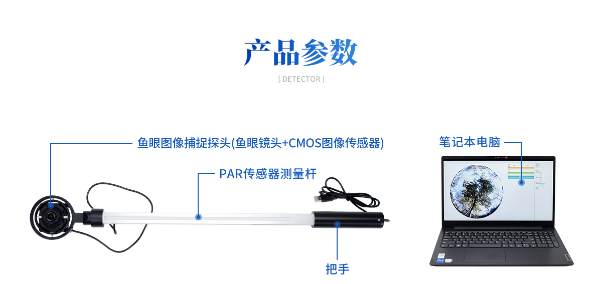 植物冠層圖像分析儀由魚眼圖像捕捉探頭(由魚眼鏡頭及CCD圖像傳感器組成)、內置25個PAR傳感器的測量桿(搖臂)、筆記本電腦、圖像采集軟件及圖像 分析軟件組成。魚眼探頭安裝在一個很輕的搖臂的頂端,它可以獲取150°視角的魚眼圖像。圖像的顯示和存貯由配置的筆記本計算機完成。
