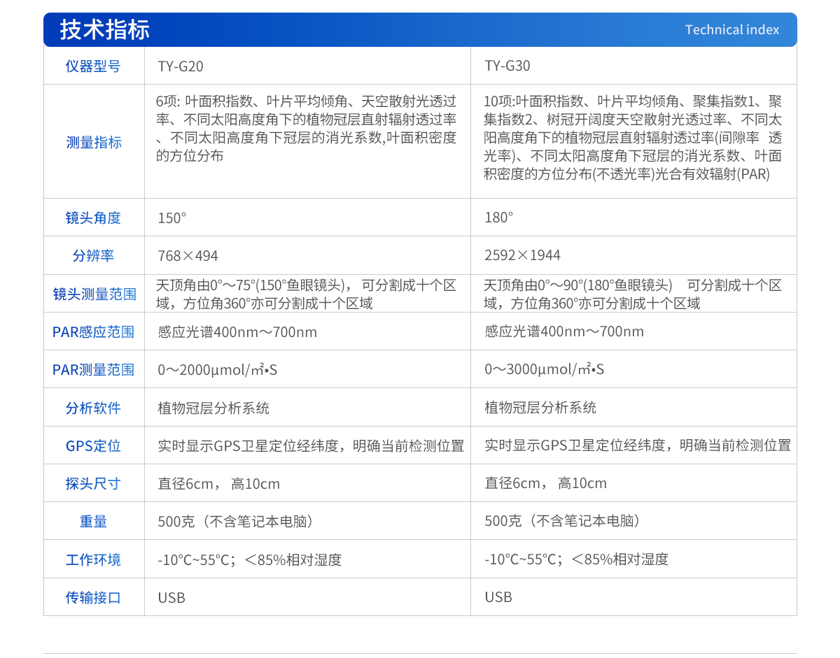 | 1.鏡頭角度:150° | 2.分辨率:768×494 | 3.測量范圍:天頂角由0°~75°(150°魚眼鏡頭)可分割成十個區(qū)域,方位角360°亦可分割成十個區(qū)域 | 4.PAR感應范圍:感應光譜400nm~700nm | 5.測量范圍0~2000μmol/㎡?S | 6.實時顯示GPS衛(wèi)星定位經緯度,明確當前檢測位置 | 7.檢測結果可直接傳至專屬云農業(yè)數據中心,配備專屬云農業(yè)數據中心賬戶 | 8.分析軟件:植物冠層分析系統(tǒng) | 9.探頭尺寸:直徑6cm,高10cm | 10.總 重 量:500克(不含筆記本電腦) | 11.傳輸接口:USB | 12.工作溫度:0~55℃ |