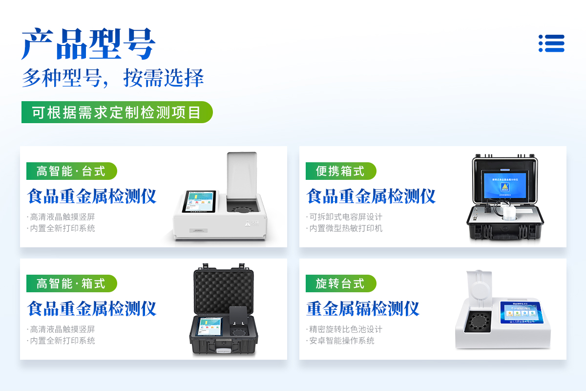 重金屬檢測(cè)儀可廣泛應(yīng)用于大米、糧谷、果品、蔬菜、藥材、水質(zhì)、水產(chǎn)品中重金屬鎘的快速檢測(cè),檢測(cè)項(xiàng)目可根據(jù)客戶的需求定制。