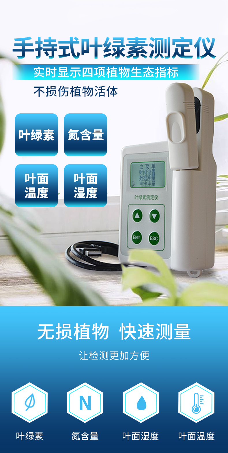 儀器用途:葉綠素測(cè)定儀可 以即時(shí)測(cè)量植物的葉綠素相對(duì)含量(單位SPAD)或綠色程度、葉面溫度,從而解植物真實(shí)的硝基需求量并且了解土壤硝基的缺乏程度或是否過多地施加了氮肥。 可以通過此款儀器來增加氮肥的利用率,并可保護(hù)環(huán)境。可廣泛應(yīng)用于農(nóng)林相關(guān)科研單位和高校對(duì)植物生理指標(biāo)的研究和農(nóng)業(yè)生產(chǎn)的指導(dǎo)。工作原理:根據(jù)