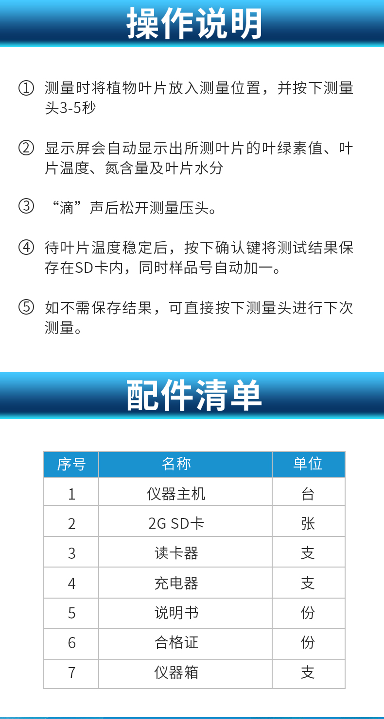 | 測(cè)量范圍:葉綠素:0.0-99.9SPAD | 葉面溫度:-10-99.9℃ | 測(cè)量精度:葉綠素:±1.0 SPAD單位以內(nèi) (室溫下,SPAD值介于0-50) | 葉面溫度:±0.5℃ | 重 復(fù) 性:葉綠素:±0.3 SPAD單位以內(nèi) (SPAD值介于0-50) | 葉面溫度:±0.2℃ | 測(cè)量面積:2mm*2mm | 測(cè)量時(shí)間間隔:小于3秒 | 數(shù)據(jù)存儲(chǔ)容量:16G | 電源:4.2V可充電鋰電池 | 電池容量:2000mah | 重量:200g | 工作及存儲(chǔ)環(huán)境:-10℃~50℃ ≤85%相對(duì)濕度 |