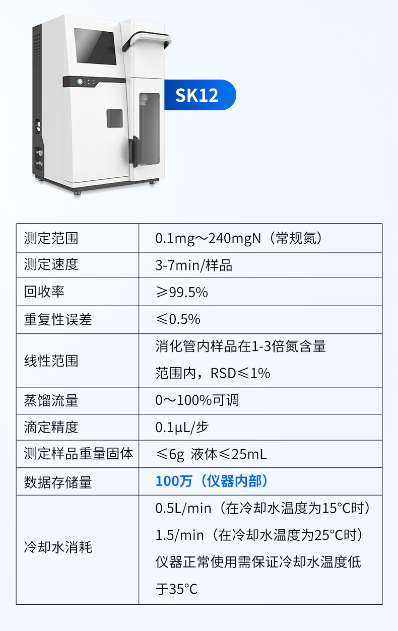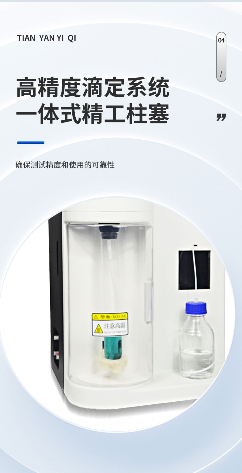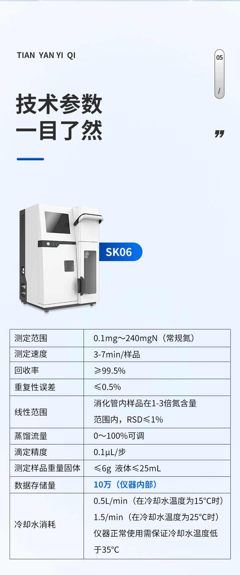 | 1. 采用國家標(biāo)準(zhǔn)的凱氏定氮方法,濃硫酸環(huán)境消解樣品、堿性環(huán)境蒸汽蒸餾、硼酸吸收、指示劑滴定終點(diǎn)顏色判斷法。并參與國家標(biāo)準(zhǔn)GB/T22923-2008、官方JJF109-2012《定氮儀校準(zhǔn)規(guī)范》的起草; | 1. ☆全自動(dòng)添加試劑、全自動(dòng)蒸餾滴定、滴定杯全自動(dòng)排廢清洗、全自動(dòng)校正、全自動(dòng)故障檢測(cè)、全自動(dòng)溶液液位監(jiān)測(cè)、全自動(dòng)計(jì)算、數(shù)據(jù)存儲(chǔ)、測(cè)試報(bào)告生成; | 2. 彩色液晶觸摸屏,蒸餾時(shí)間與試劑添加通過屏幕設(shè)定,條件可自動(dòng)保存; | 3. 滴定顏色可自動(dòng)與手動(dòng)校準(zhǔn)。滴定終點(diǎn)判定采用高精度的十六位三基色數(shù)字信號(hào)顏色傳感器采集顏色信號(hào)。 | 4. 2.0μL的高精度滴定系統(tǒng),專業(yè)的一體式精工柱塞。確保測(cè)試精度和使用的可靠性。 | 5. 彩色液晶觸摸屏,中英文操作界面可選,實(shí)時(shí)監(jiān)測(cè)和顯示實(shí)驗(yàn)過程,條件可自動(dòng)保存; | 6. 可存儲(chǔ)完整的測(cè)試數(shù)據(jù)1000組; | 7. 全自動(dòng)故障檢測(cè)和提示:安全門、消化管到位監(jiān)測(cè)和提示,試劑液位監(jiān)測(cè)和提示,蒸汽爐液位和溫度檢測(cè)和提示; | 8. 采用成熟穩(wěn)定的蒸汽發(fā)生器技術(shù),自動(dòng)預(yù)熱、補(bǔ)水,自動(dòng)控制蒸汽壓力,自動(dòng)防干燒,自動(dòng)清洗; | 9. 自動(dòng)控制蒸汽壓力在安全范圍之內(nèi),遠(yuǎn)離蒸汽過壓危險(xiǎn); | 10.雙蒸餾模式,手動(dòng)與自動(dòng)任意切換; | 11.☆堿泵采用高可靠的聚四氟乙烯風(fēng)箱泵,專用防腐蝕,耐顆粒堵塞,加液穩(wěn)定,負(fù)壓抽吸無危險(xiǎn); | 12.節(jié)水設(shè)計(jì),冷卻水流量1.5L/min, 冷卻水只在蒸餾過程開啟,冷卻水流量實(shí)時(shí)監(jiān)控,低水壓報(bào)警顯示,停水自動(dòng)終止運(yùn)行; | 13.貼合氨逸出規(guī)律特殊設(shè)計(jì)的蒸餾系統(tǒng),確保高可靠的測(cè)試回收率; | 14.消化管周邊設(shè)施智能化設(shè)計(jì),透明亞克力保護(hù)罩,將危險(xiǎn)徹底隔離; | 15.蒸汽發(fā)生器具有壓力傳感器、溫度傳感器、溫度保護(hù)開關(guān)、水位雙重檢測(cè)等多重保護(hù); | 16.儀器具備自檢功能、具備一鍵重置。 | 17.☆試劑桶液位監(jiān)測(cè),保證實(shí)驗(yàn)過程不出現(xiàn)缺液?jiǎn)栴}。 | 18.☆高分子材料防濺瓶設(shè)計(jì)。 |