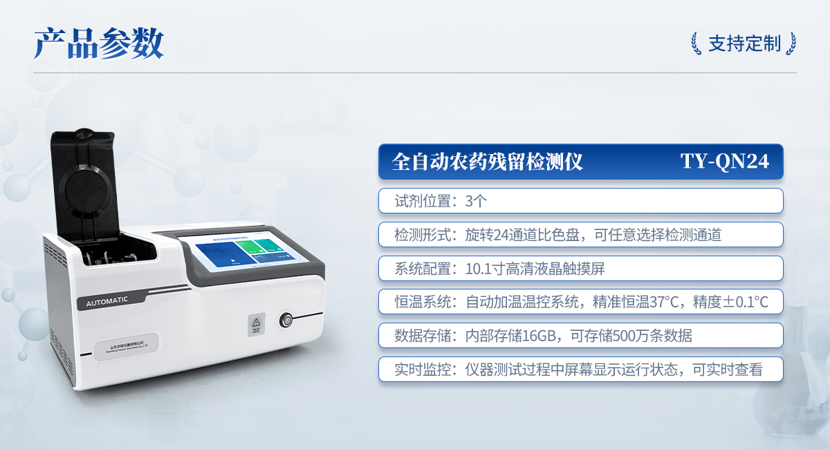 產(chǎn)品介紹: 全自動農(nóng)藥殘留檢測儀是依據(jù)國家標準方法(GB/T5009.199-2003),采用酶抑制率比色法對水果、蔬菜等農(nóng)產(chǎn)品中有機磷和氨基甲酸酯類農(nóng)藥含量進行快速準確的檢測。該設備廣泛應用于蔬菜批發(fā)市場、超市、商場、食藥監(jiān)等部門的蔬菜和水果中的農(nóng)藥殘留檢測。 儀器主要包括光源校準、系統(tǒng)設置、