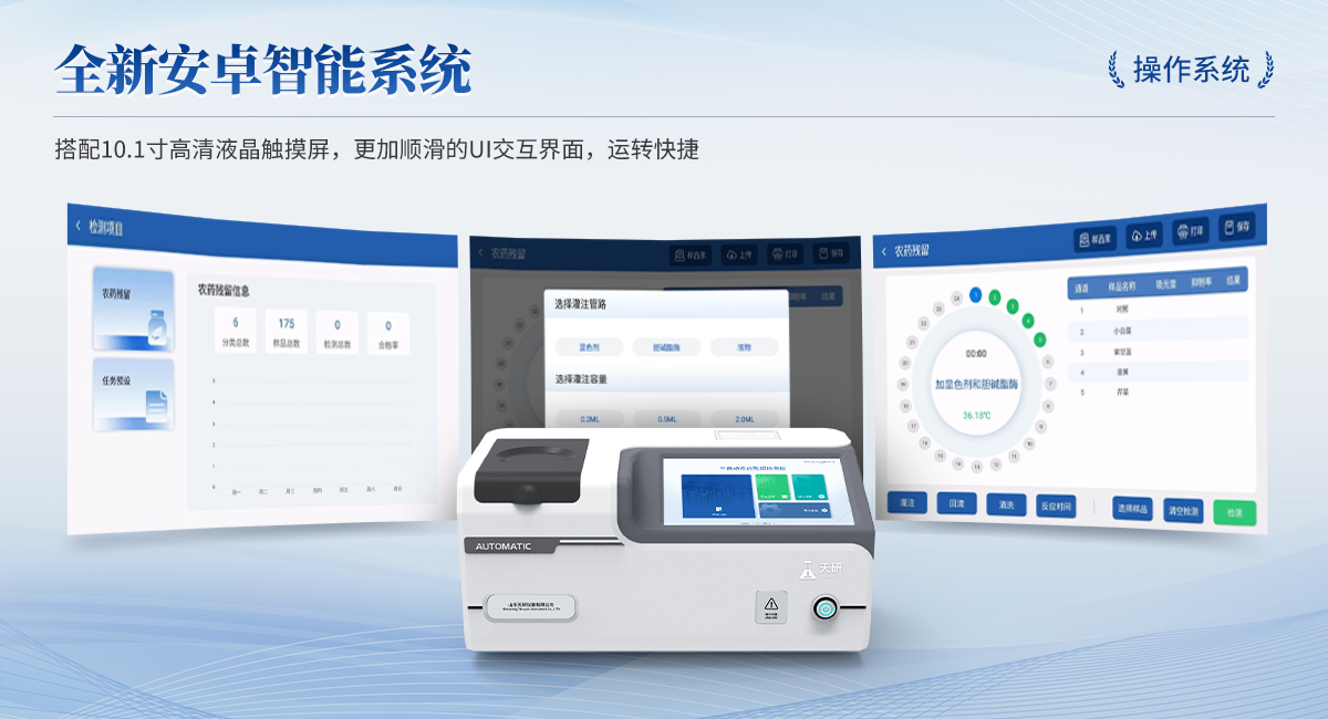 | 1. 試劑位置:3個 | 2. 檢測形式:旋轉24通道比色盤,可任意選擇檢測通道,自動對應選擇通道。 | 3. 系統(tǒng)配置:10.1寸高清液晶觸摸屏,采用ARM Cortex?-A7,RK3288/4核處理器,運行內存1GB。Android7.1.1 系統(tǒng)分辨率1280×800。 | 4.恒溫系統(tǒng):具有自動加溫溫控系統(tǒng),精準恒溫37℃,精度±0.1℃。 | 5.添加系統(tǒng):儀器按照試劑要求自動、按時、按量加入試劑,并且自動對未正常放置的樣本或異常的樣本進行檢查并提示。 | 6.清洗功能:儀器具備回流及自動清洗管路功能,避免試劑污染。 | 7.混勻功能:設備具備自動混勻功能。 | 8.光源校準:設備可自動校準,確保檢測準確度。 | 9.實時監(jiān)控:儀器測試過程中屏幕顯示運行狀態(tài),可實時查看。 | 10.數(shù)據(jù)存儲:內部存儲16GB,可存儲500萬條數(shù)據(jù)。 | 11.樣品多選功能:設備具備樣品一鍵多選功能,選擇樣品自動匹配檢測通道。 | 12.項目預設:可提前設置單個及多個相同或不相同的檢測任務,可單次或者多次調取,減少檢測時間。 | 13.自定義打印系統(tǒng):內置自定義打印系統(tǒng),可按需靈活設置開啟或關閉:產(chǎn)品合格證(國家農(nóng)業(yè)部標準),二維碼,抽樣信息、檢測信息,受檢信息等信息的打印。 | 14.A4版本報告打印功能:設備可自動生成A4版報告,A4報告帶二維碼,可掃描二維碼生成電子版,并可識別真?zhèn)巍?/td> | 15.傳輸方式:儀器配備無線通信模塊: 4G(APN)通訊模塊、Wifi模塊,藍牙傳輸模塊,同時具有USB接口以及RJ45接口能以多種方式實現(xiàn)數(shù)據(jù)保存和數(shù)據(jù)傳輸功能,設備數(shù)據(jù)可以同步上傳至平臺。 | 16.數(shù)據(jù)監(jiān)管系統(tǒng):設備自帶監(jiān)管平臺,并可同步對接監(jiān)管平臺,數(shù)據(jù)可局域網(wǎng)和互聯(lián)網(wǎng)數(shù)據(jù)上傳,檢測結果可直接傳至食品安全監(jiān)管平臺。達到食品安全問題預估、預警。 | 17.系統(tǒng)遠程更新功能:無需設備返廠,即可遠程實時升級全新系統(tǒng),節(jié)省時間成本及避免運輸造成設備損。 |