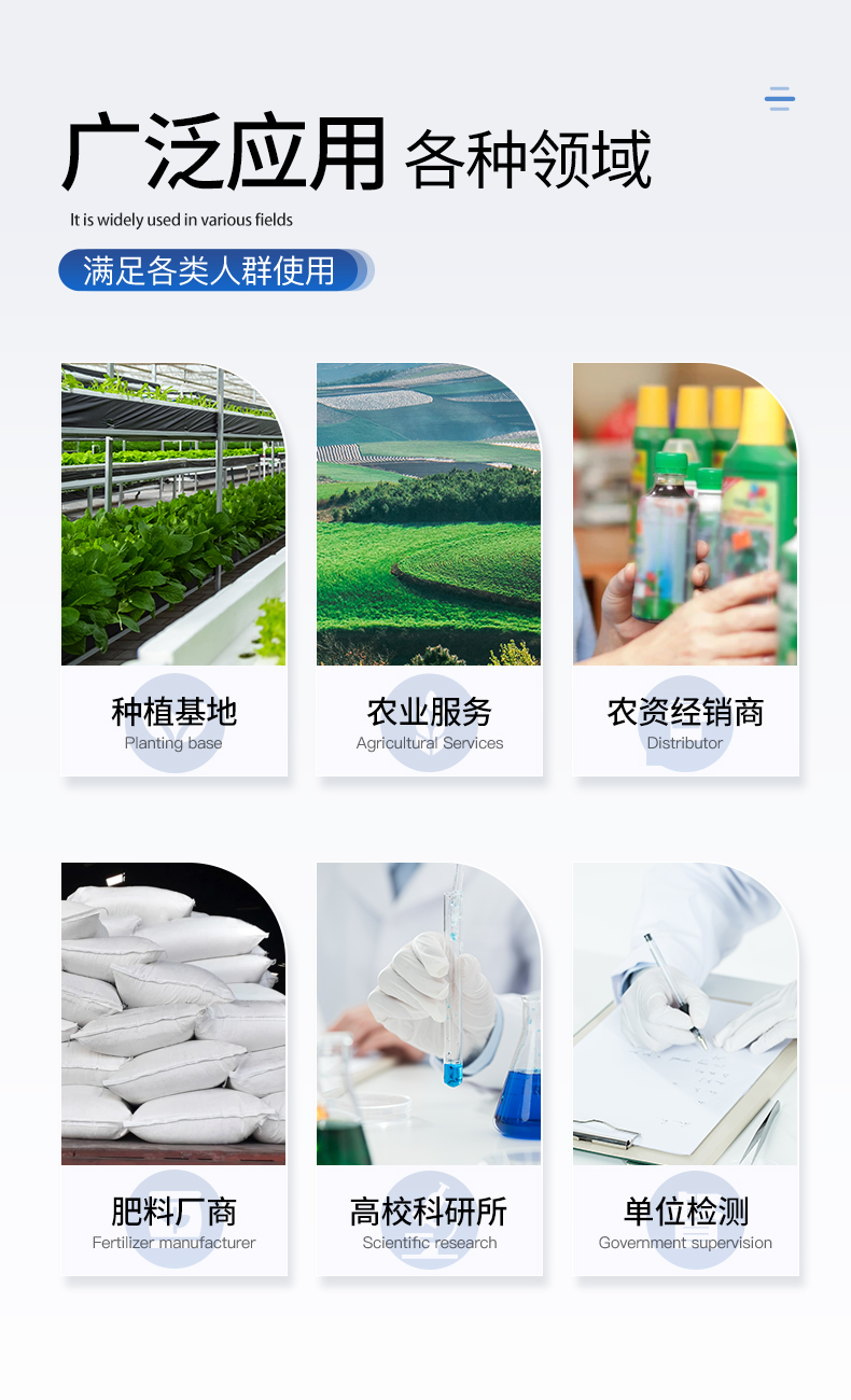 ●單質(zhì)肥:氮肥中銨態(tài)氮、肥料硝態(tài)氮、尿素氮、縮二脲、磷肥中磷、磷肥中水溶性磷、鉀肥中鉀; ●復(fù)合肥全氮、復(fù)合肥全磷、復(fù)合肥全鉀; ●有機肥全氮、有機肥全磷、有機肥全鉀、有機肥硝態(tài)氮、有機肥速效磷、有機肥速效鉀、有機肥酸解氮、有機質(zhì); ●水溶性腐植酸(風(fēng)化煤)、水溶性腐植酸(褐煤)、水溶性腐植酸(泥炭)、游離態(tài)腐植酸(風(fēng)化煤)、游離態(tài)腐植酸(褐煤)、游離態(tài)腐植酸(泥炭); ●水溶肥全氮、水溶肥全磷、水溶肥全鉀; ●葉面肥全氮、葉面肥全磷、葉面肥全鉀; ●各種肥料微量元素:肥料鈣、肥料鎂、肥料硫、肥料硅、肥料硼、肥料鐵、肥料銅、肥料錳、肥料鋅、肥料氯、肥料鉬; ●肥料重金屬:肥料鉛、肥料砷、肥料鎘、肥料鉻、肥料汞、肥料鎳、肥料鋁、肥料氟、肥料鈦、肥料硒。 |