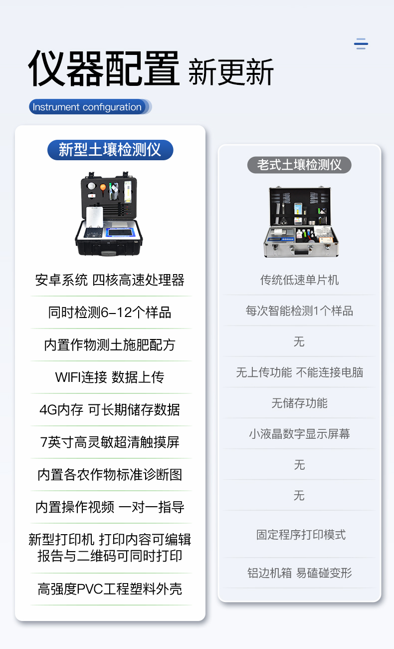 | 1、Android安卓智能操作系統(tǒng),主控芯片采用ARM Cortex-A7,RK3288/4核處理器,主頻1.88Ghz,運轉(zhuǎn)速度更快速,穩(wěn)定性更強。 | 2、采用精密旋轉(zhuǎn)比色池設(shè)計(**號:ZL 2018 2 1777724.7),光源一致性更加**,保證檢測精度。 | 3、8個旋轉(zhuǎn)檢測通道,一次性可快速檢測8個樣品,極大提升檢測效率,降低檢測成本。 | 4、采用高精度濾光片技術(shù)自主**分析方法(**號:ZL 2020 2 1763837.9),**認(rèn)證。 | 5、檢測過程中內(nèi)置校準(zhǔn)功能,智能恒流穩(wěn)壓,光強自動校準(zhǔn),確保檢測準(zhǔn)確度,取得中國計量科學(xué)研究院的《校準(zhǔn)證書》。 | 6、儀器標(biāo)配wifi無線上傳、4G聯(lián)網(wǎng)傳輸、GPRS無線遠(yuǎn)傳功能,快速上傳數(shù)據(jù)。 | 7、配有智慧云農(nóng)業(yè)平臺,儀器連入無線網(wǎng)絡(luò)后,可將檢測數(shù)據(jù)可選擇性或批量無線上傳,方便用戶進(jìn)行長期數(shù)據(jù)管理和可視化分析 | 8、儀器同時具有USB接口、以太網(wǎng)接口,內(nèi)置大容量內(nèi)存,并可隨時用U盤拷貝數(shù)據(jù)。 | 9、可用手機隨時登錄云平臺在線移動查看歷史數(shù)據(jù) | 10、內(nèi)置作物專家施肥系統(tǒng),可對百余種全國農(nóng)業(yè)經(jīng)濟作物、果樹等的目標(biāo)產(chǎn)量計算推薦施肥量,依據(jù)施肥配方科學(xué)指導(dǎo)農(nóng)業(yè)生產(chǎn)。測土配方施肥結(jié)果可打印,打印內(nèi)容包含:作物種類、肥料種類、目標(biāo)產(chǎn)量、需求總量、建議施肥方案。 | 11、內(nèi)置植物營養(yǎng)診斷標(biāo)準(zhǔn)圖譜,根據(jù)各農(nóng)作物營養(yǎng)缺失的圖片,進(jìn)行葉面對比,診斷豐缺。 | 12、4波長專業(yè)測試?yán)涔庠矗t、藍(lán)、綠、橙),光源波長穩(wěn)定,長時間連續(xù)工作光源無溫漂現(xiàn)象,壽命長達(dá)10萬小時級別,重現(xiàn)性好,準(zhǔn)確度高。 | 13、比色池部分采用標(biāo)準(zhǔn)1cm比色皿,無機械位移及磨損,光路測試定位**,有效屏蔽外光干擾,保證檢測結(jié)果優(yōu)于國標(biāo)要求。 | 14、儀器系統(tǒng)內(nèi)帶有樣品前處理操作視頻,各種樣品檢測方法點擊視頻模塊即可觀看,檢測人員無需自學(xué)說明書,指導(dǎo)教學(xué)方便快速,方便新手快速操作。 | 15、內(nèi)置新一代高速熱敏打印機(無需色帶),打印內(nèi)容包含:檢測單位、檢測人員、檢測項目、通道號、吸光度、養(yǎng)分含量(mg/kg)、檢測時間、以及二維碼等信息 | 16、高靈敏7寸真彩觸摸屏,采用更加**和人性化操作,高清晰高交互顯示,大程度降低傳統(tǒng)儀器的繁瑣操作和失誤,并取得多項《軟件著作權(quán)》。 | 17、內(nèi)置時鐘功能,方便操作時間記錄,長期歷史追溯。 | 18、可設(shè)置多賬戶賬號密碼登錄,**UI交互界面,不同的用戶可自由添加編輯檢測信息,保存后可長期使用。 | 19、GPS功能:可在野外作業(yè)時記錄經(jīng)緯度地點,滿足特殊用戶需求。 | 20、內(nèi)置低電壓提示功能,可在檢測時明確電量,避免測試數(shù)據(jù)偏移,同時具有斷電保護(hù)功能,斷電自動保存數(shù)據(jù),防止數(shù)據(jù)丟失。 | 21、交直流兩用供電方式,內(nèi)置大容量充電鋰電池,滿電狀態(tài)下可連續(xù)工作10余小時,同時可外接車載電源蓄電。 | 22、儀器具有中英文切換功能,可滿足出口要求。 | 23、高強度PVC工程塑料手提箱設(shè)計,堅固耐用,便于攜帶。 |