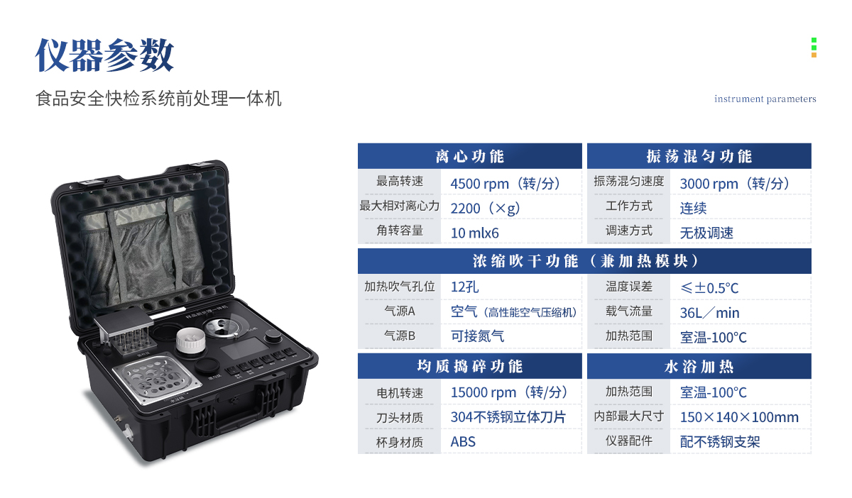 | 離心功能 1.**轉(zhuǎn)速:4500 rpm(轉(zhuǎn)/分) 2.**相對離心力:2200(×g) 3.角轉(zhuǎn)容量:10 mlx6 (可選配20mlx6) | 振蕩混勻功能 1.振蕩混勻速度:3000 rpm(轉(zhuǎn)/分) 2.工作方式:連續(xù) 3.調(diào)速方式:無極調(diào)速 | 均質(zhì)搗碎功能 1.電機轉(zhuǎn)速:15000 rpm(轉(zhuǎn)/分) 2.刀頭材質(zhì):304不銹鋼立體刀片 3.杯身材質(zhì):ABS | 濃縮吹干功能(兼加熱模塊) 1.加熱吹氣孔位: 12孔 2.氣源A: 空氣(高性能空氣壓縮機) 氣源B: 可接氮氣 3.溫度誤差:≤±0.5℃ 4.載氣流量:36L/min 5.加熱范圍:室溫-100℃ | 水浴加熱 1.加熱范圍:室溫-100℃ 2.內(nèi)部**尺寸:150mmX140mmX100mm 3.配不銹鋼支架 |