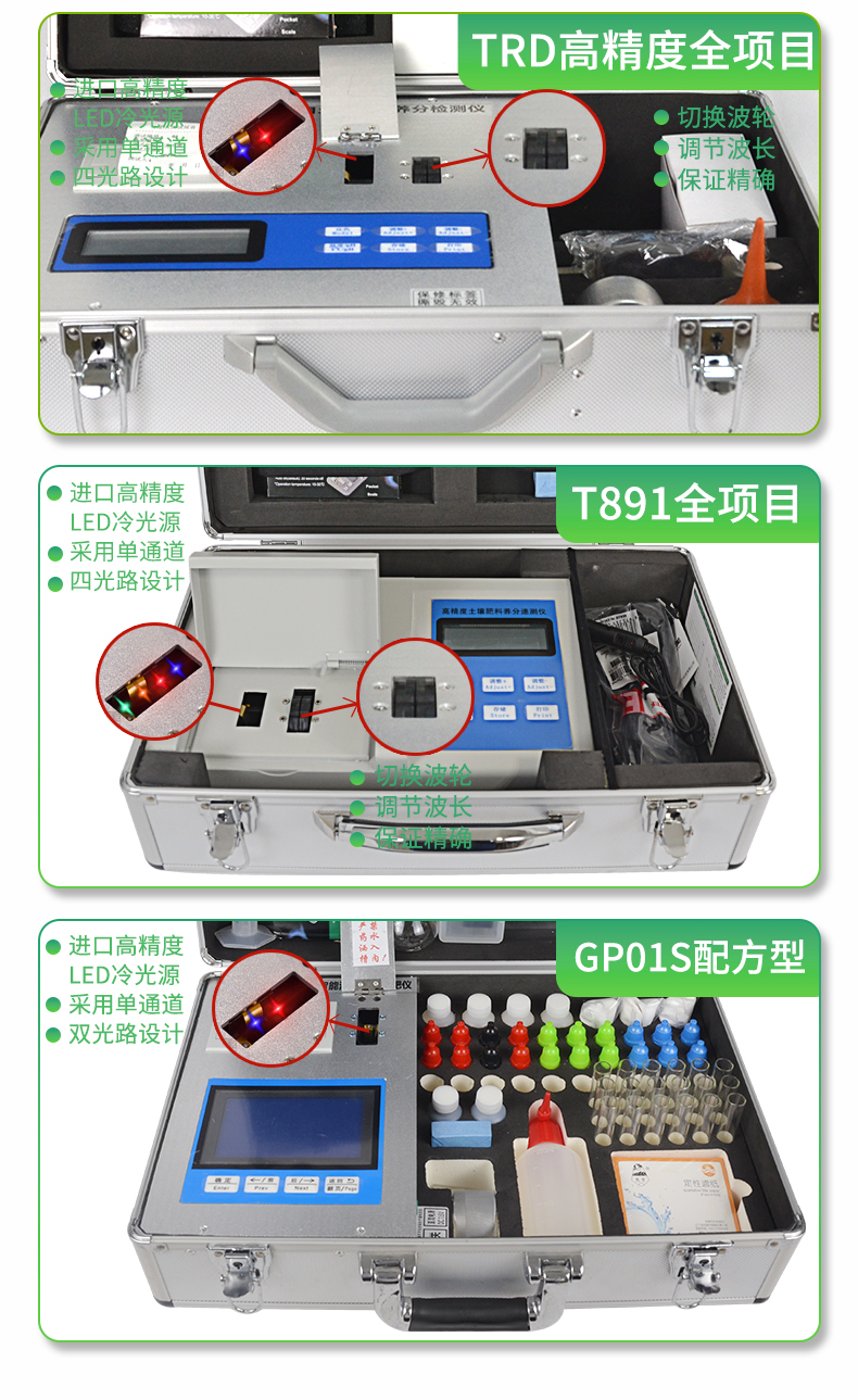 | 配套齊全:該儀器集藥、器、儀為一體,攜帶方便,相當于一個小型實驗室。適于農業(yè)服務部門或農資經(jīng)銷商、肥料廠商測土施肥和鑒別肥料真假。 | 操作簡便、速度快捷,成品藥劑開瓶即用,無須配置。 | 性能可靠:工作穩(wěn)定性優(yōu)于國家標準JJG179-90指標的6倍,重復性達到光柵型分光光度計指標水平。 |