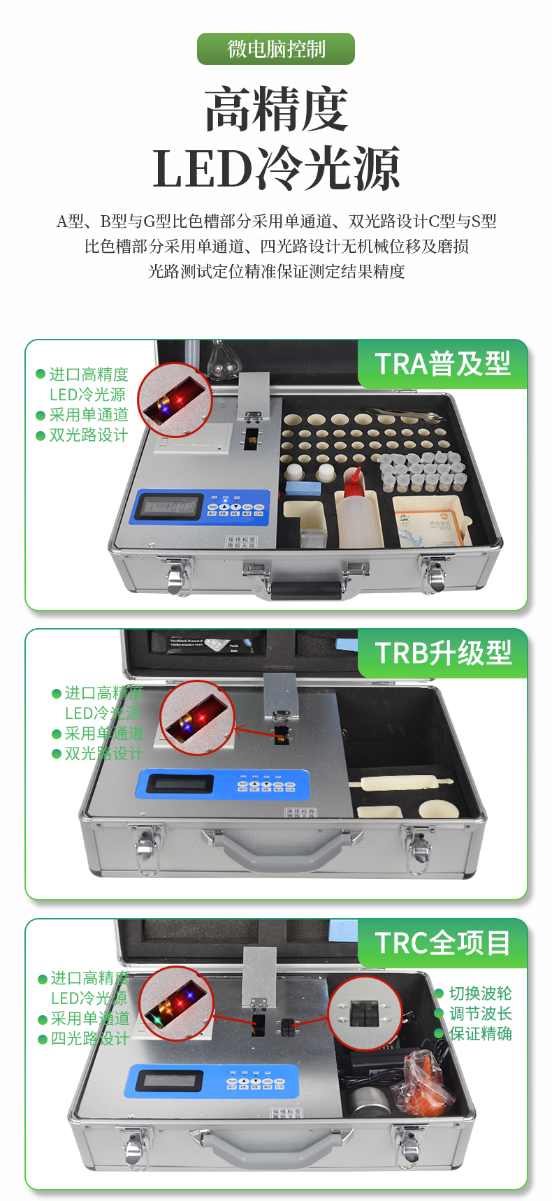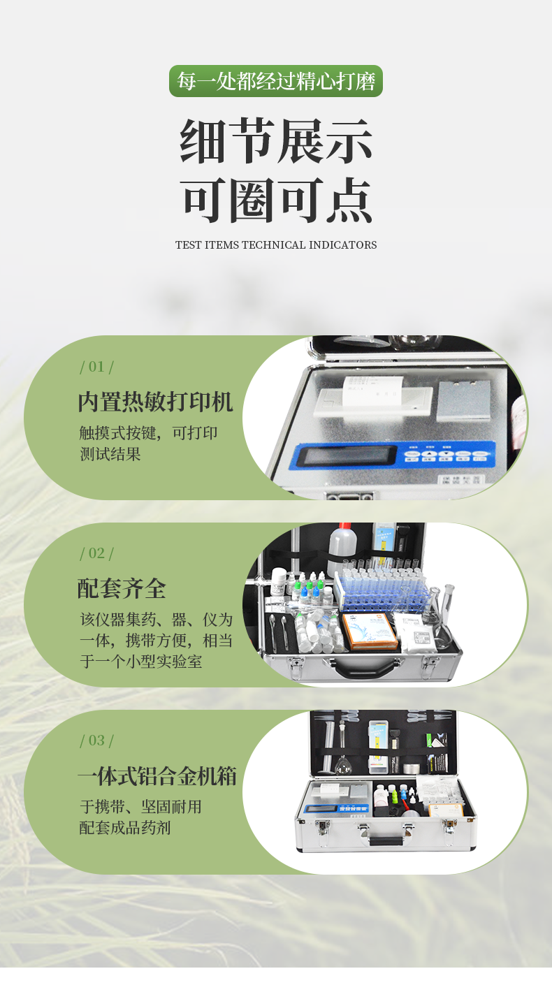 | ★《機箱/藥劑一體式鋁合金機箱》設計,便于攜帶、堅固耐用,配套檢測方法及成品藥劑。 | ★微電腦控制,數(shù)字化線路、程序化設計,液晶顯示,交直流兩用,測試數(shù)據(jù)可存儲查詢,可野外流動測試,大程度降低操作者的失誤和勞動強度。 | ★分辨率:0.001,觸摸式按鍵,內(nèi)置新型熱敏打印機,可打印測試結果。 | ★全項目土壤肥料養(yǎng)分速測儀可檢測土壤及化肥、有機肥(含葉面肥、水溶肥、噴施肥等)、植株中的速效氮、速效磷、有效鉀、全氮、全磷、全鉀、有機質、酸堿度,鈣、鎂、硫、鐵、錳、硼、鋅、銅、氯、硅、鉬等各種中微量元素。 | ★采用高亮LED光源,濾光式處理,保證光源波長穩(wěn)定, 硅半導體作為信號接收系統(tǒng), 壽命長達10萬小時級別。光源穩(wěn)定,重現(xiàn)性好,準確度高。 | ★比色槽部分采用單通道設計,無機械位移及磨損,光路測試定位**,保證測定結果精度。 | ★配套專家施肥系統(tǒng)數(shù)據(jù),可對百余種全國農(nóng)業(yè)、果樹、 經(jīng)濟作物的目標產(chǎn)量科學計算推薦施肥量。 |