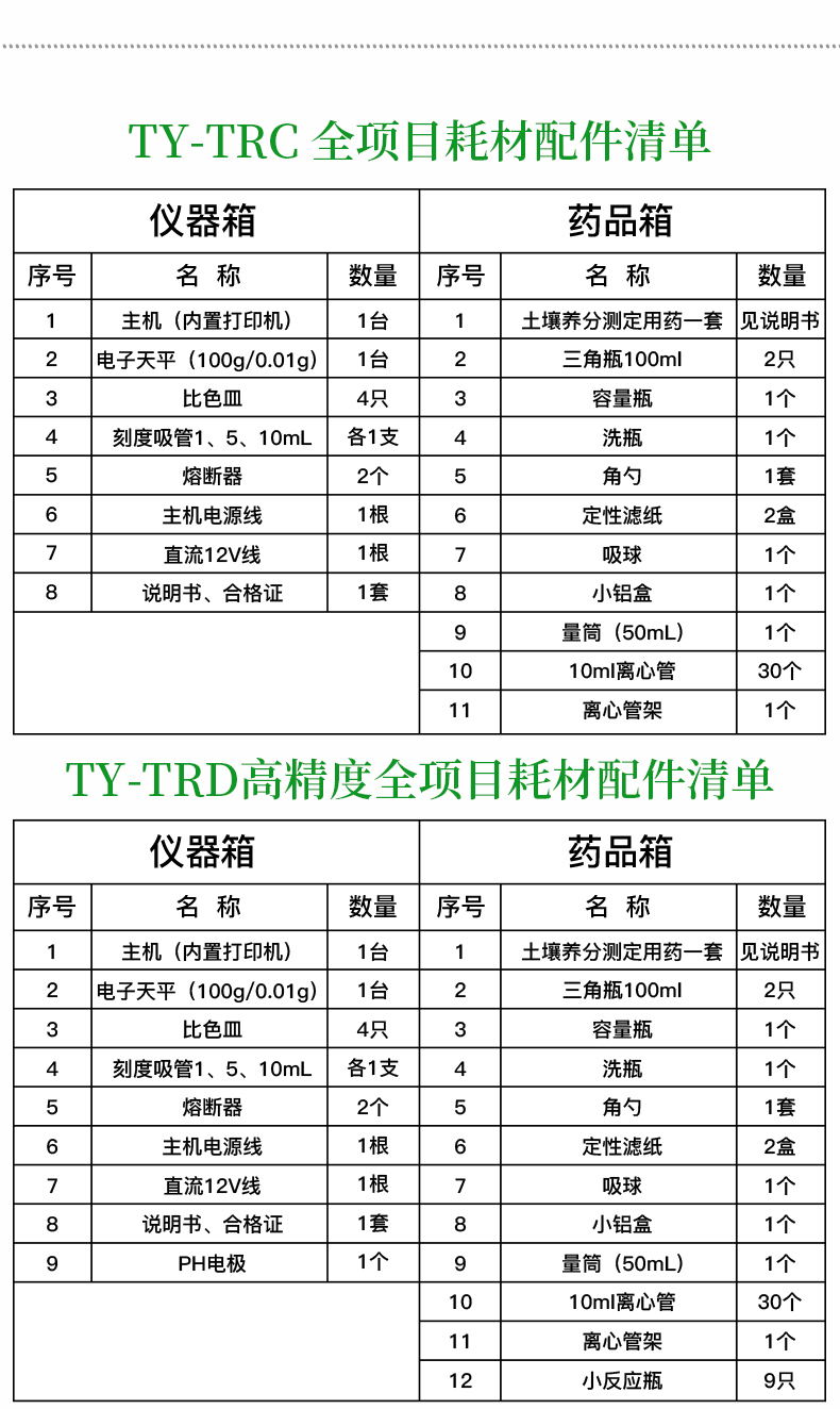 | 藥 品 箱 | 土壤養(yǎng)分測定用藥一套:見說明書 | 三角瓶100ml :2只 | 容量瓶 :1個 | 洗瓶 :1個 | 角勺 :1套 | 定性濾紙 :1盒 | 吸球 :1個 | 小鋁盒 :1個 | 量筒(50mL) :1個 | 10ml離心管 :30個 | 離心管架 :1個 |
