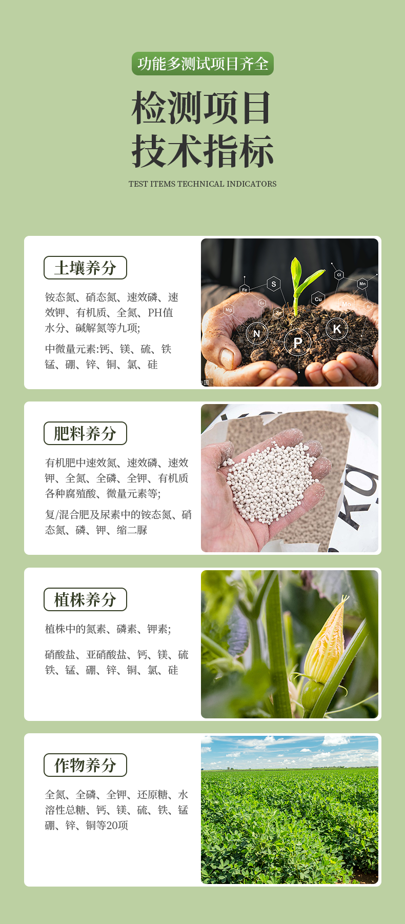 | 肥料養(yǎng)分:● 單質(zhì)化肥中的氮、磷、鉀; ● 復(fù)(混)合肥及尿素中的銨態(tài)氮、磷、鉀; ● 有機肥中速效氮、速效磷、速效鉀、全氮、全磷、全鉀、pH、有機質(zhì)等。 |