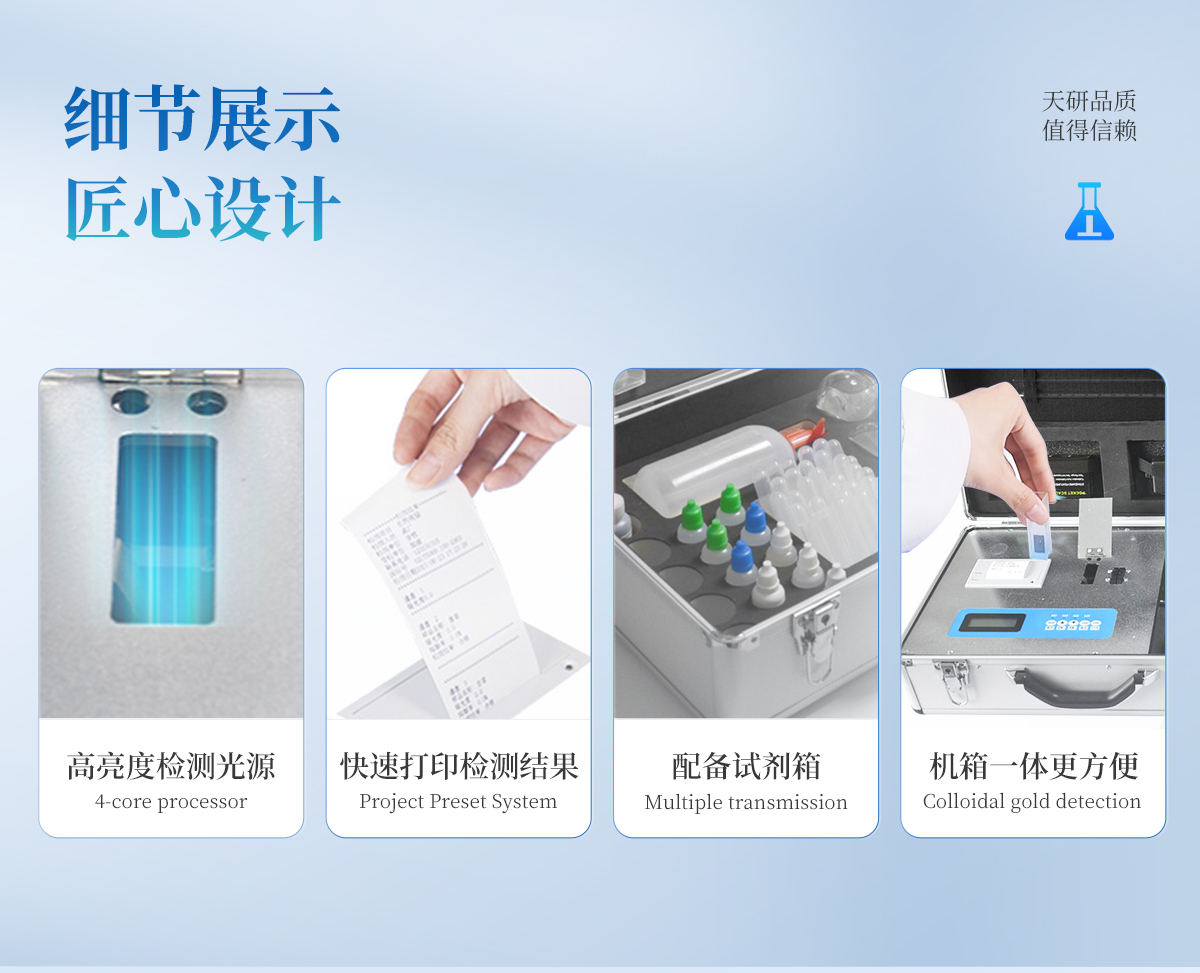 | 全國獨家《機箱/藥劑一體式鋁合金機箱》**設計,便于攜帶、堅固耐用,配套檢測方法及成品藥劑。 | 微電腦控制,數字化線路、程序化設計,液晶顯示,交直流兩用,測試數據可存儲查詢,可野外流動測試,**程度降低操作者的失誤和勞動強度。 | 分辨率:0.001,觸摸式按鍵,內置新一代熱敏打印機,可打印測試結果。 | 復合肥養(yǎng)分含量檢測儀可檢測化肥、有機肥(含葉面肥、水溶肥、噴施肥)生物肥等中的速效氮、速效磷、有效鉀、全氮、全磷、全鉀、有機質、酸堿度,鈣、鎂、硫、鐵、錳、硼、鋅、銅、氯、硅、鉬等各種中微量元素以及鉛、鉻、鎘、汞、砷、鎳、鋁、氟、鈦、硒等各種重金屬含量。 | 采用高亮LED光源,濾光式處理,保證光源波長穩(wěn)定, 硅半導體作為信號接收系統(tǒng), 壽命長達10萬小時級別。光源穩(wěn)定,重現性好,準確度高。 | 比色槽部分采用單通道設計,無機械位移及磨損,光路測試定位**,保證測定結果精度。 |