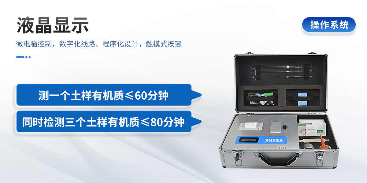 | 配套齊全:土壤有機(jī)質(zhì)速測(cè)儀該儀器集藥、器、儀為一體,攜帶方便,相當(dāng)于一個(gè)小型實(shí)驗(yàn)室。適于農(nóng)業(yè)服務(wù)部門或農(nóng)資經(jīng)銷商、肥料廠商測(cè)土施肥和鑒別肥料真假。 | 操作簡(jiǎn)便、速度快捷,成品藥劑開瓶即用,無須配置。 | 性能可靠:工作穩(wěn)定性優(yōu)于國家標(biāo)準(zhǔn)JJG179-90指標(biāo)的6倍,重復(fù)性達(dá)到光柵型分光光度計(jì)指標(biāo)水平。 |