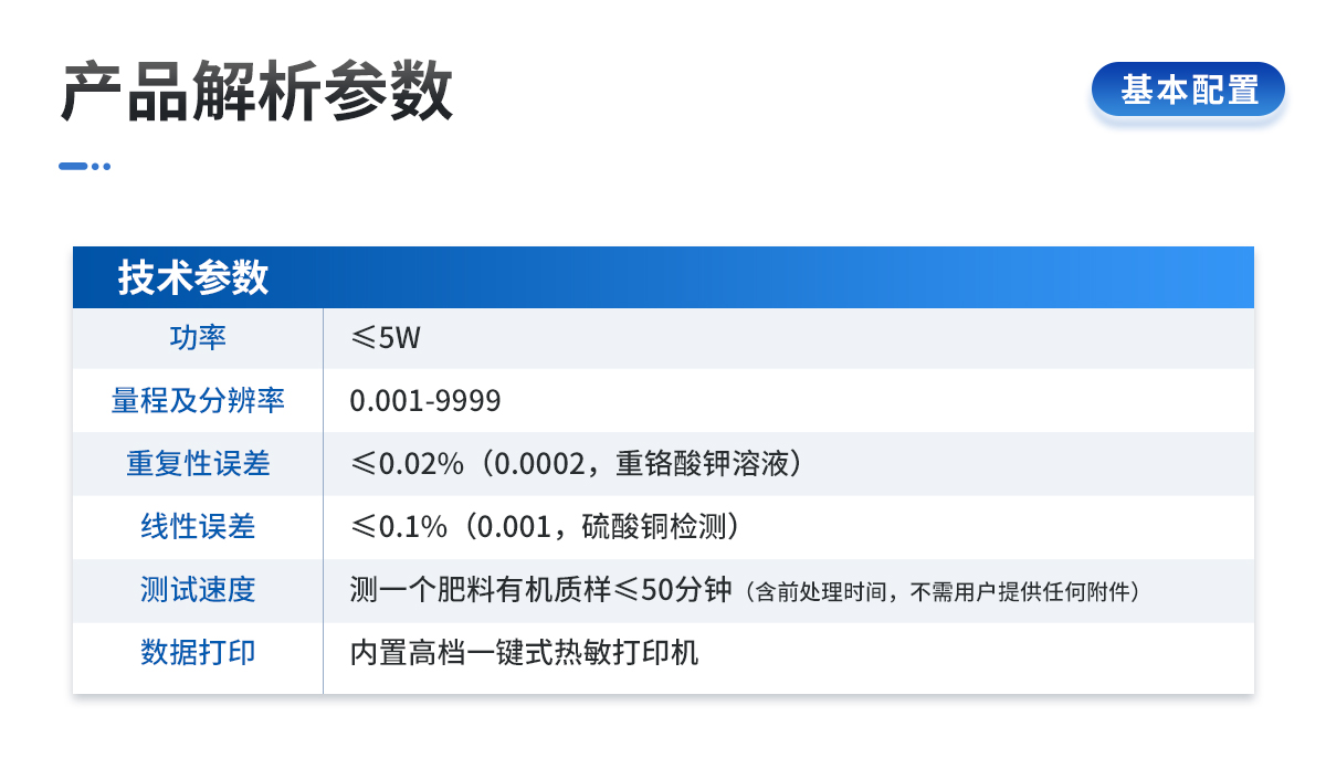 | 電源:交流 220±22V 直流 12V+5V(可用車載電源也可選擇儀器內(nèi)置鋰電池) | 功率: ≤5W | 量程及分辨率:0.001-9999 | 重復(fù)性誤差: ≤0.02%(0.0002,重鉻酸鉀溶液) | 儀器穩(wěn)定性:兩個小時內(nèi)數(shù)字漂移小于0.2%(0.002,透光度測量)。儀器開機預(yù)熱5分鐘后,一個小時內(nèi)顯示數(shù)字無漂移(透光度測量),兩個小時內(nèi)數(shù)字漂移不超過0.2%(0.002,透光度測量)。 | 線性誤差: ≤0.1%(0.001,硫酸銅檢測) | 靈敏度:紅光≥4.5 ×10-5 藍光≥3.17×10-3 綠光≥2.35×10-3 橙光≥2.13×10-3 | 波長范圍 :紅光:680±2nm; 藍光:420±2nm;綠光:510±2nm;橙光:590±10nm | 數(shù)據(jù)打印:內(nèi)置新型一鍵式熱敏打印機 | 預(yù)留232數(shù)據(jù)接口,可與電腦相連進行數(shù)據(jù)傳輸。 | 儀器尺寸:43×34.5×19cm, 主機凈重:5.1kg |