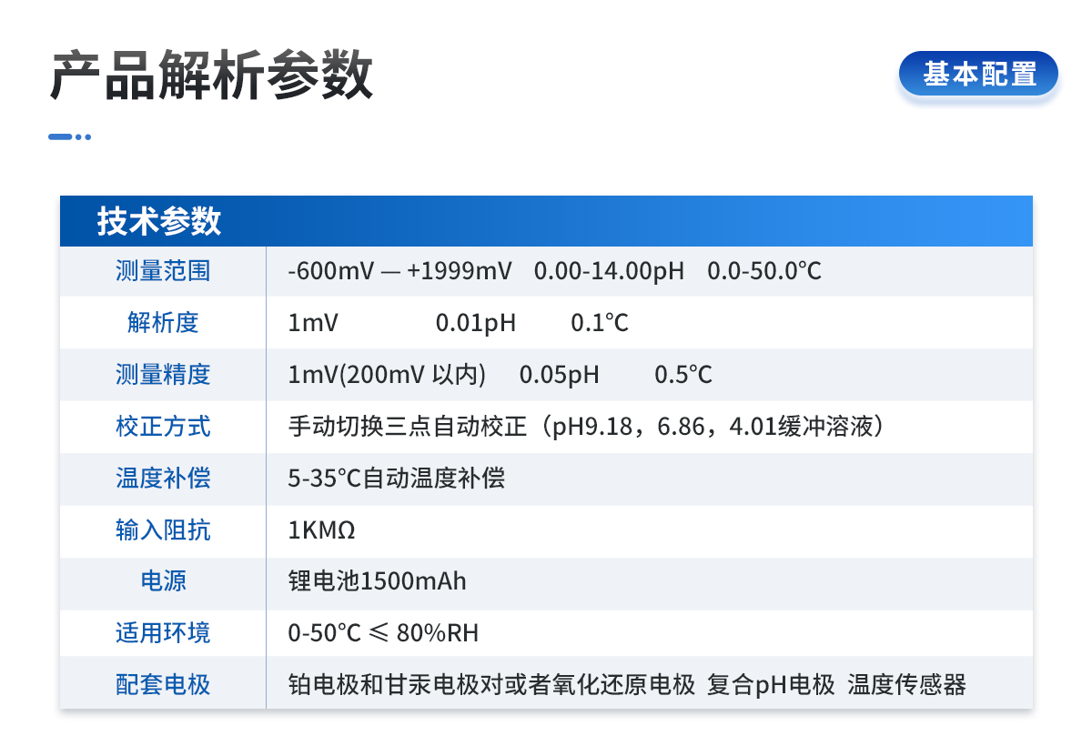 | 測量范圍:-600mV — +1999mV 0.00-14.00pH 0.0-50.0℃ | 解 析 度:1mV 0.01pH 0.1℃ | 測量精度:1mV(200mV 以內(nèi)) 0.05pH 0.5℃ | 校正方式:手動切換三點(diǎn)自動校正(pH9.18,6.86,4.01緩沖溶液) | 溫度補(bǔ)償:5-35℃自動溫度補(bǔ)償 | 輸入阻抗:1KMΩ | 電 源:鋰電池1500mAh | 適用環(huán)境:0-50℃ ≤ 80%RH | 配套電極:鉑電極和甘汞電極對或者氧化還原電極 復(fù)合pH電極 溫度傳感器 | 電 源:4×12V AA電池,連續(xù)工作時間大于20小時 | 測量時間:30-45min | 儀器尺寸:200×85×40 | 重 量:500g |
