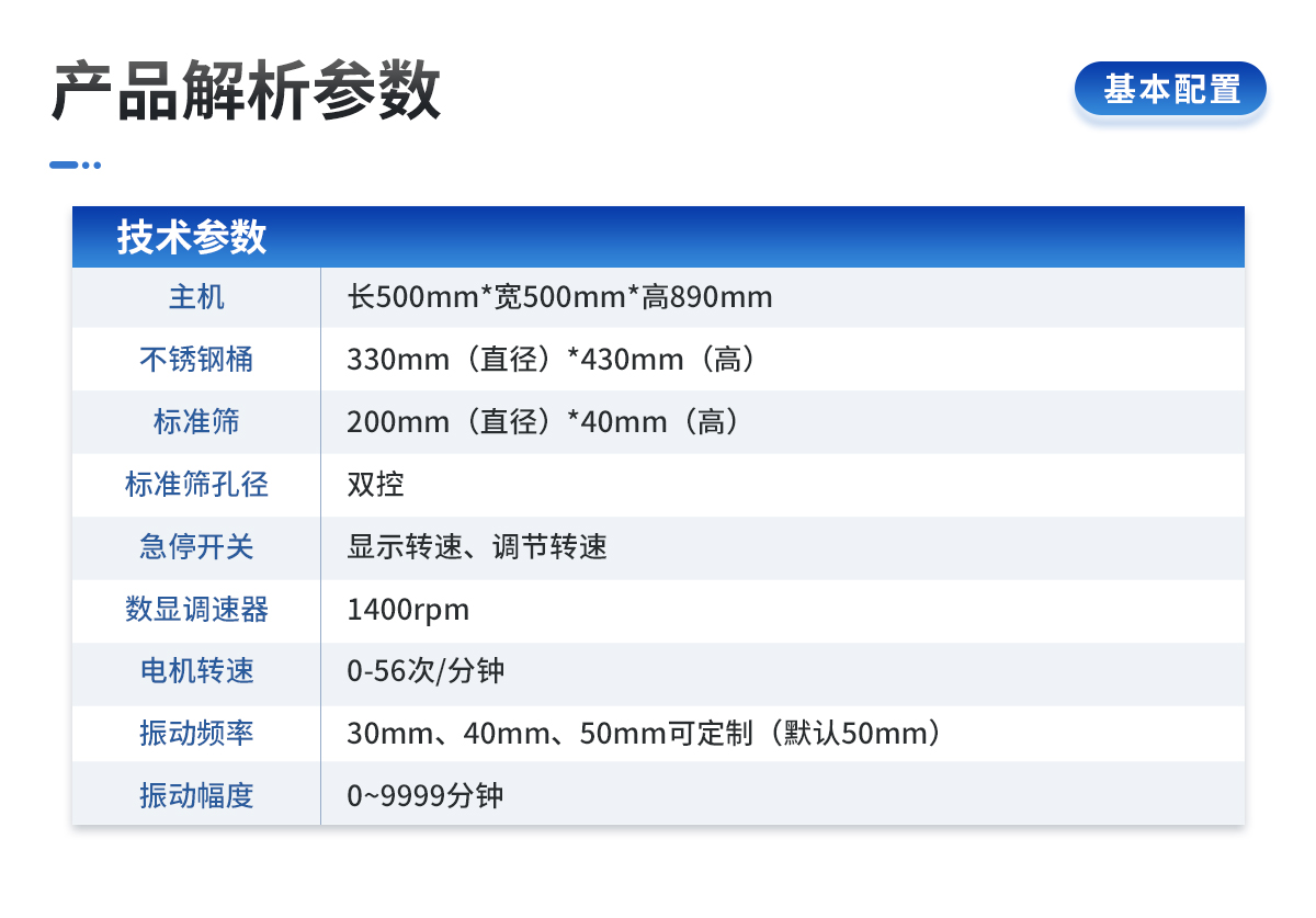 | 1、主機:長500mm*寬500mm*高890mm | 2、水桶:200mm(直徑)*400mm(高) | 3、標(biāo)準(zhǔn)篩:100mm(直徑)*40mm(高) | 4、標(biāo)準(zhǔn)篩孔徑:5mm,3mm,2mm,1mm,0.5mm,0.25mm。(可選配其他規(guī)格孔徑) | 5、急停開關(guān):雙控 | 6、數(shù)顯調(diào)速器:顯示轉(zhuǎn)速、調(diào)節(jié)轉(zhuǎn)速 | 7、電機轉(zhuǎn)速:1400 rpm | 8、振動頻率:0-56次/分鐘 | 9、振動幅度:30mm、40mm、50mm可定制(默認(rèn)50mm) | 10、計時:數(shù)顯計時器 | 11、定時范圍:0~9999分鐘 | 12、電源:220V 50Hz 120W | 13、漏電保護器:10A |